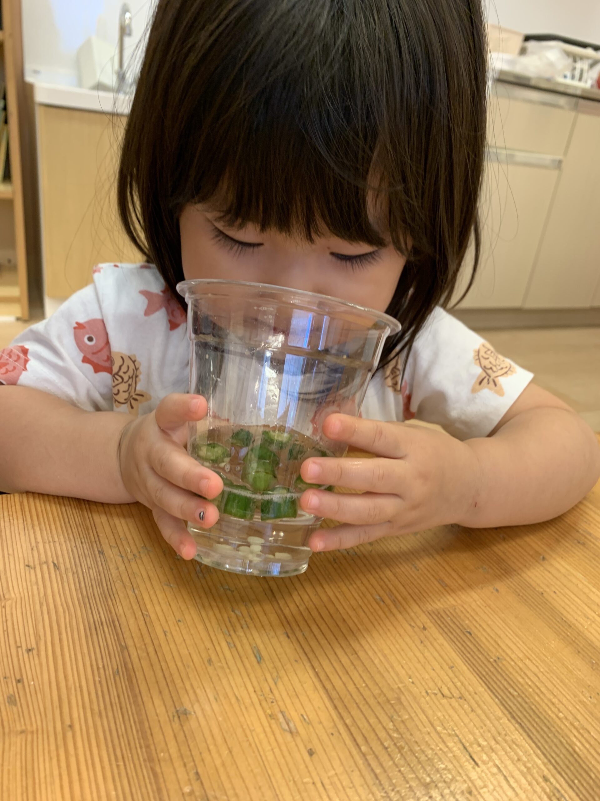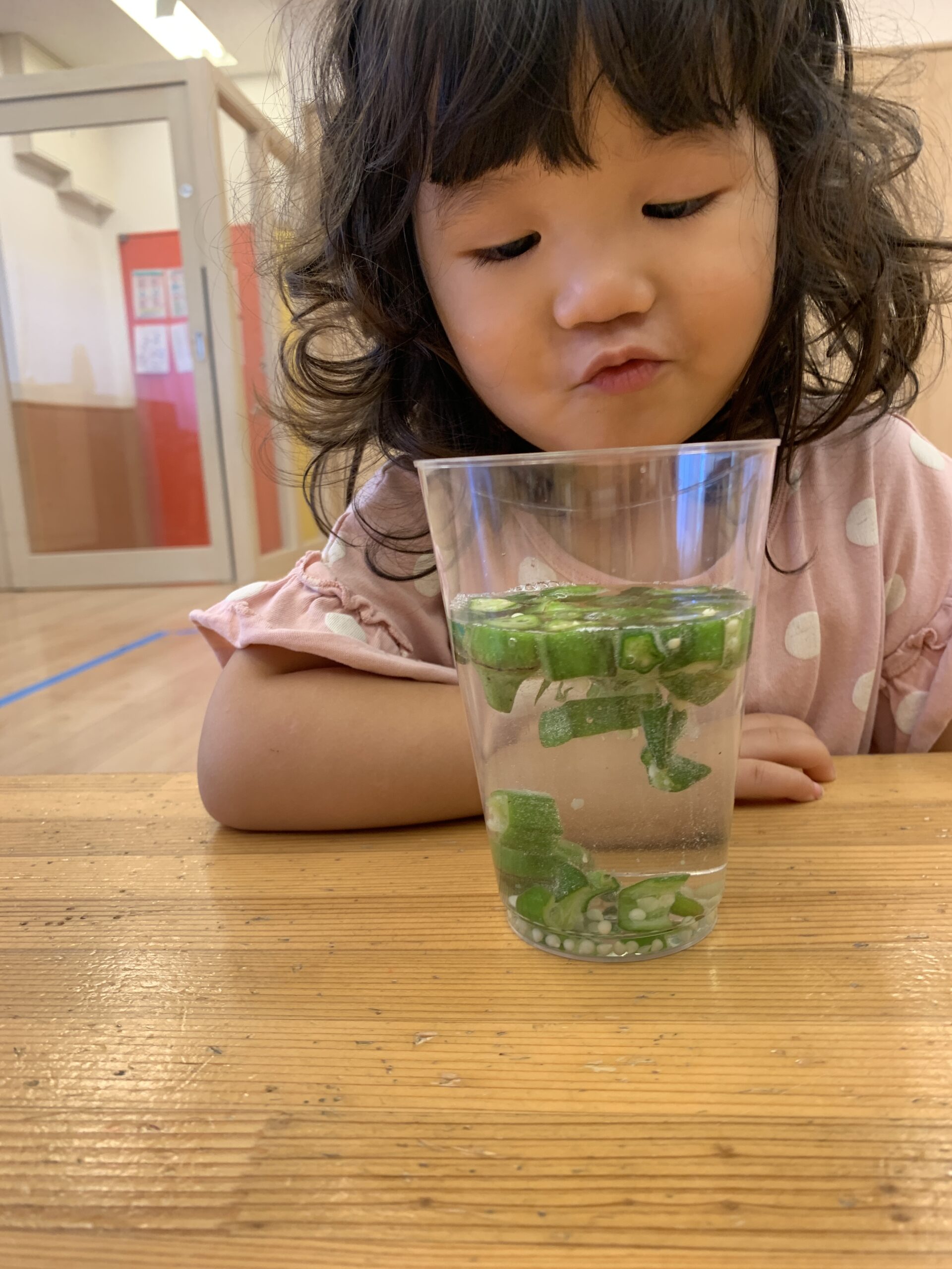 透明な水にオクラの種を入れると「わあ、浮いてる!」と観察。