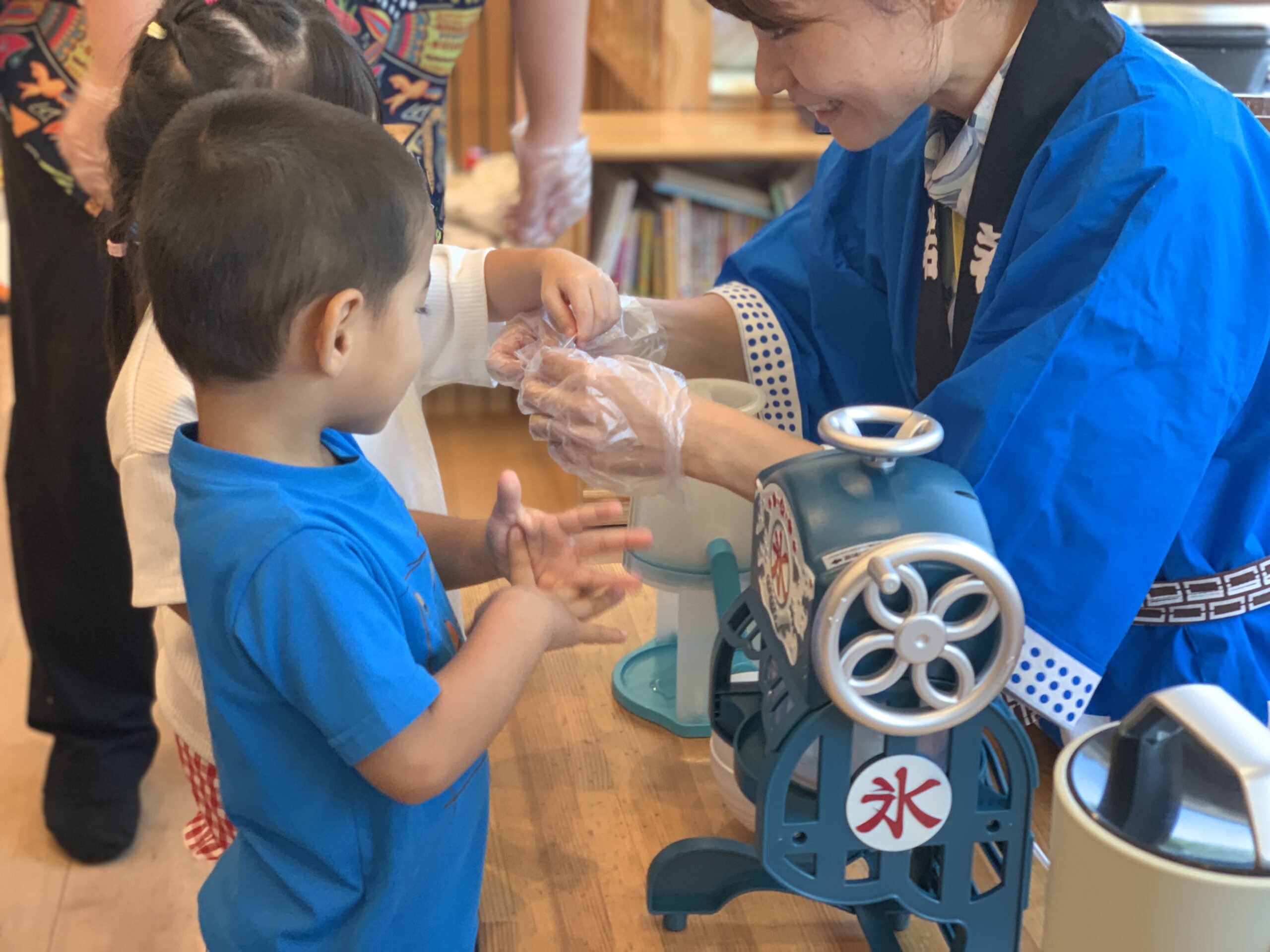 「みんなでかき氷つくるよ!」の先生の声かけに「やったー!」と歓声があがり、