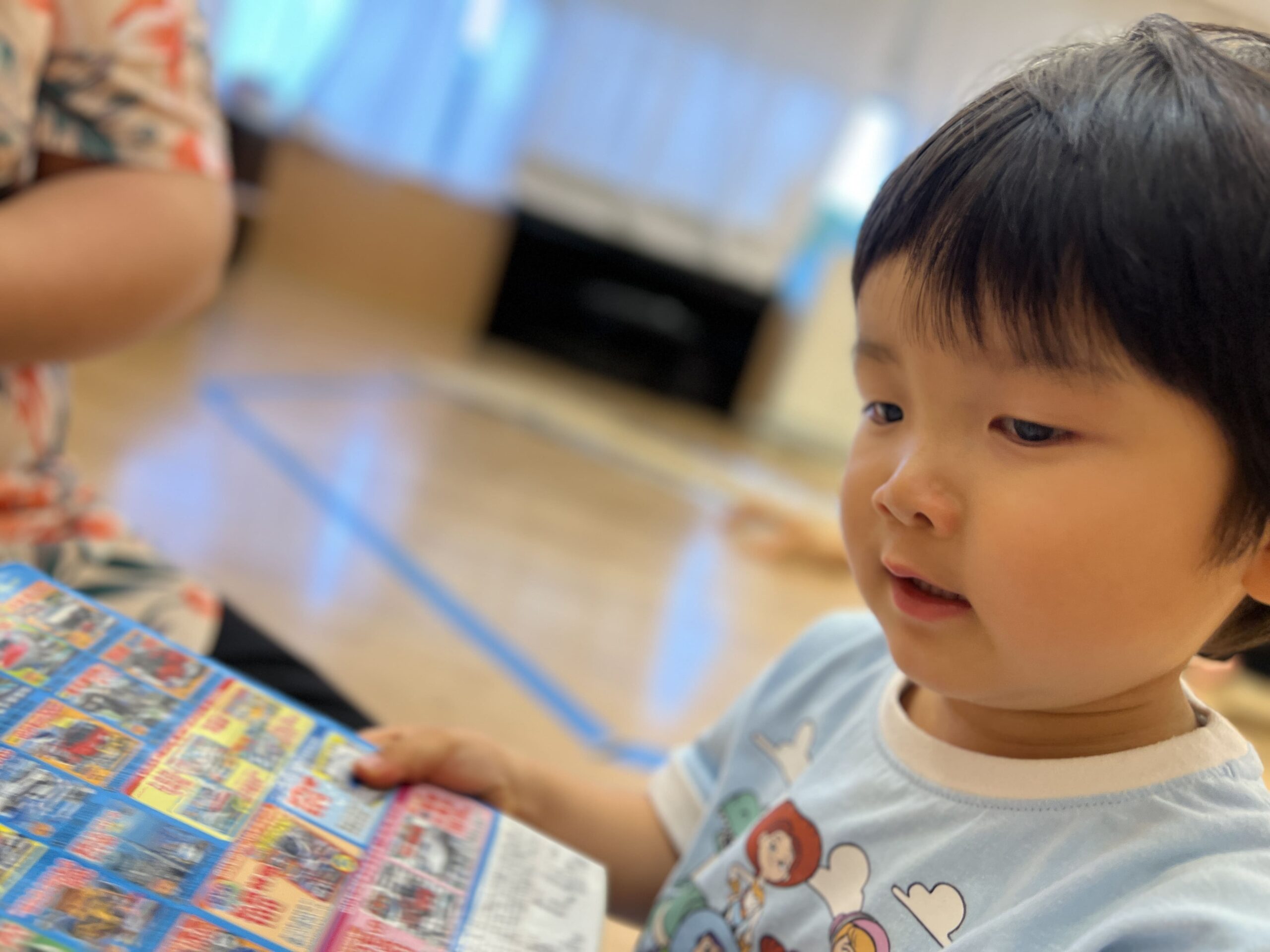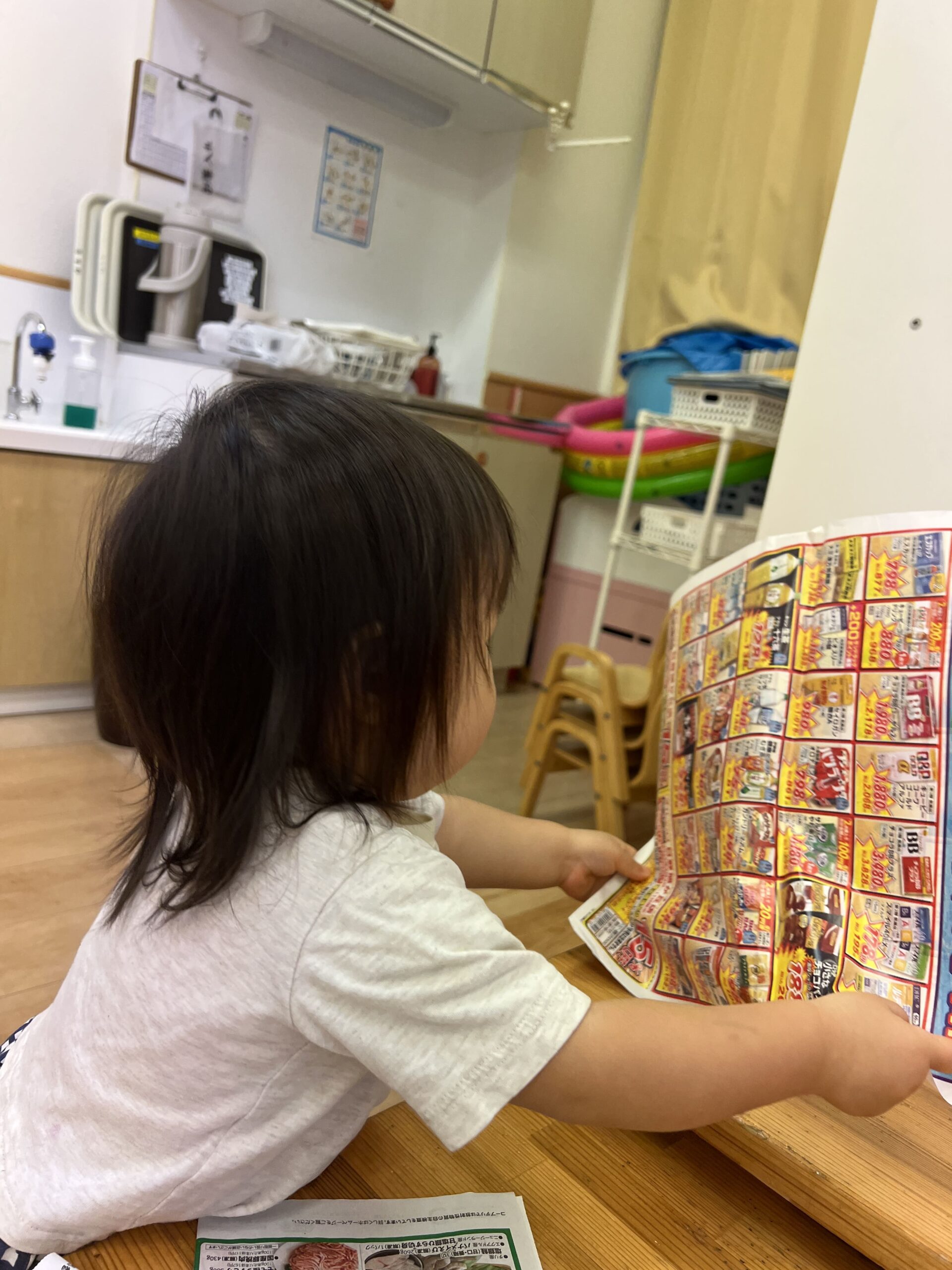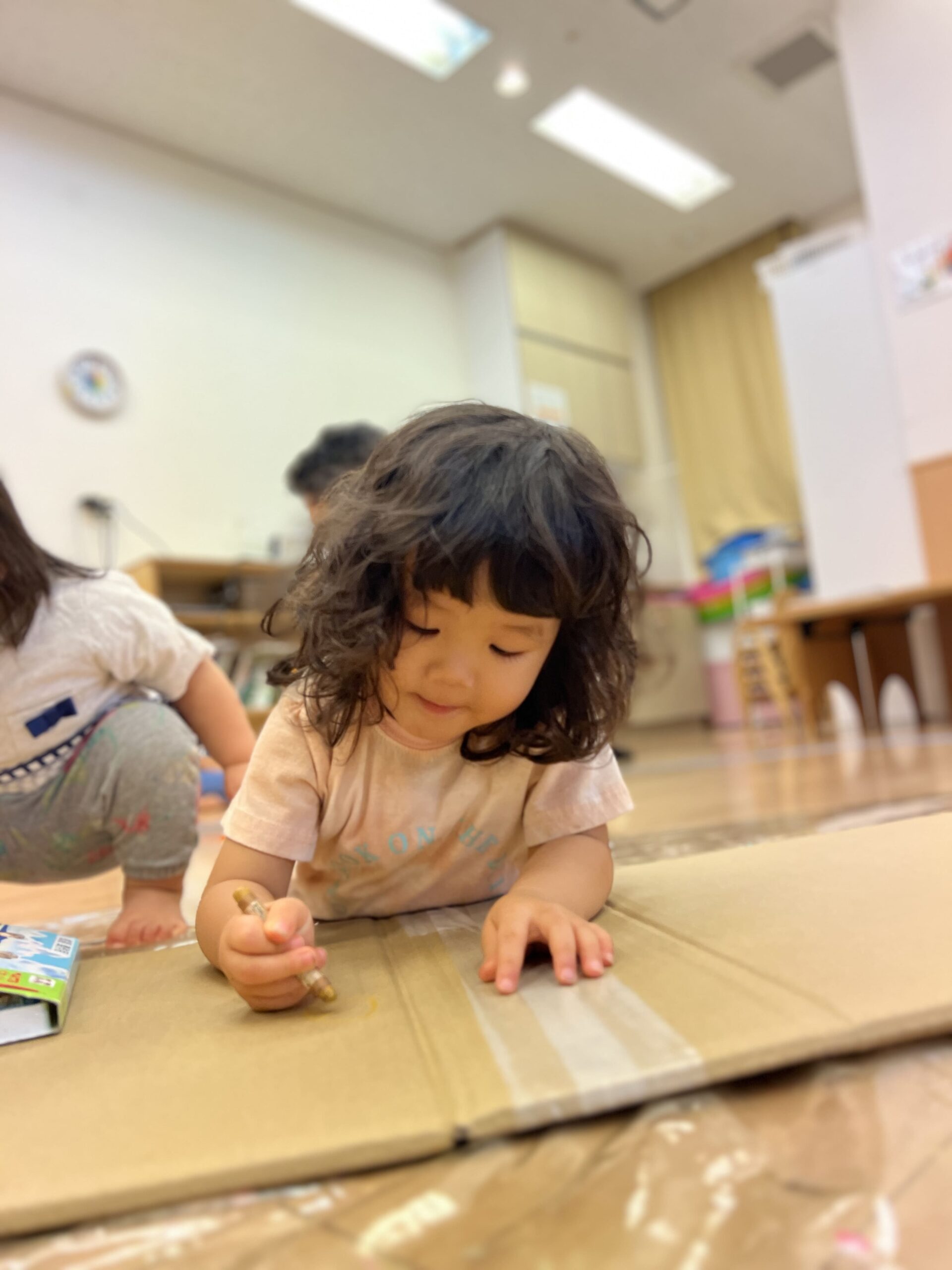 段ボールにクレヨンで好きな絵を描いたり、指や手でぐるぐると色を塗ったりしました。段ボールを輪にして、破った新聞を中に入れ新聞プールを作り、「新聞シャワー」にも挑戦!先生や友達と一緒に、体全体で新聞紙の感触や音を存分に味わいました。合間には、絵本やプラレールなども楽しみました。小規模保育ならではの丁寧な関わりを大切にしています。