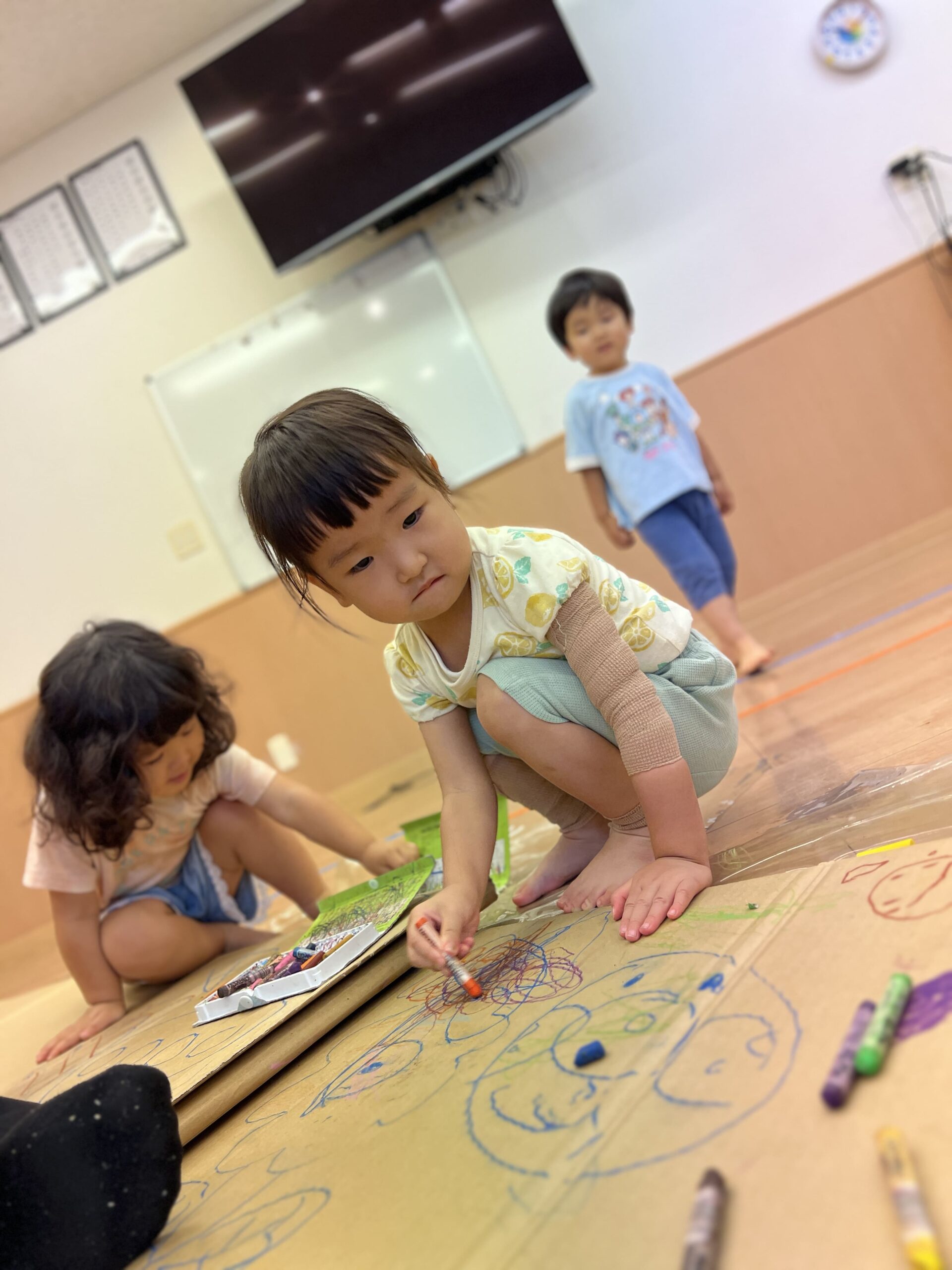 今日は、八王子市保育園「ぽかぽか保育園」で、段ボールに自由に絵を描きながら創造力を育て、新聞紙の破れる音や触感を全身で楽しむことをねらいとして活動しました。雨の日でも室内で存分に遊べる工夫を取り入れ、子ども達がのびのびと表現できる環境づくりを意識しています。