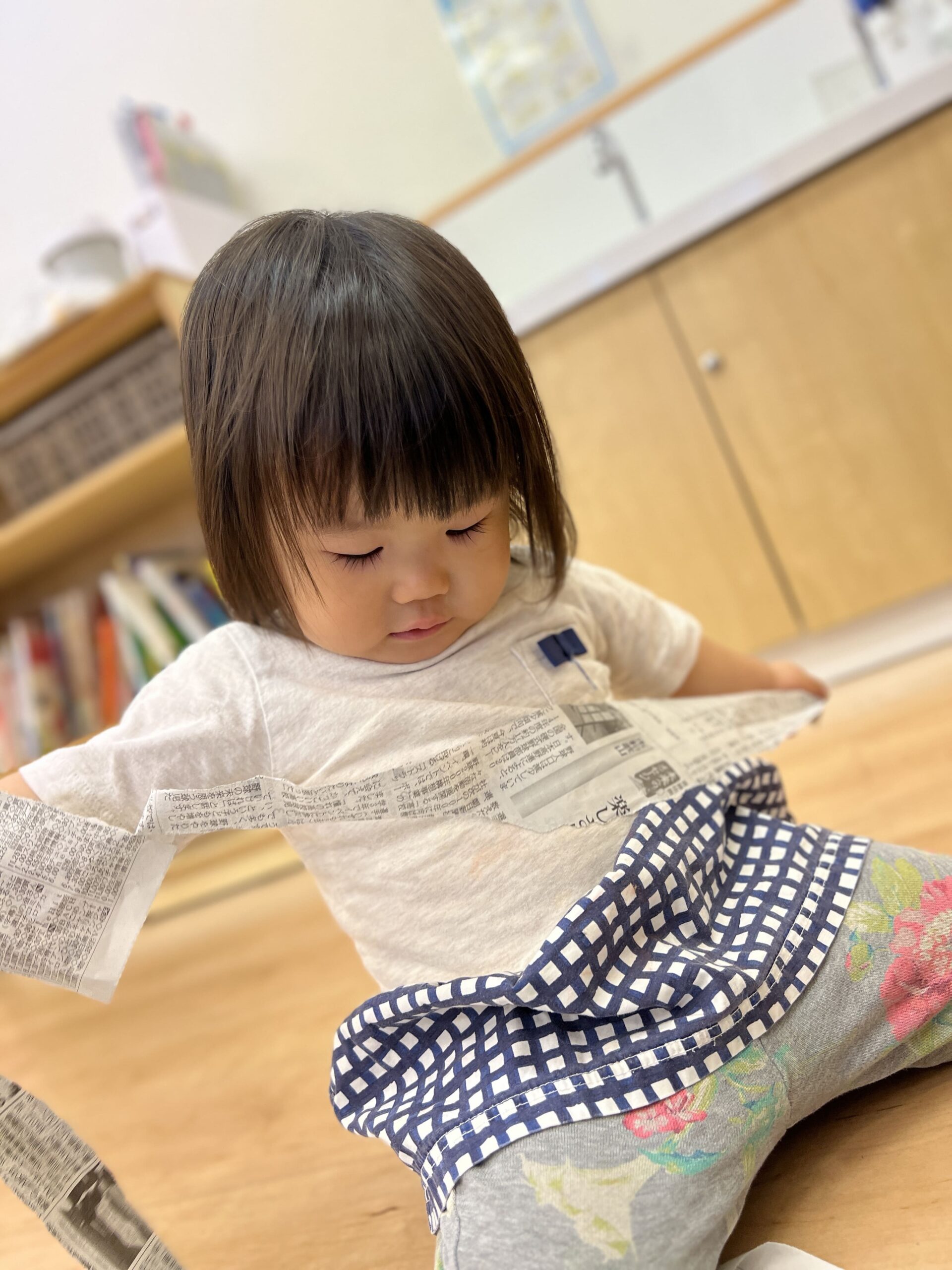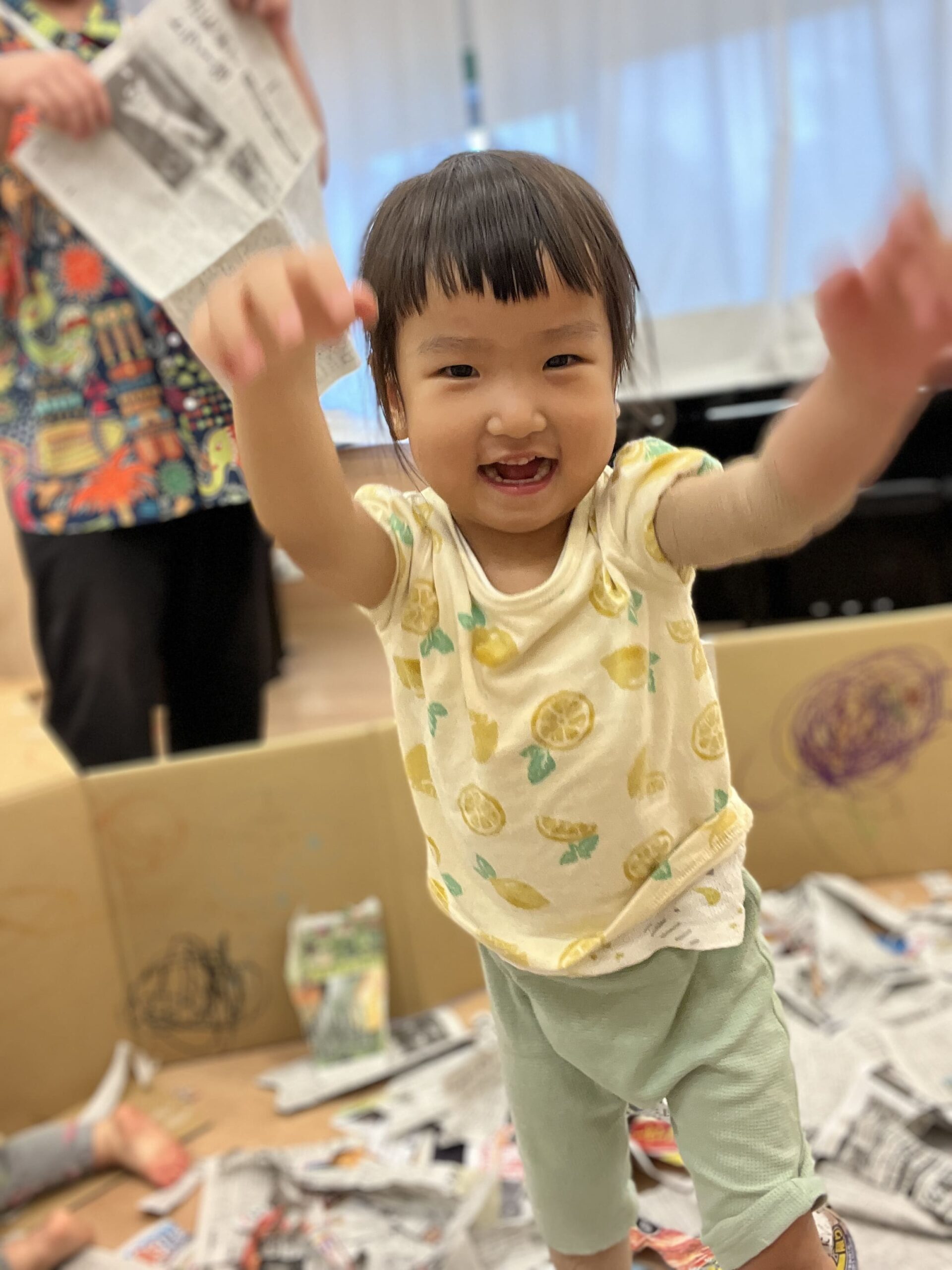 「せんせい、〇〇の顔かいて」とリクエストしたり、手や足をクレヨンでなぞってくすぐったがったり、爪に色を塗って「ネイルだ!」とはしゃいだりと、子どもたちは全身で表現を楽しみました。新聞を読む真似をしてから破いたり、最初は不安だった子もお友達の姿を見て次第に挑戦できるように。先生が新聞に埋もれると「助けてあげよう!」と一生懸命新聞をどかしてくれる可愛らしい姿も見られました。