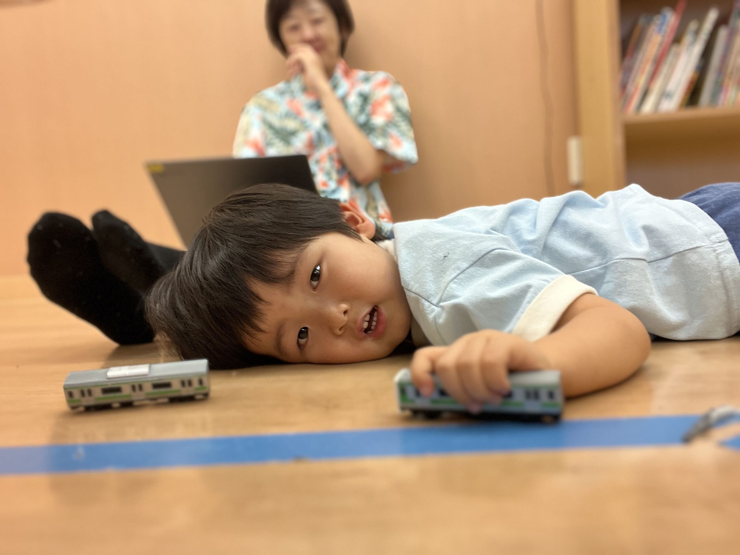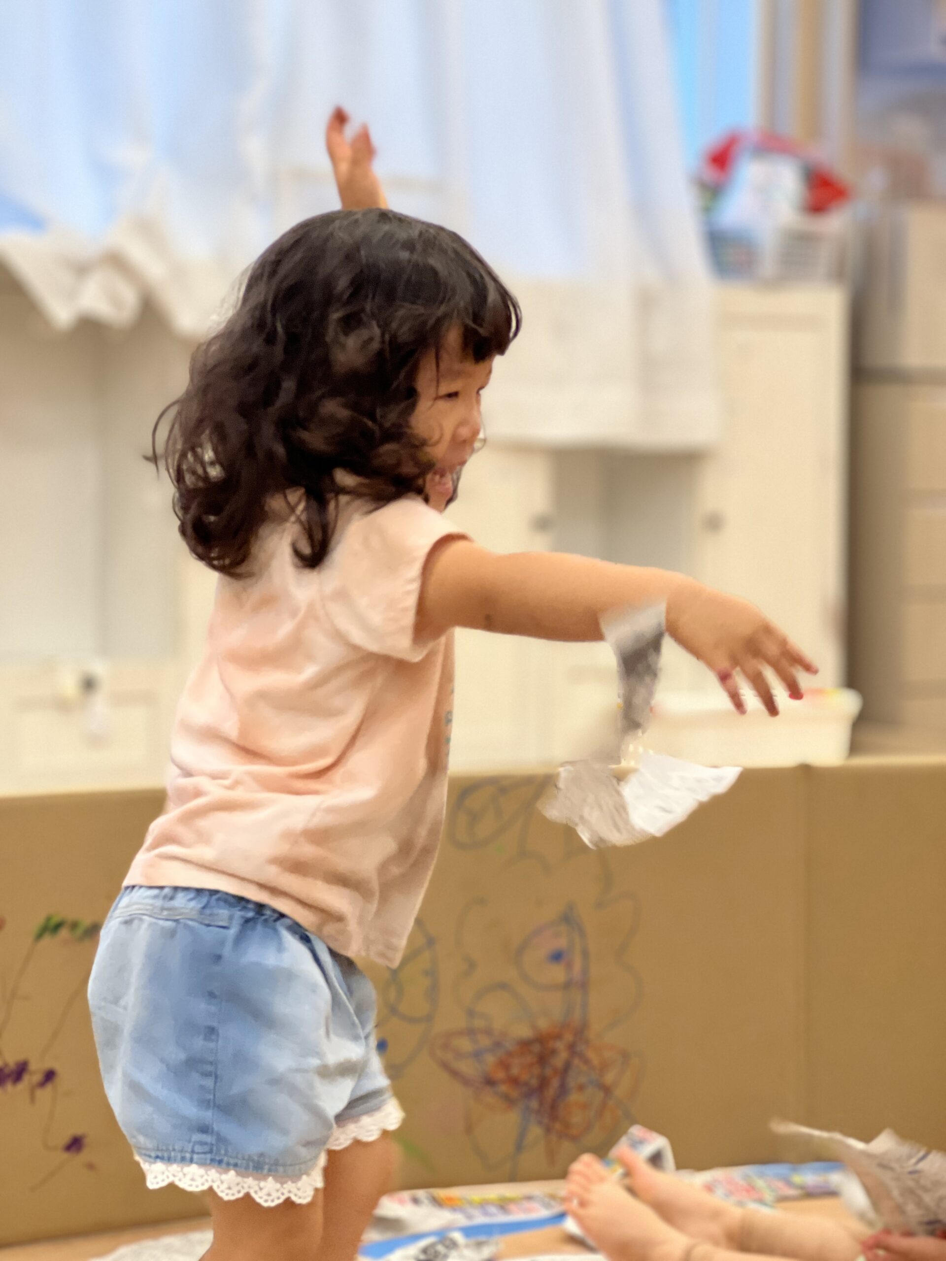 雨の日でも室内で楽しく過ごせるよう、身近な素材を活用した遊びを多く取り入れました。子どもたちが自分のペースで安心して参加できるよう、一人ひとりに寄り添いながら活動を進め、変化する興味や気持ちにも丁寧に応えられるよう工夫しています。幼児教育特化の活動で、豊かな感性を育んでいます。