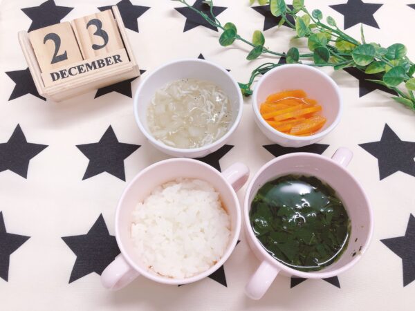 国産米をふっくら炊き上げ、ご飯粒が立つように仕上げました。自分でよそうセルフ方式を取り入れ、「ご飯もっとほしい!」と元気な声が飛び交います。