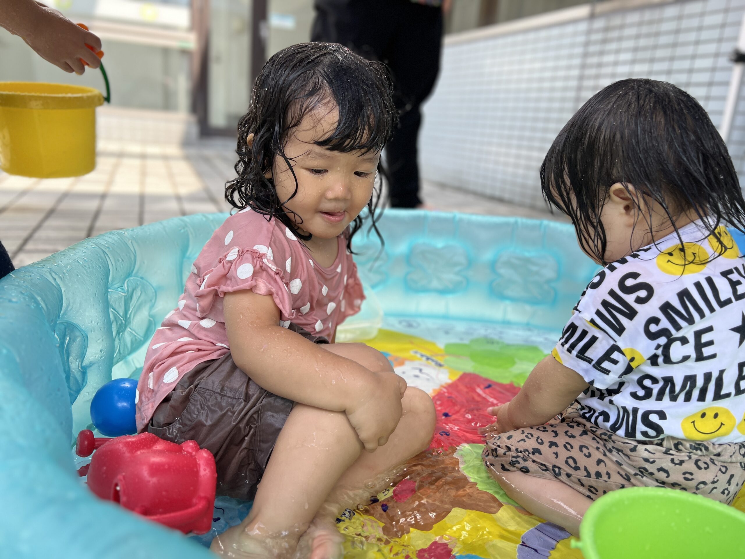 遊びの途中には、バケツでそっと水をかけあったり、水たまりに足を入れてピチャピチャしたり。