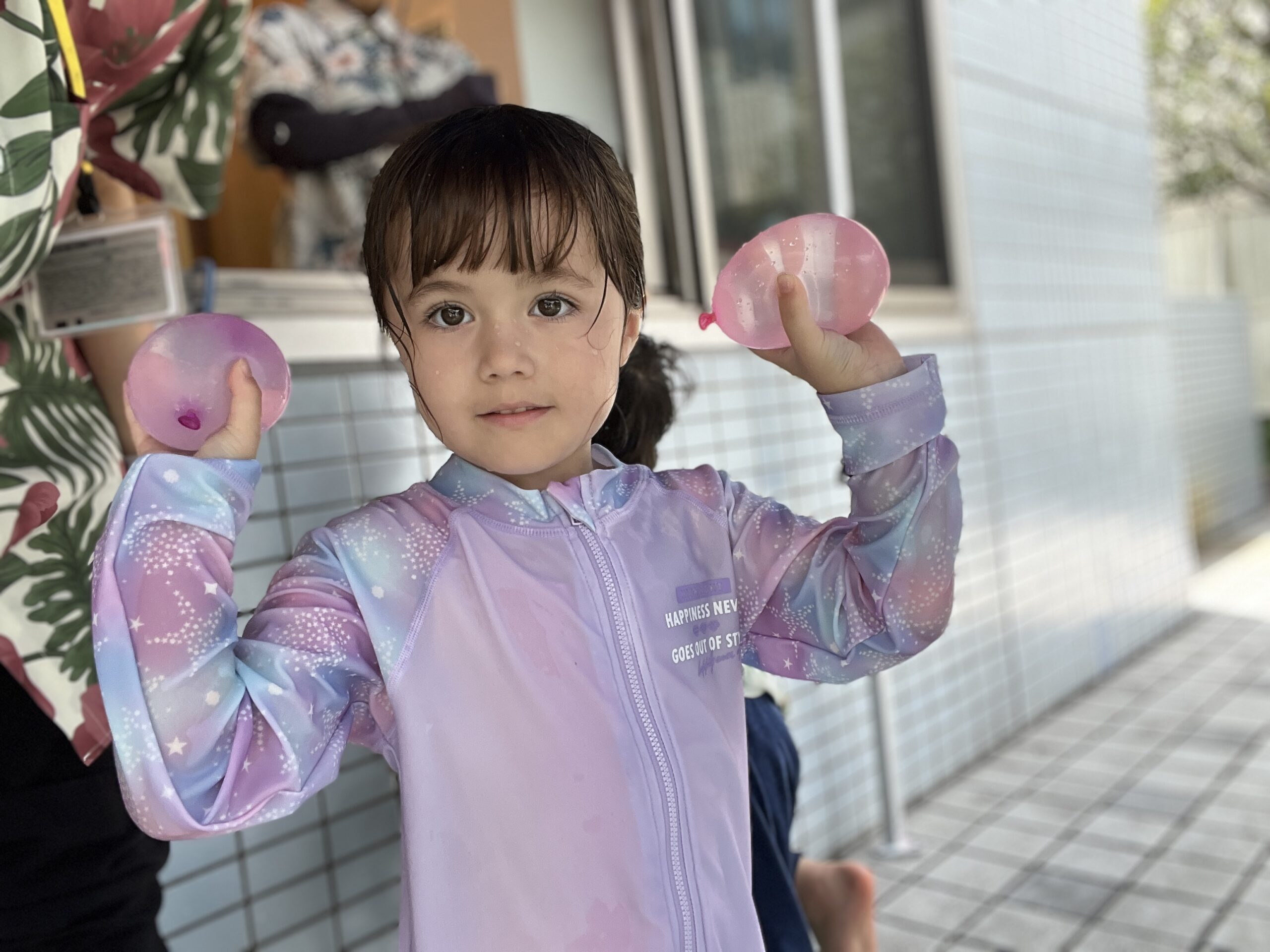 子どもたちは最初、ちょっぴり緊張気味…。でも、水風船を手にした瞬間から一気に笑顔に!