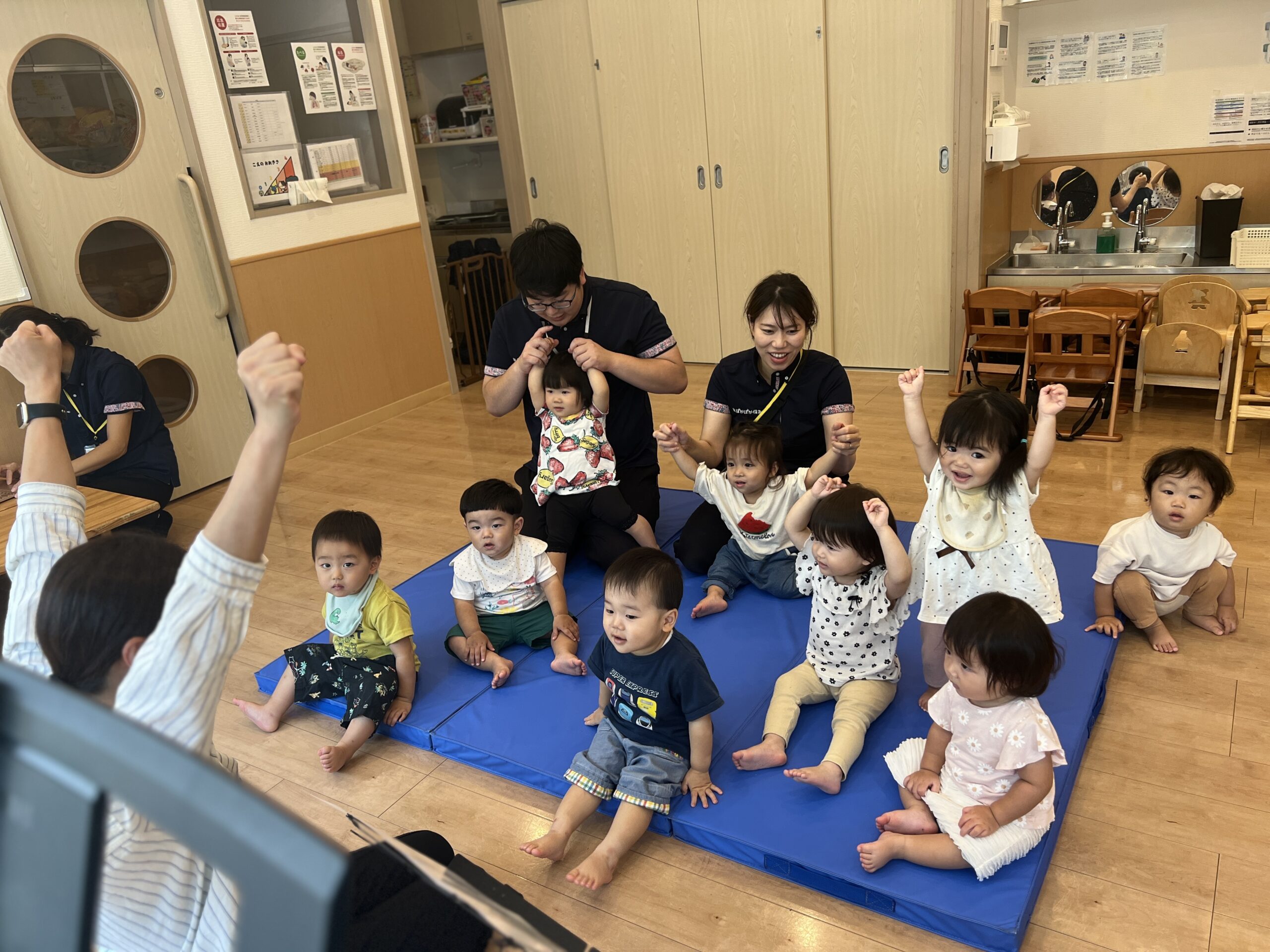 まずはみんなで音楽遊びからスタート!先生がお名前を一人ずつ呼ぶと、元気に「は~い!」と手を挙げてお返事。大きな声と一緒に、にこにこの笑顔が広がります。「〇〇さん、はーい!できたね。すごいよ!」と先生が声をかけると、「うれしい!」と得意げな顔を見せてくれる姿もありました。