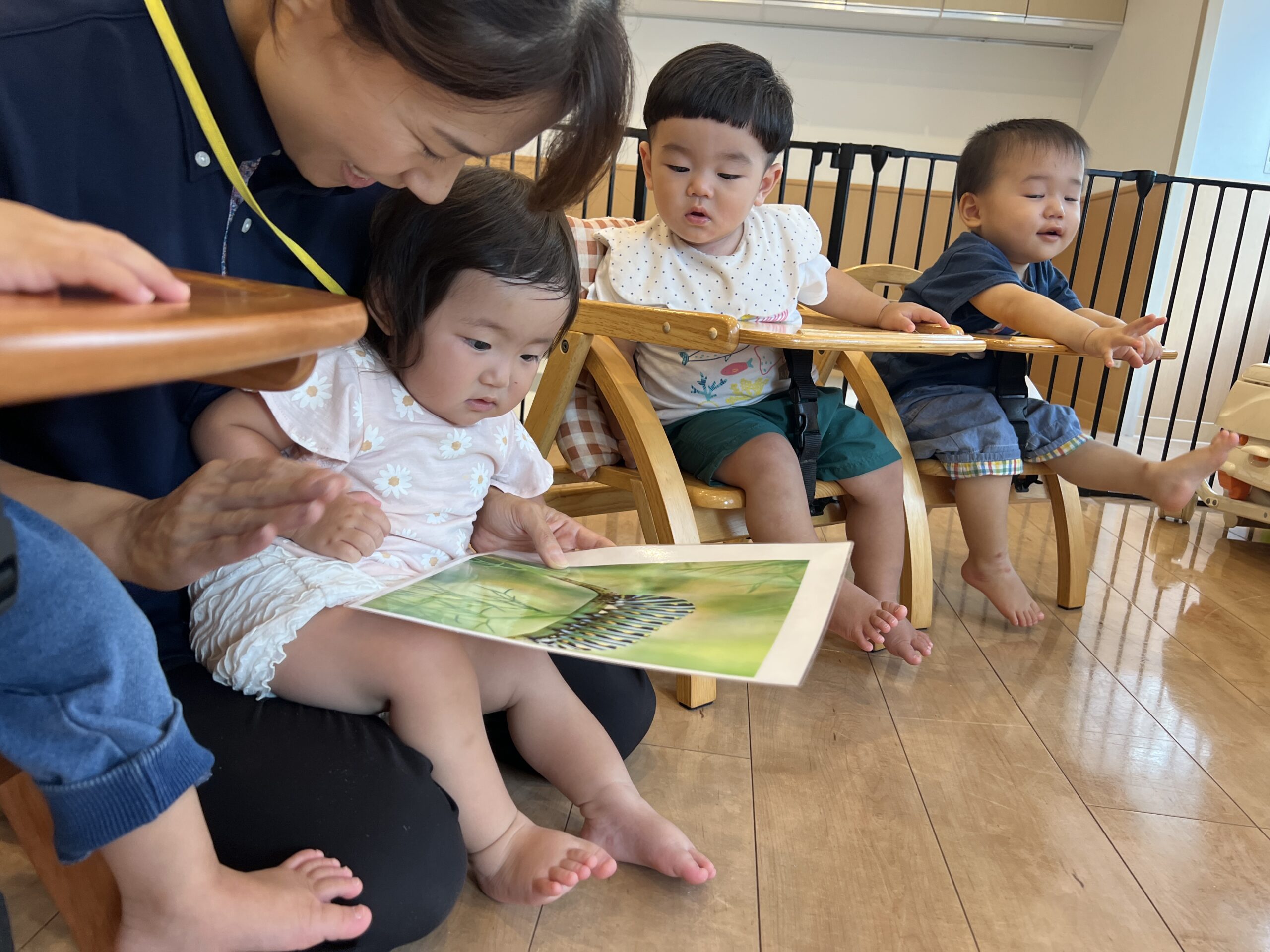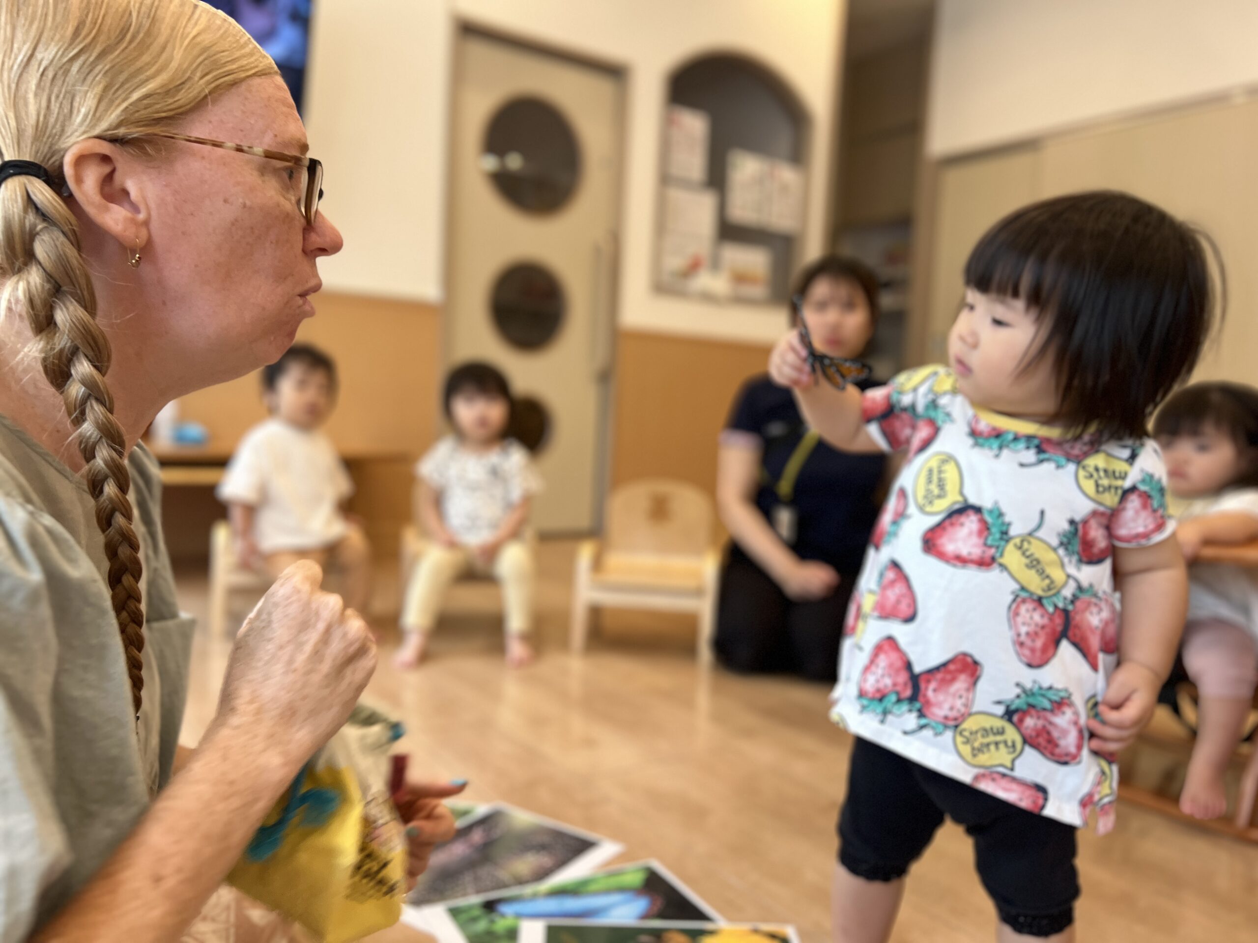 今日は絵カードと袋の中に入った虫のおもちゃを使った楽しい活動をしました。「やりたい!」と元気に手を挙げてくれる子がいて、とても頼もしかったです。「何が出てくるかな~?」とワクワクしながら手を袋に入れてみると、出てきたのは「てんとう虫!」。先生が「Which card is ladybug?」と英語で問いかけると、一生懸命カードを探して「これ!」と虫の絵カードにタッチ。「すごいね!」と先生やお友だちみんなで拍手。小さな成功をみんなで喜び合いました。
