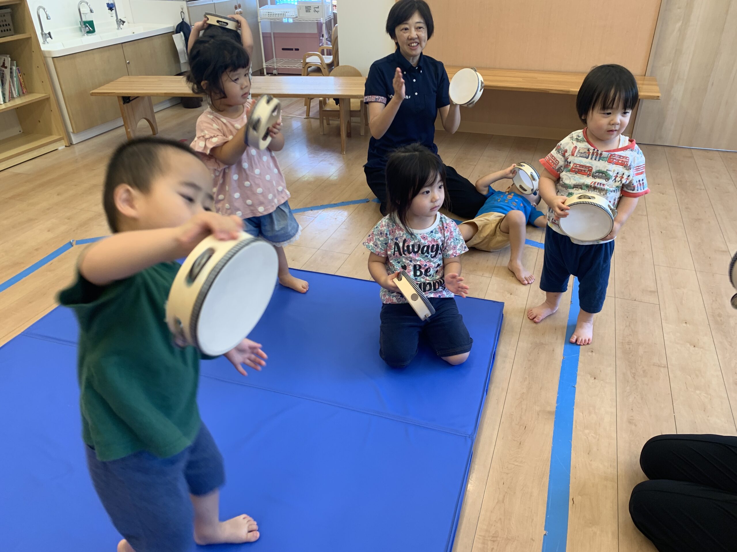 続いてタンバリン遊びも。「大きい音出せるかな?」の先生の声かけに、「こう?」としっかりと力を入れて鳴らしたり、「小さい音もできるかな?」と言われると、そーっと小さくたたいてみたりと、音の違いに興味津々。「上手だね!」と褒められると、さらに嬉しそうな子どもたちの笑顔がたくさん見られました。