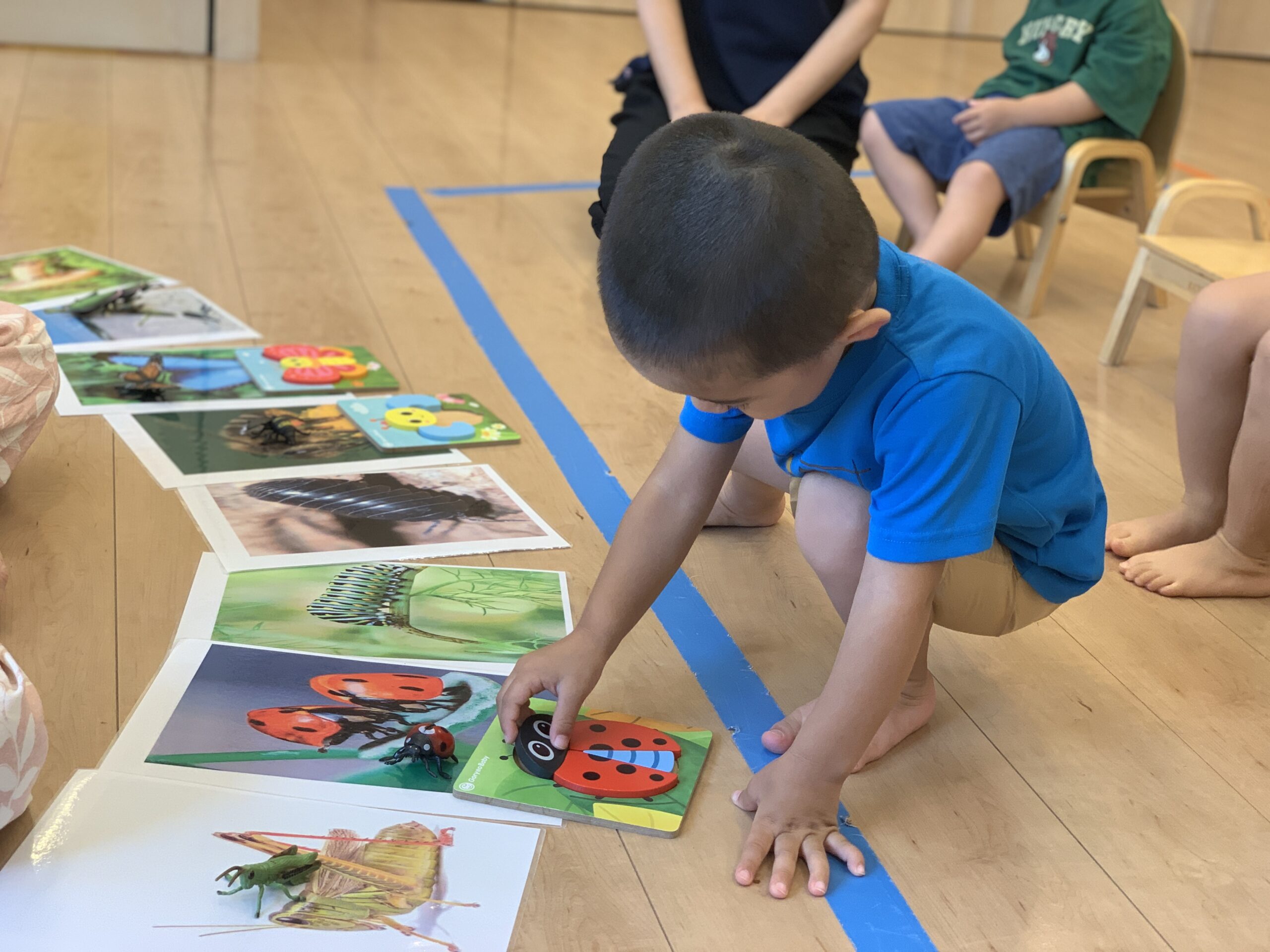 他にも「Butterfly」「Beetle」など様々な虫のカードが登場し、「どれだろう?」と考える姿や、お友だち同士で「こっちだよ!」と優しく教え合う場面も。「ぼくもやりたい!」とどんどんみんなが前に出てきて、英語にも虫にも興味津々の表情がたえませんでした。
