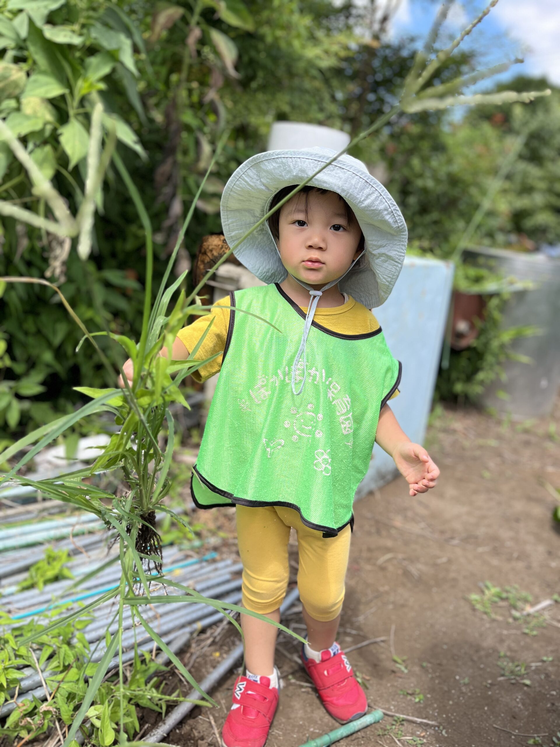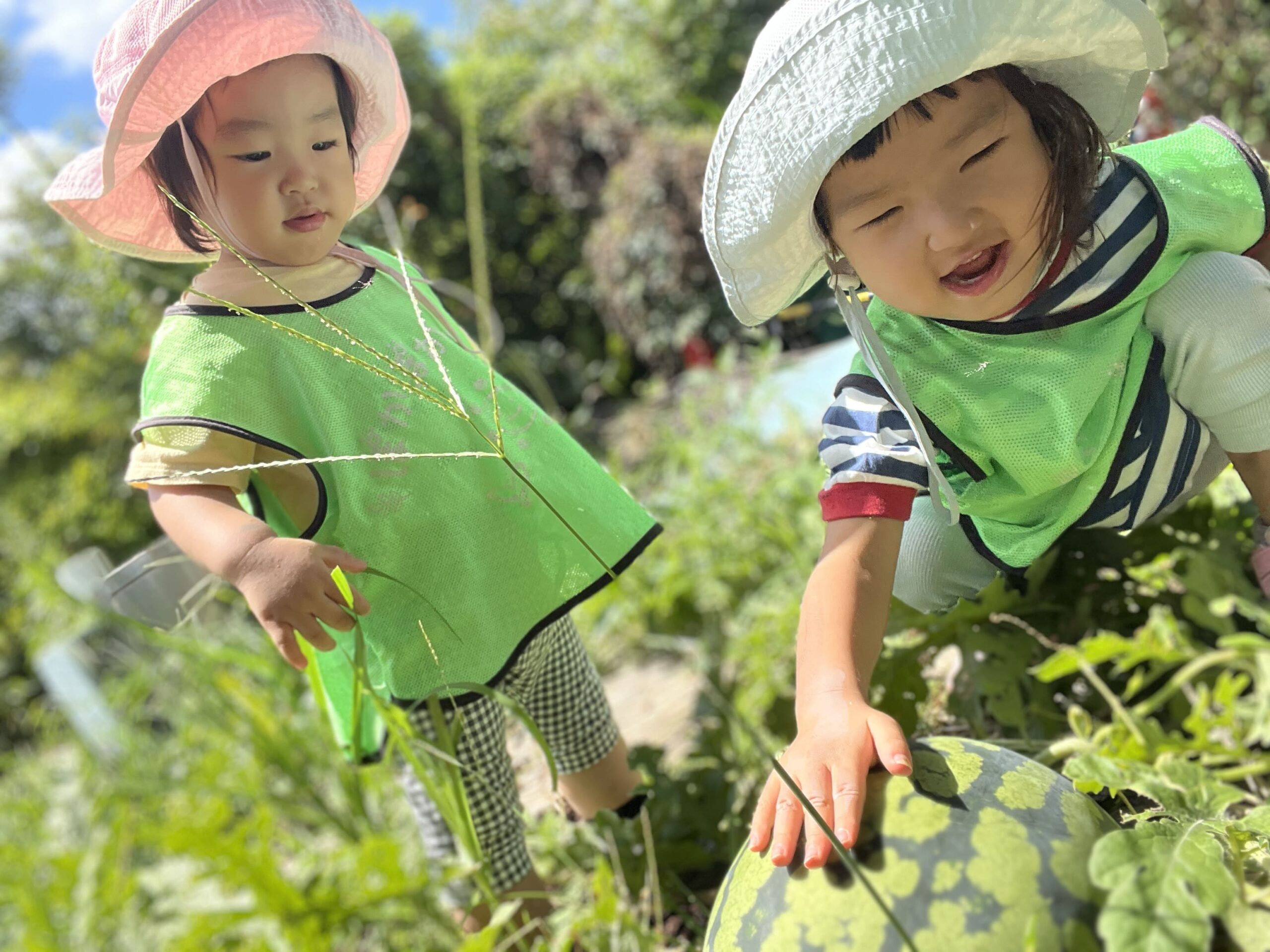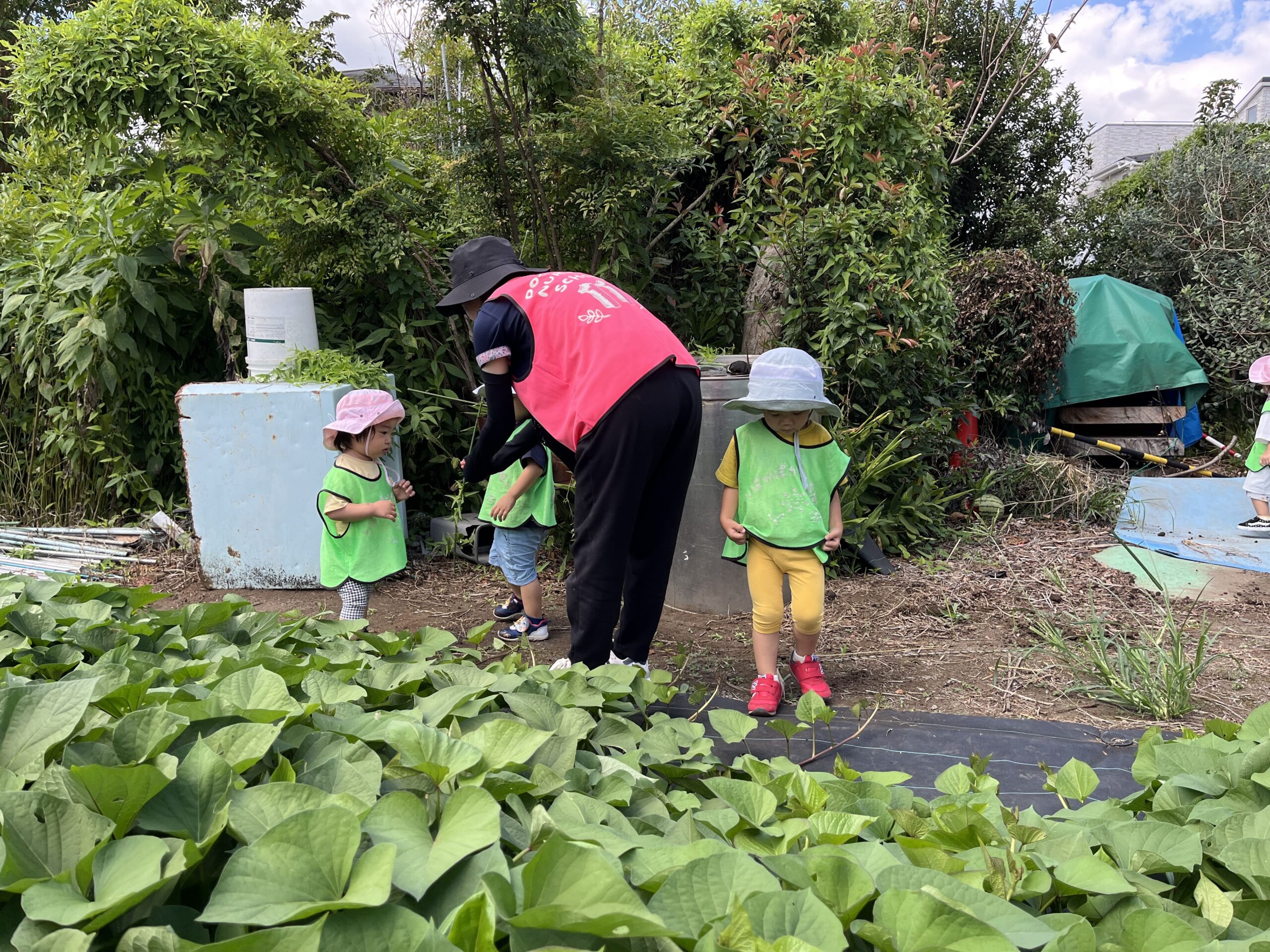 本日のねらいは、畑で育てているサツマイモの苗の成長を確認することです。みんなでサツマイモの苗をチェック。1週間で驚くほど成長し、大きい葉っぱに歓声が上がりました。バッタがたくさん跳ねており、捕まえようと大はしゃぎ。自然とふれあう中で、観察する力や育てる喜びを大切に育んでいます。大きく育つサツマイモの葉を見てサツマイモ掘りへの期待感も高まりますね♪