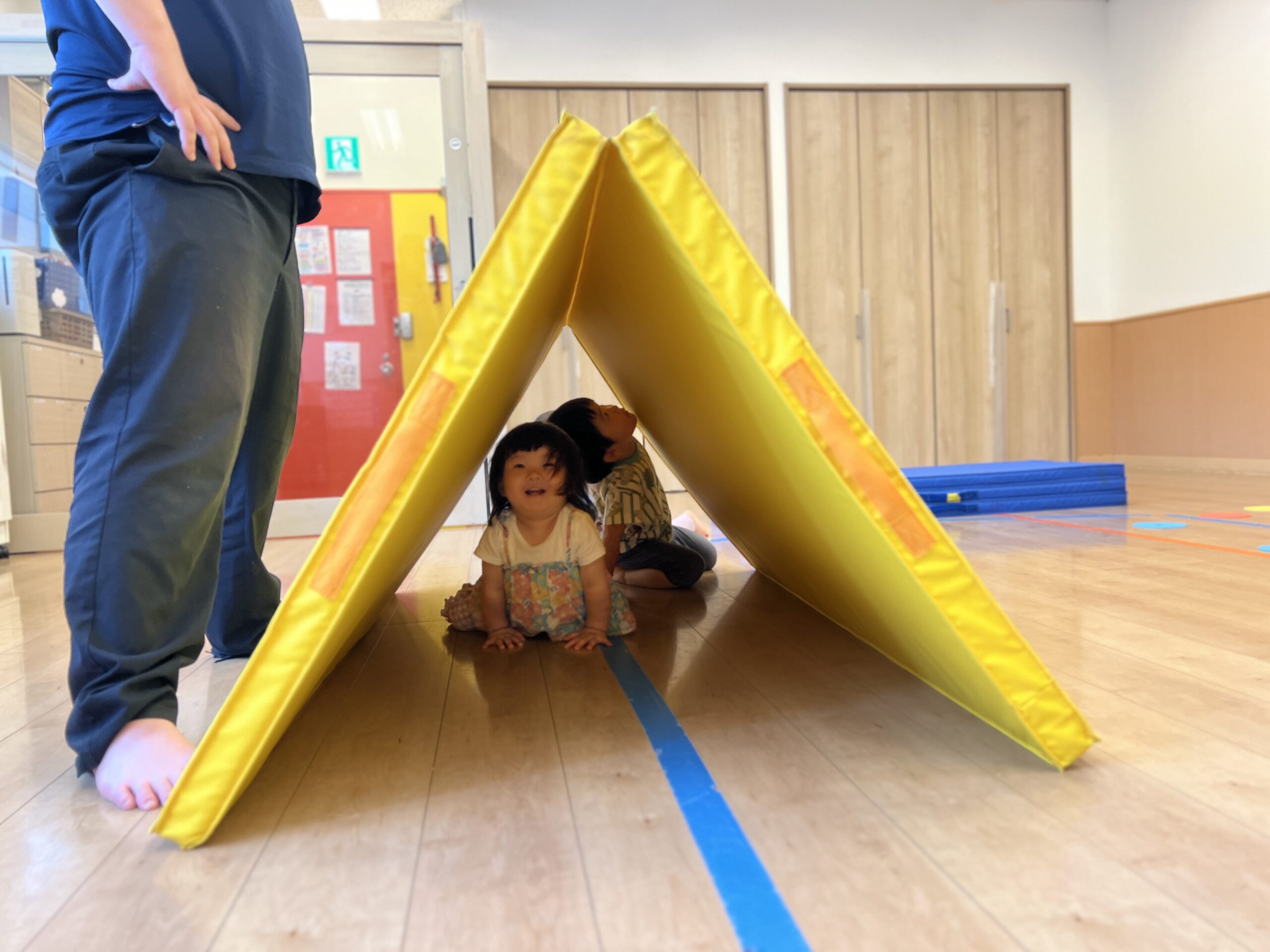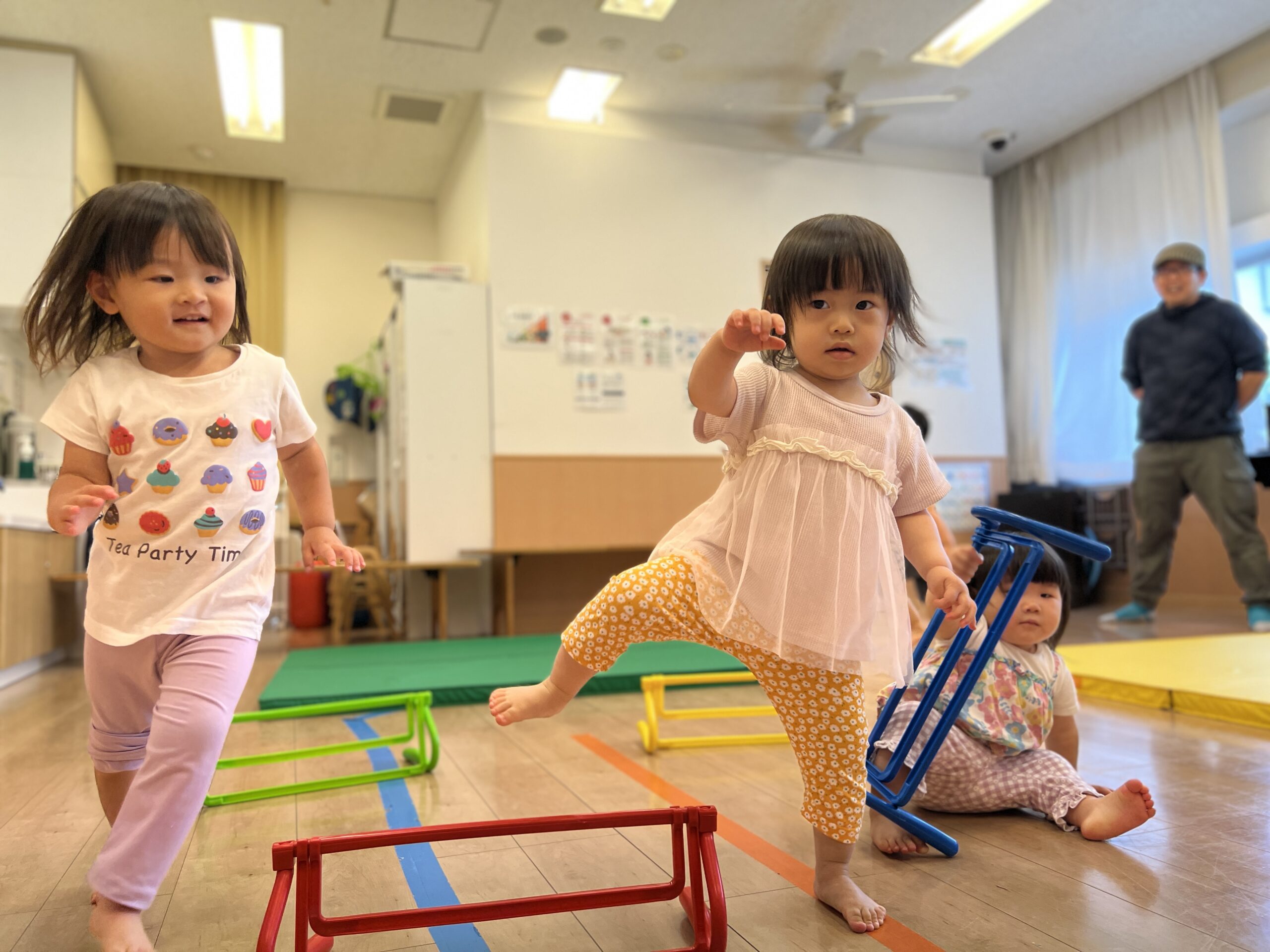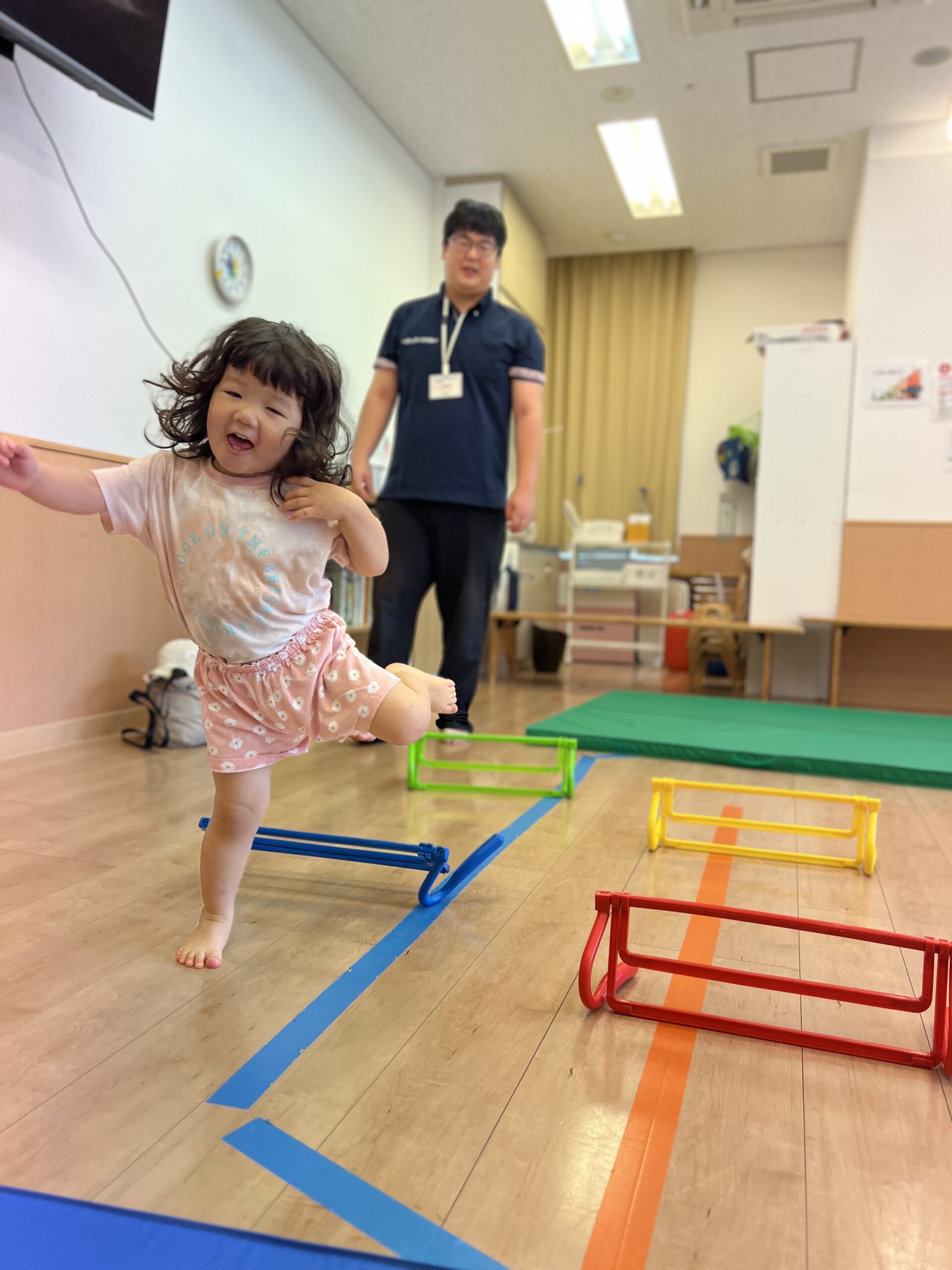 広い保育室にカラフルなマットやハードルを並べて、