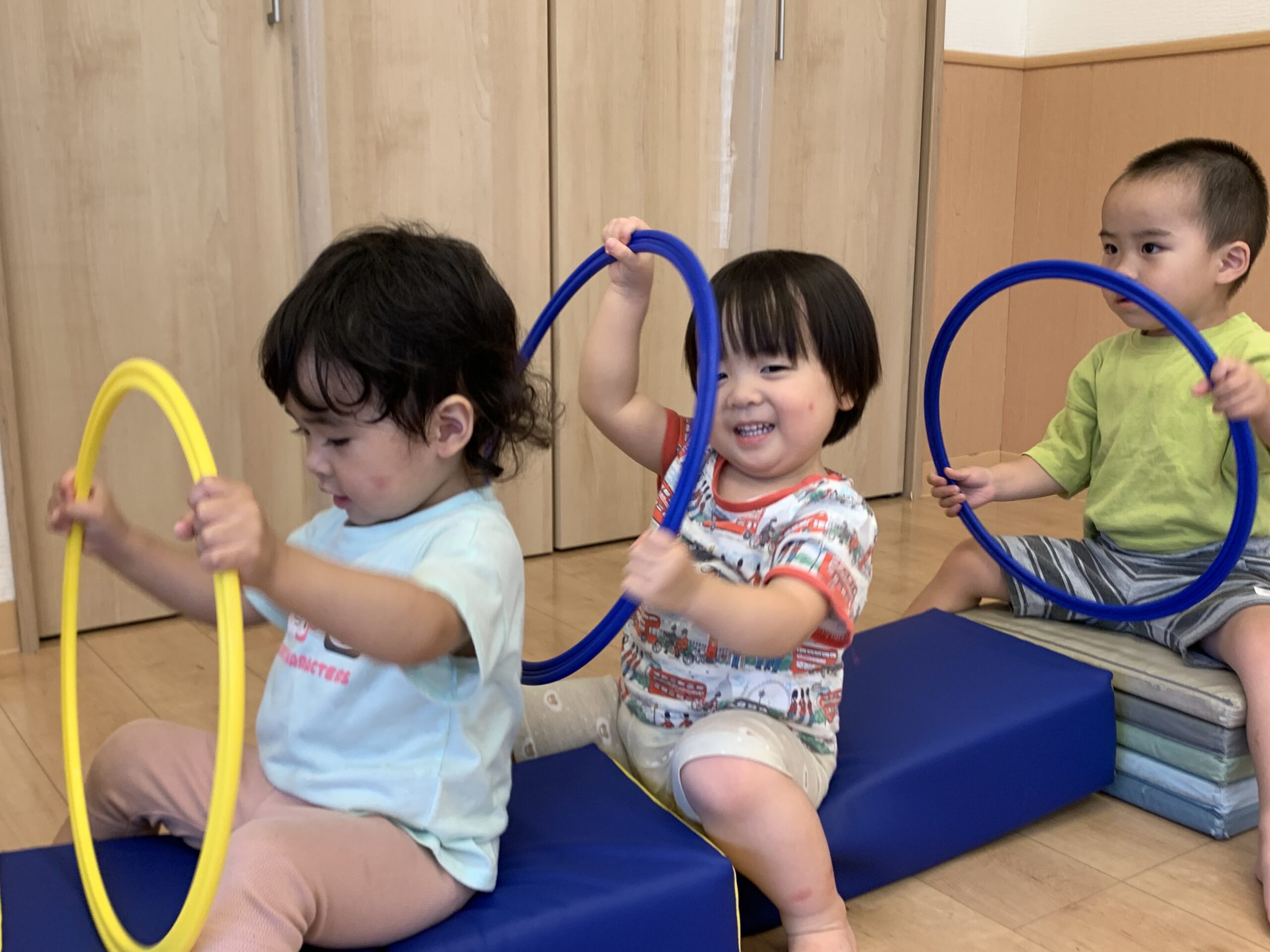 大きいお友達は、体育遊びを思いきり楽しみ、バスの運転手になっておでかけごっこに大興奮!「どこに行こうかな?」と想像しながら、腕を大きく動かしてハンドル操作を楽しんでいました。でこぼこ平均台では、足裏で感じるでこぼこに「わっ、変な感じ!」と驚きつつも、みんな慎重に進みます。日々の体験が自信に!みんなの笑顔があふれる一日でした。