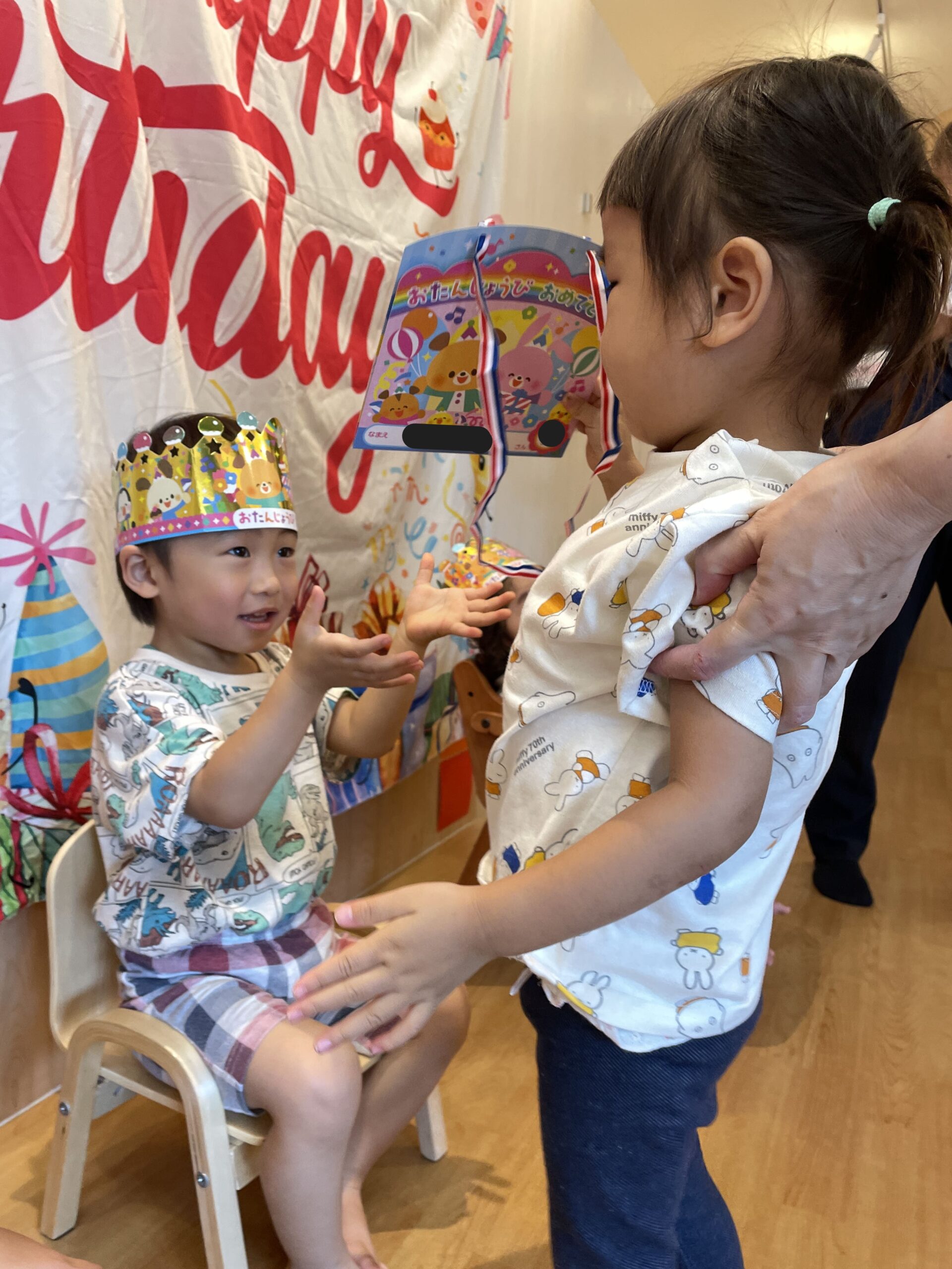 今日の活動は、まず全員で元気いっぱいに「ハッピーバースデー」の歌を歌いました。子どもたちの可愛い歌声が響き渡り、主役の3人はちょっぴり照れくさそうな笑顔を見せていました。続いて、頭に王冠を被ってバースデーインタビュー!「好きな食べ物は?」「大きくなったら何になりたい?」などの質問に、最初は恥ずかしそうでしたが、だんだん慣れて自信をもって答えられるようになりました。手厚い保育を心がける当園では、こうした一人ひとりが主役になれる機会を大切にしています。最後には手作りの誕生日カードをみんなから贈られ、とても嬉しそうでした。