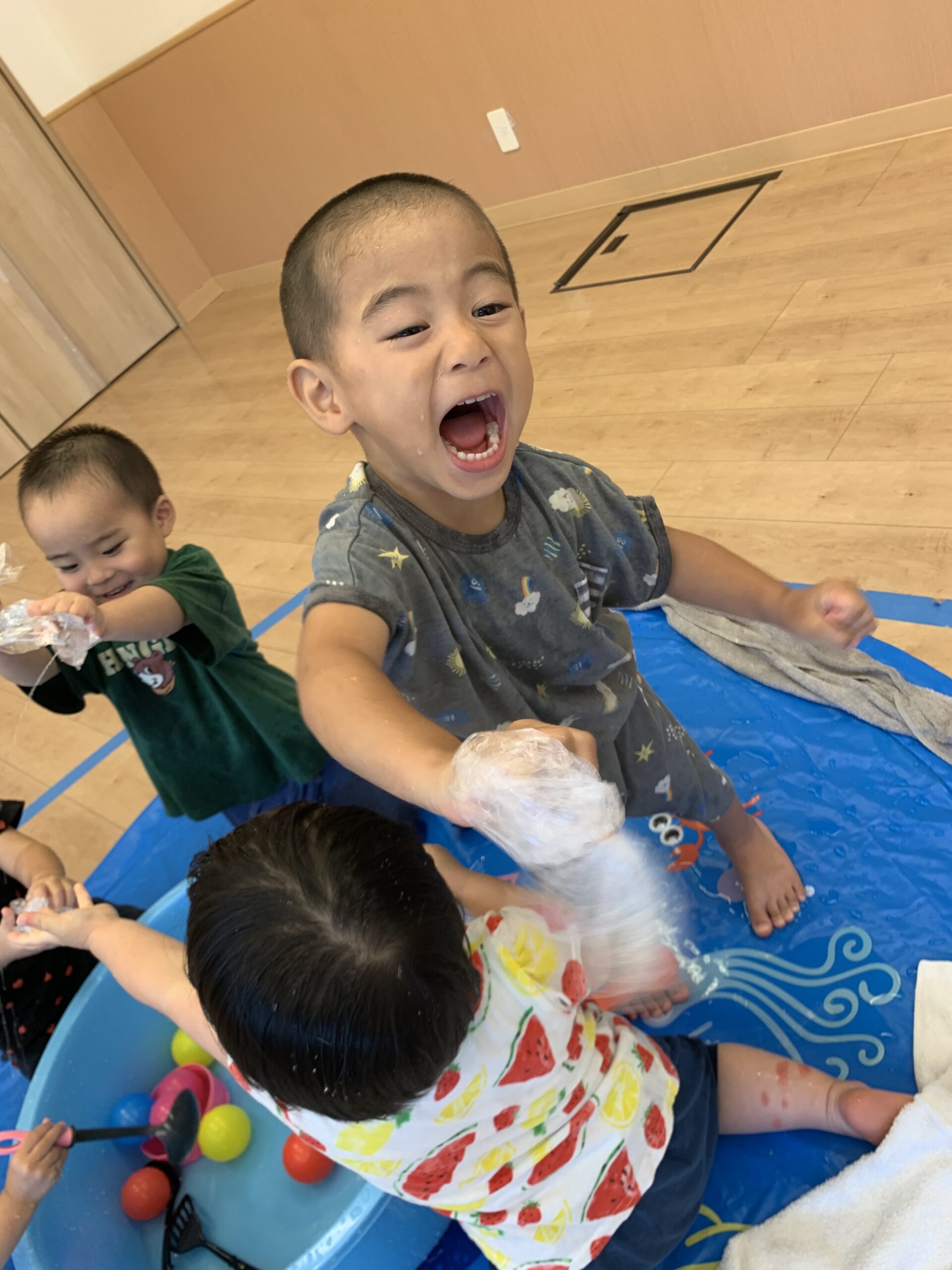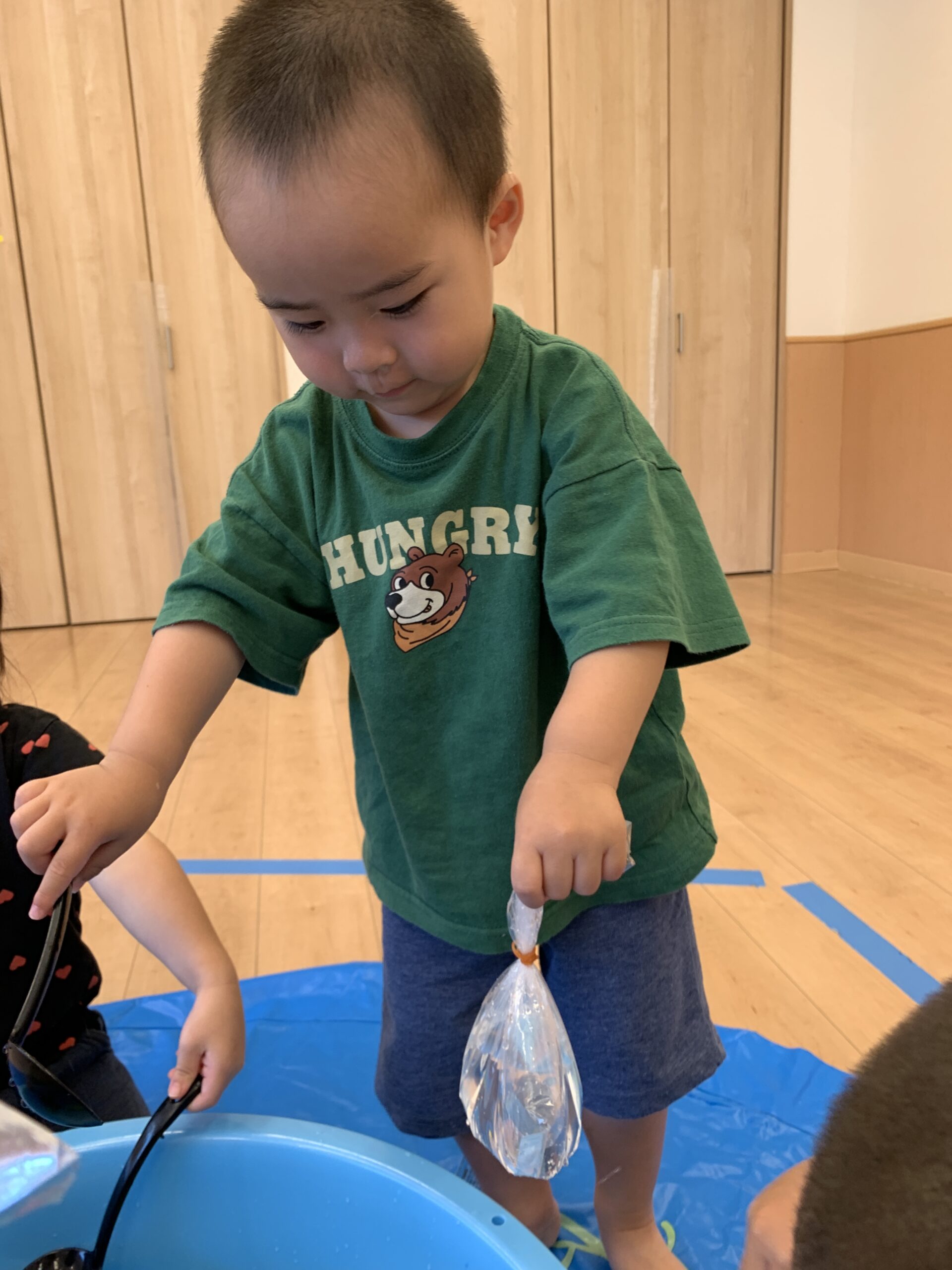 虹組では室内で水遊び!冷たいビニール袋の感触を