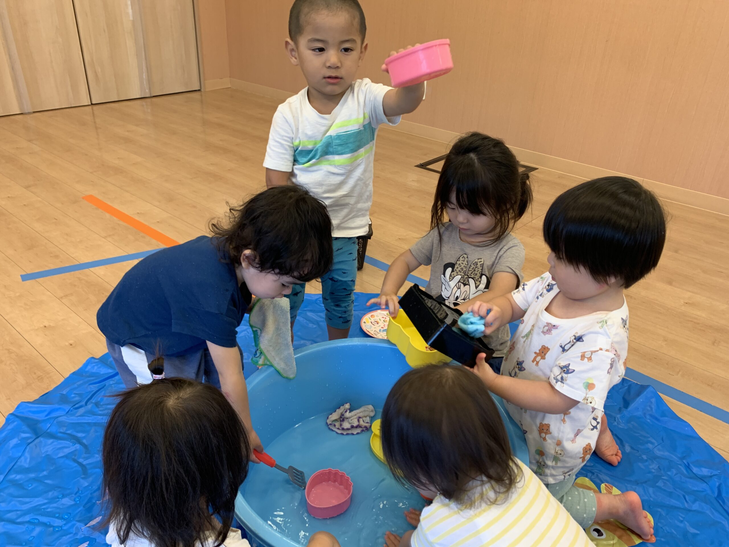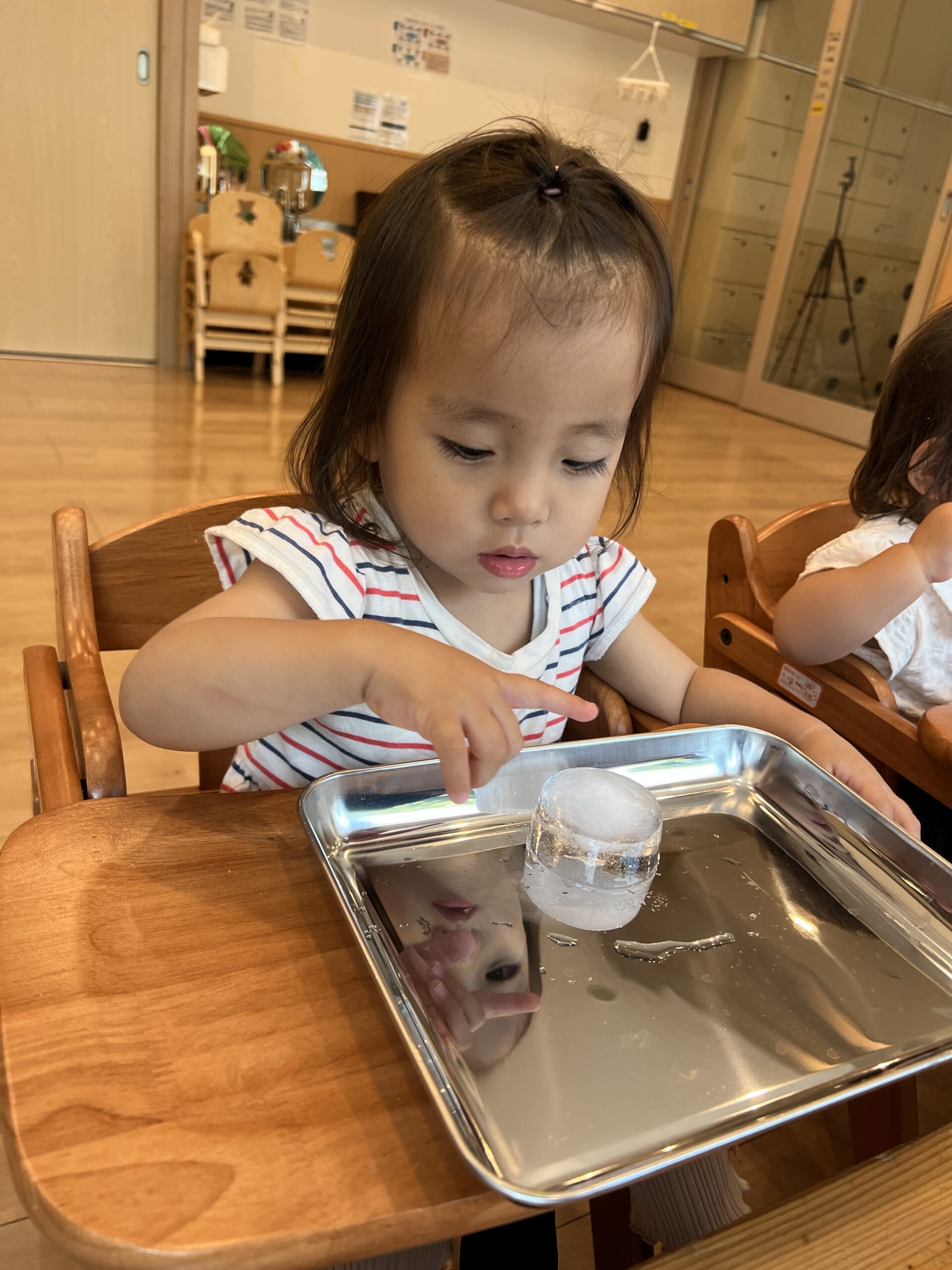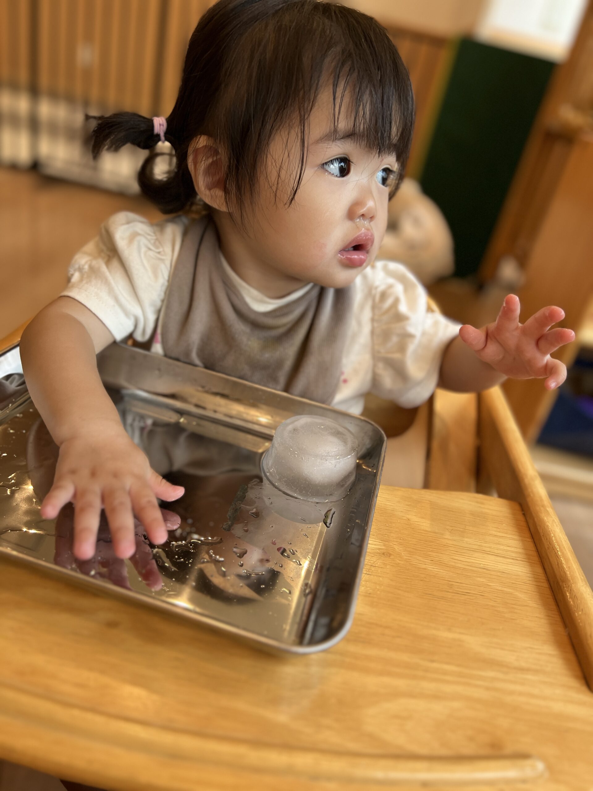 その後は氷遊び。手でつんつんしたり、そっとなでて冷たさや気持ちよさを味わいました。