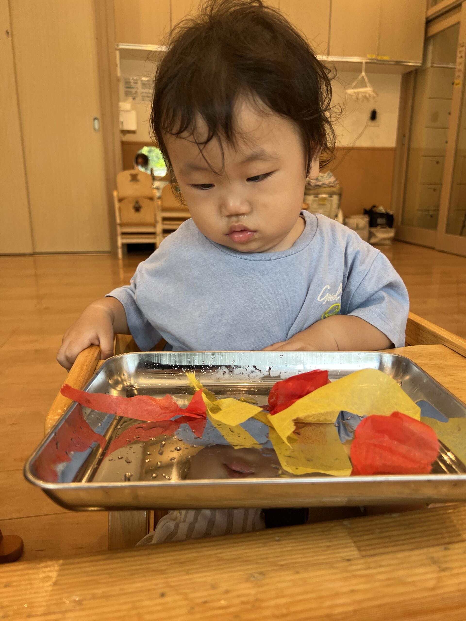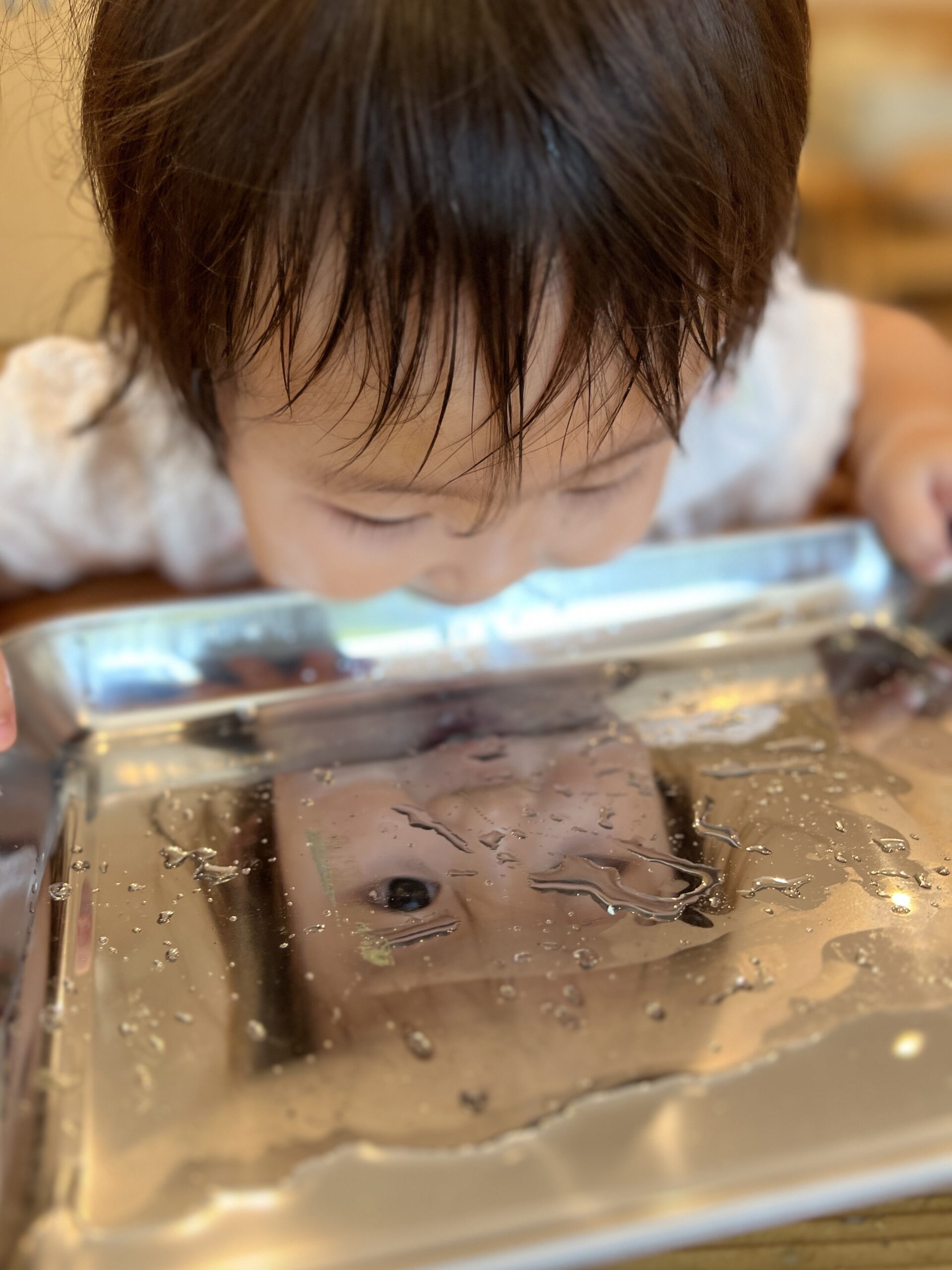 花紙を使ったサイエンスごっこにも挑戦。「つめたい!」と驚いたり、氷の上に花紙をのせて観察したり。銀のトレイに映る自分の顔に不思議そうに見入る姿もありました。