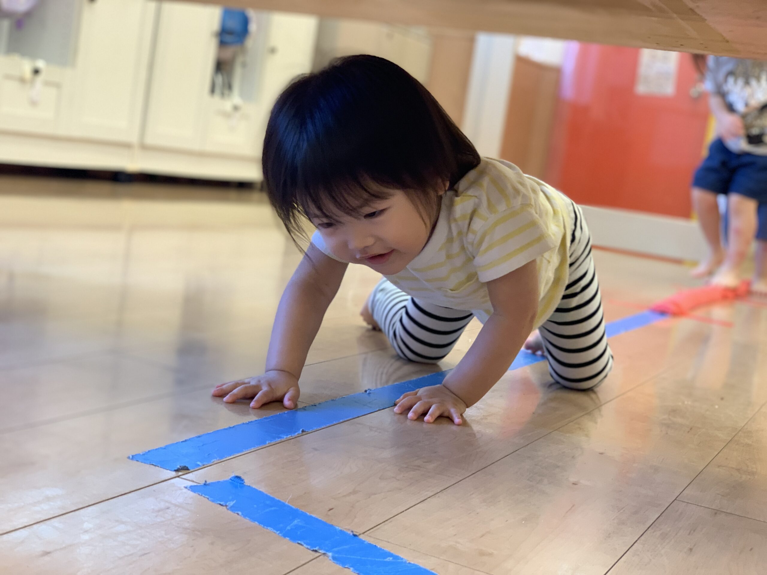 虹組ではサーキット体育遊びをしました。テーブルをトンネルにすると、大喜び!お友達を押すことなくと順番にくぐることが出来ていて成長を感じました。