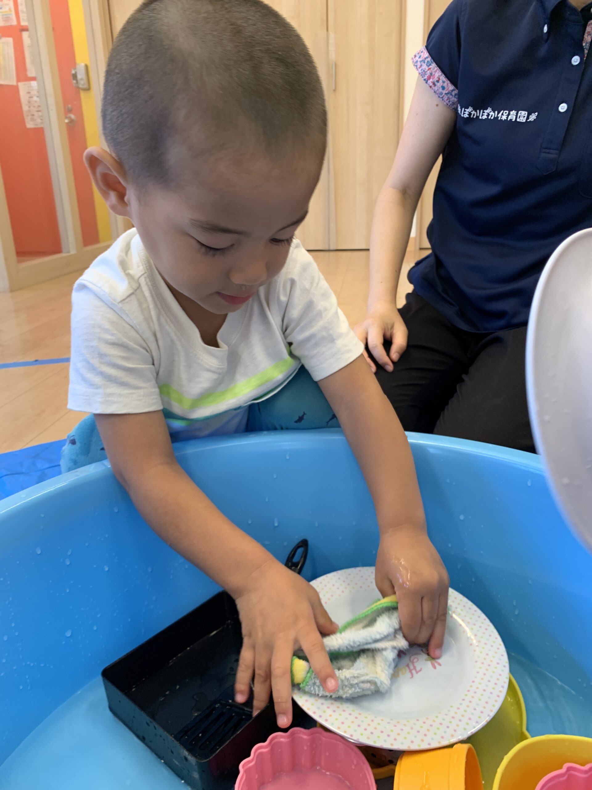 体を動かした後は、おままごと道具洗い。いつも使っているおもちゃを大事にしようね、きれいにしようねとお話をすると、やる気十分な子どもたち!水の気持ち良さを味わいながらミニタオルで食器やお鍋をじゃぶじゃぶと洗いました。