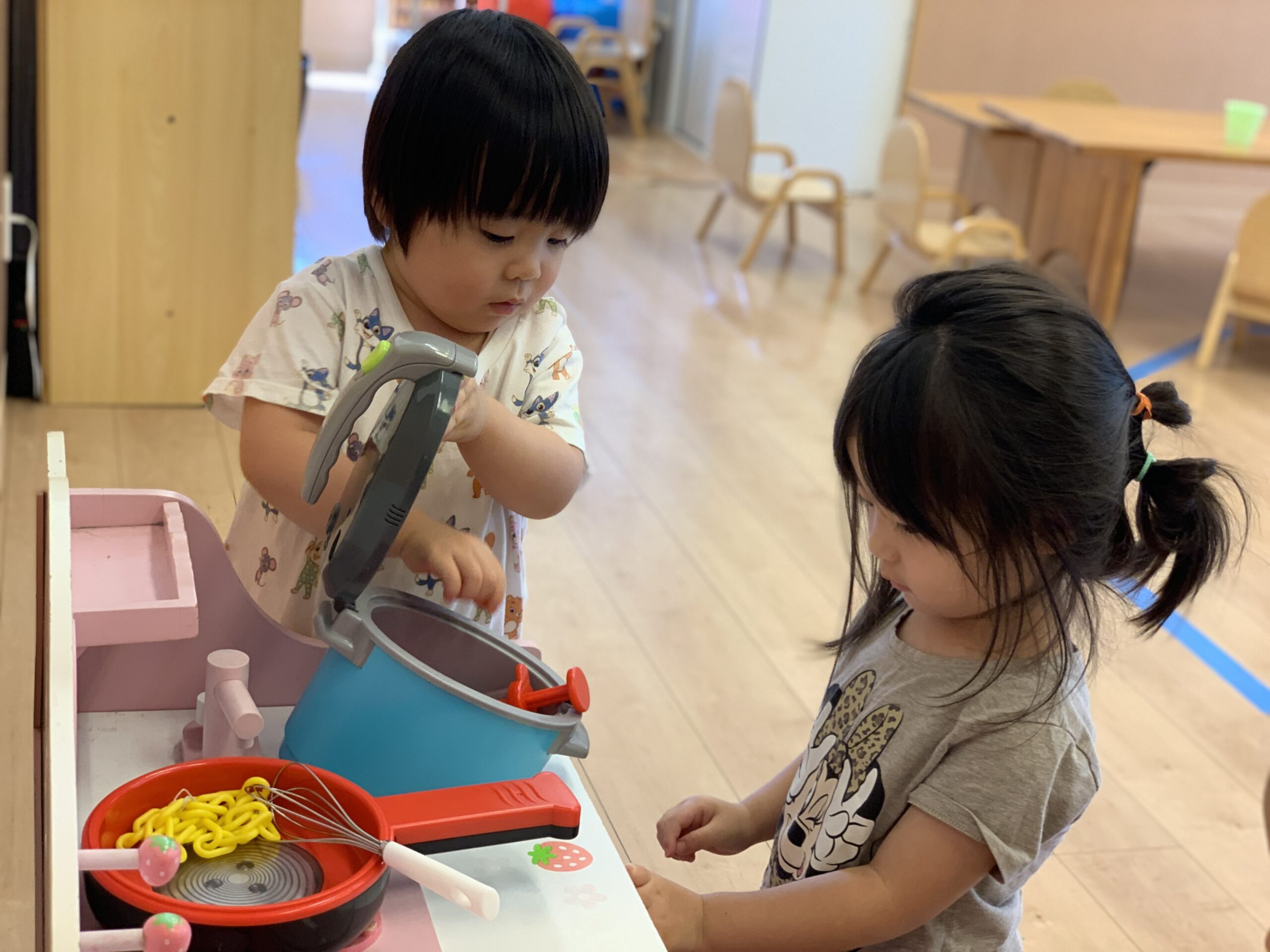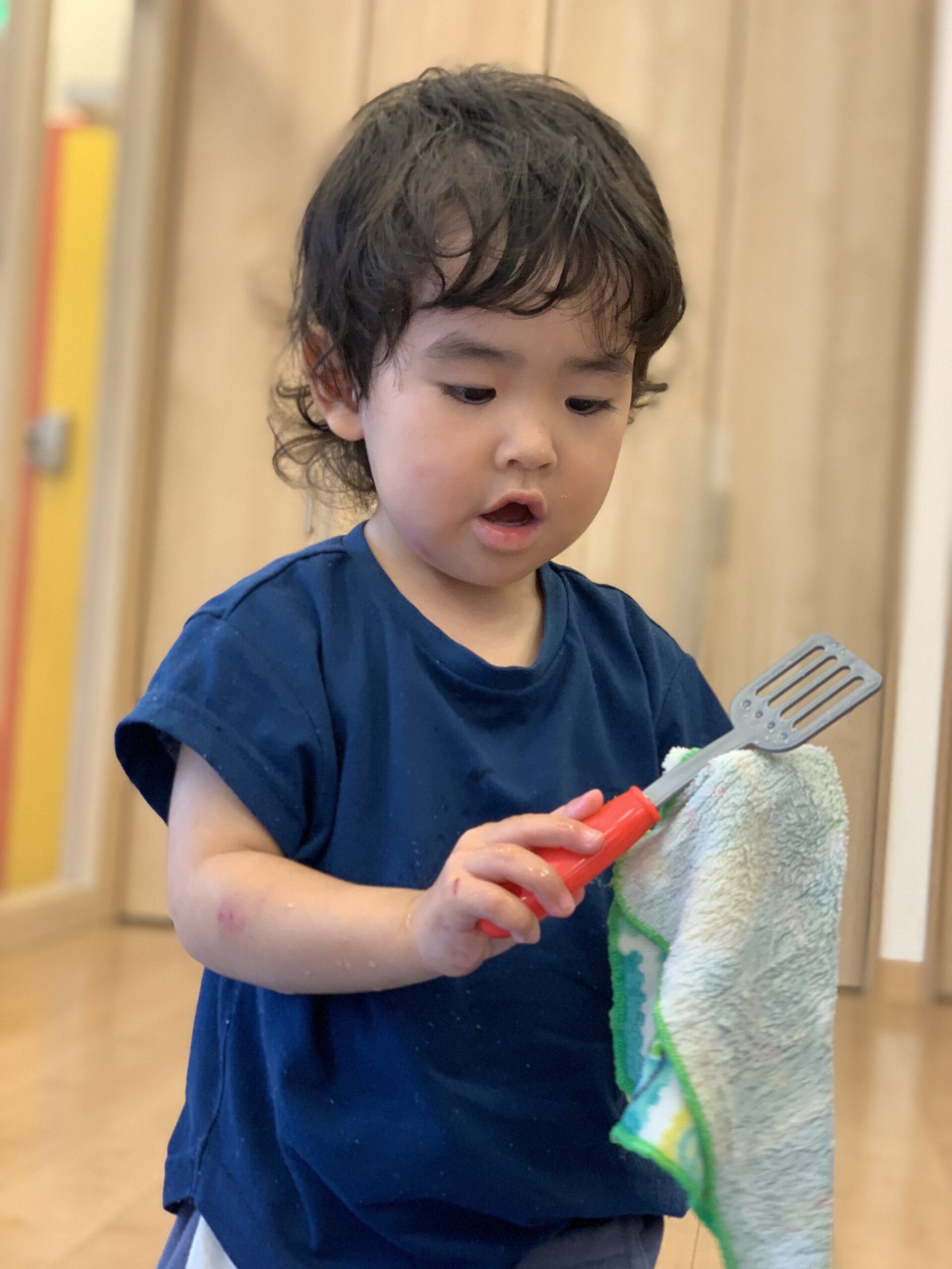その後はきれいになったおもちゃを使っておままごとを堪能しました。久しぶりにキッチンを出すと場所の取り合いをしながらも仲良く遊び、きれいになったおもちゃでのおままごとは大盛り上がりでした。