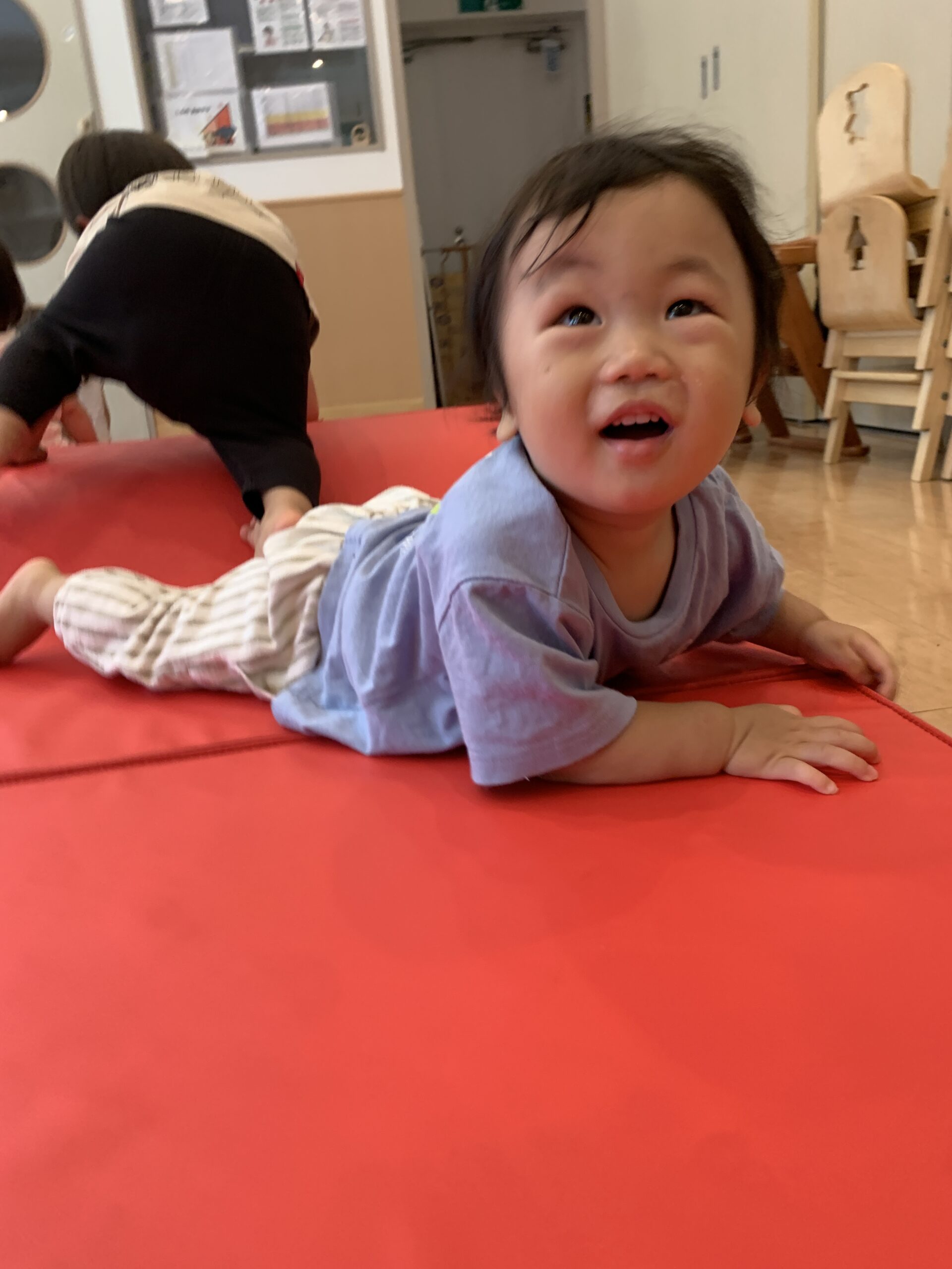青空組では、室内マットを使った安田式体育遊びをしました。マットを山にして登り下りを楽しむ「お引越し遊び」で、みんな大はしゃぎ!マットの上を何度も往復し、みんなで大移動!マット山に登っては「やったー!」と嬉しそうな声が響きました。