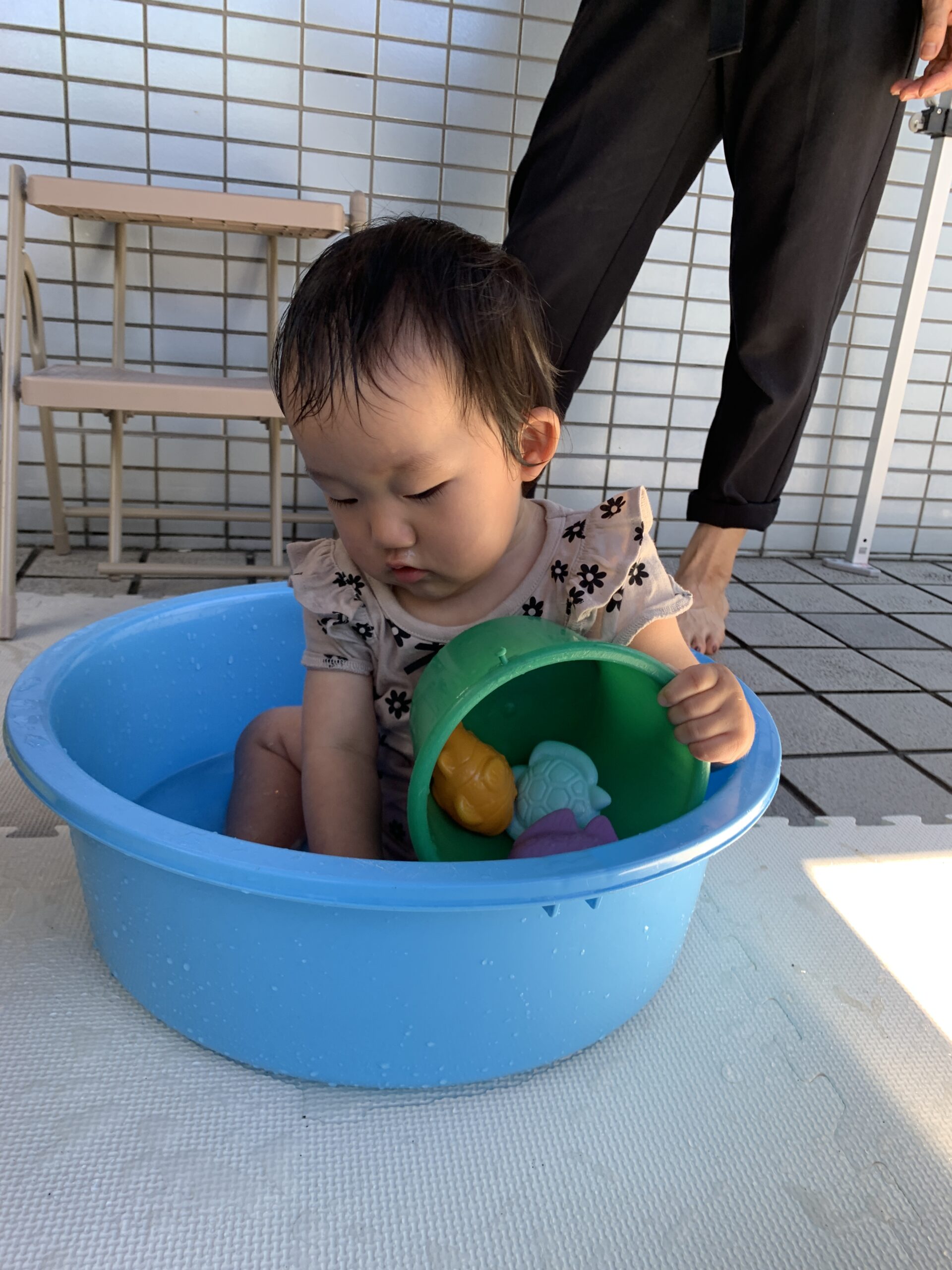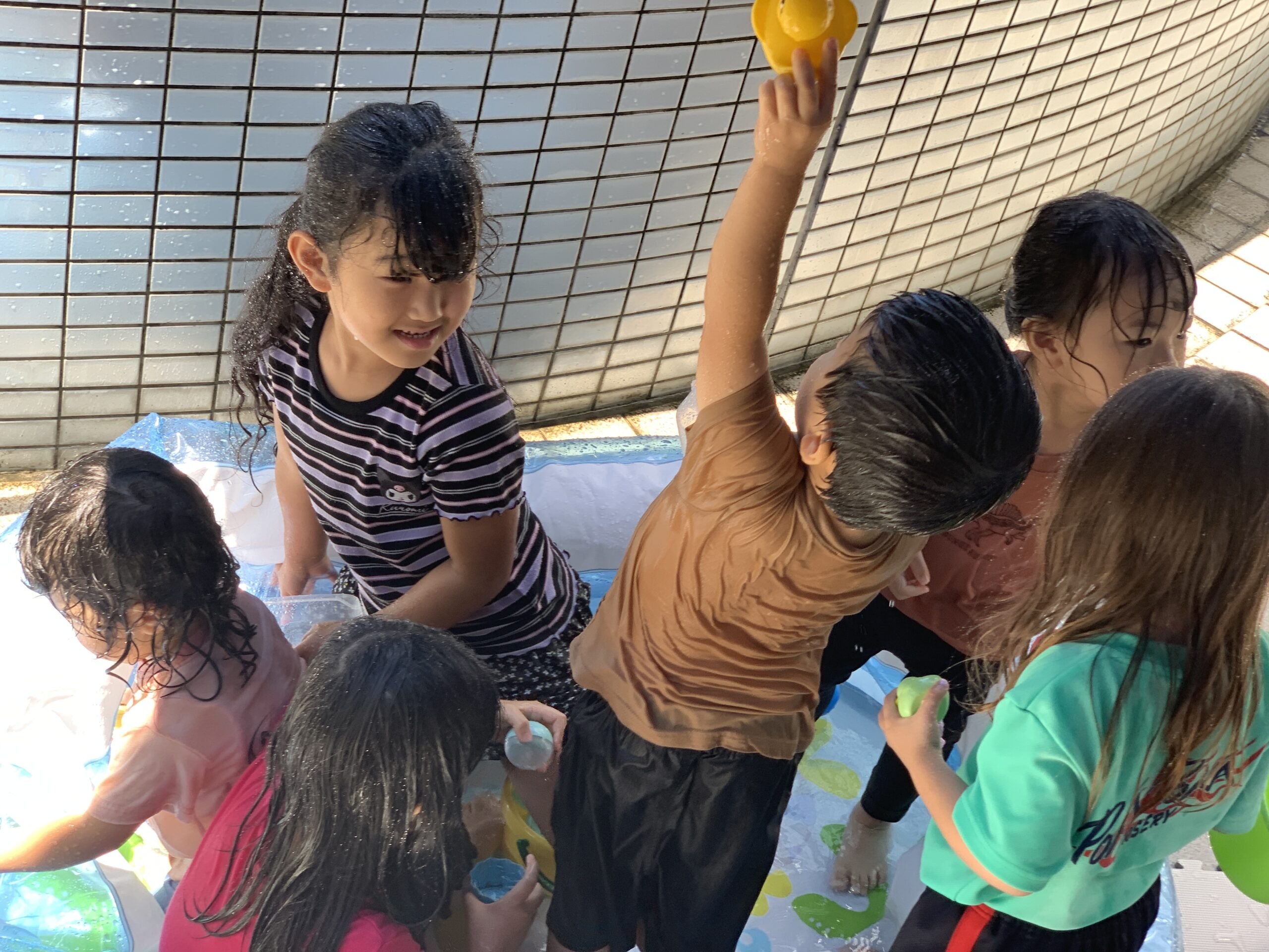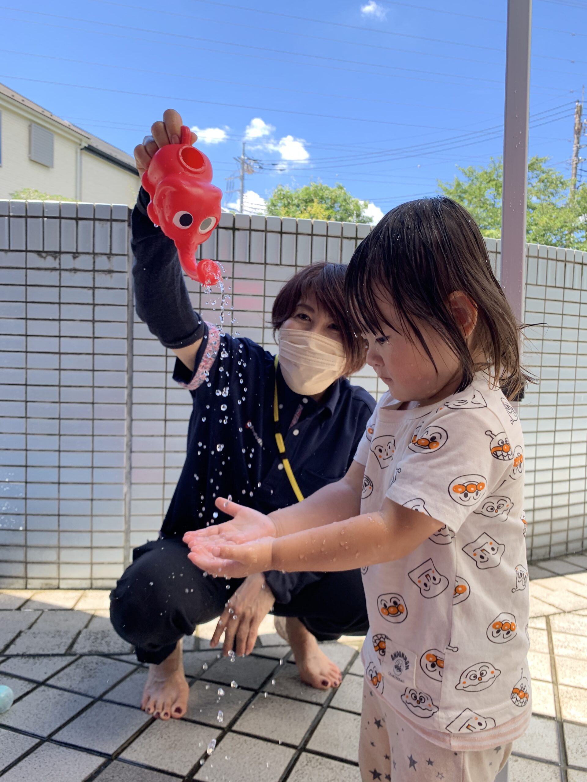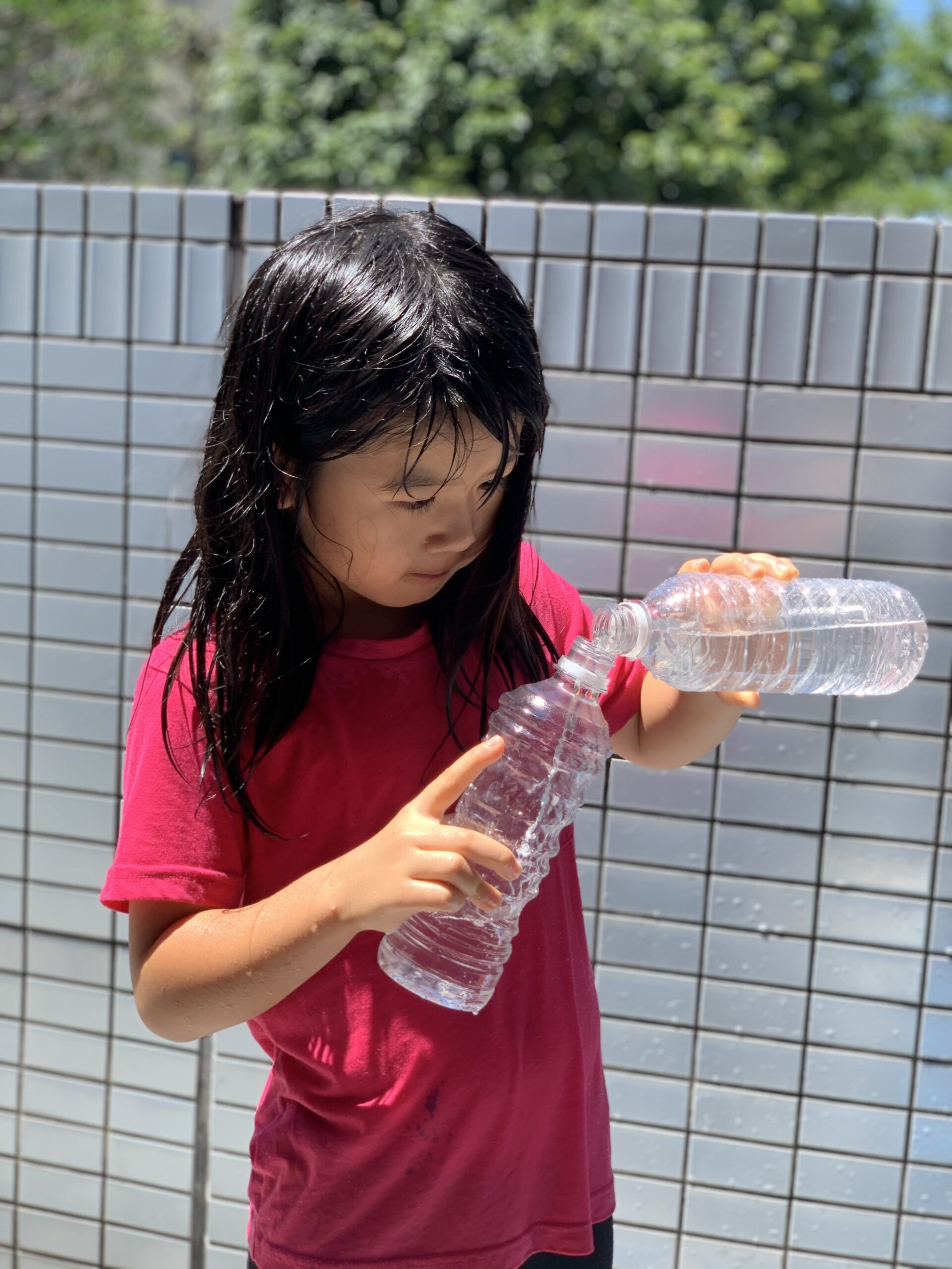 青空組のお兄さんお姉さんは、ペットボトルを使ってダイナミックに遊び、小さい子の頭にそっと水をかけてあげたり優しさを見せていました♡