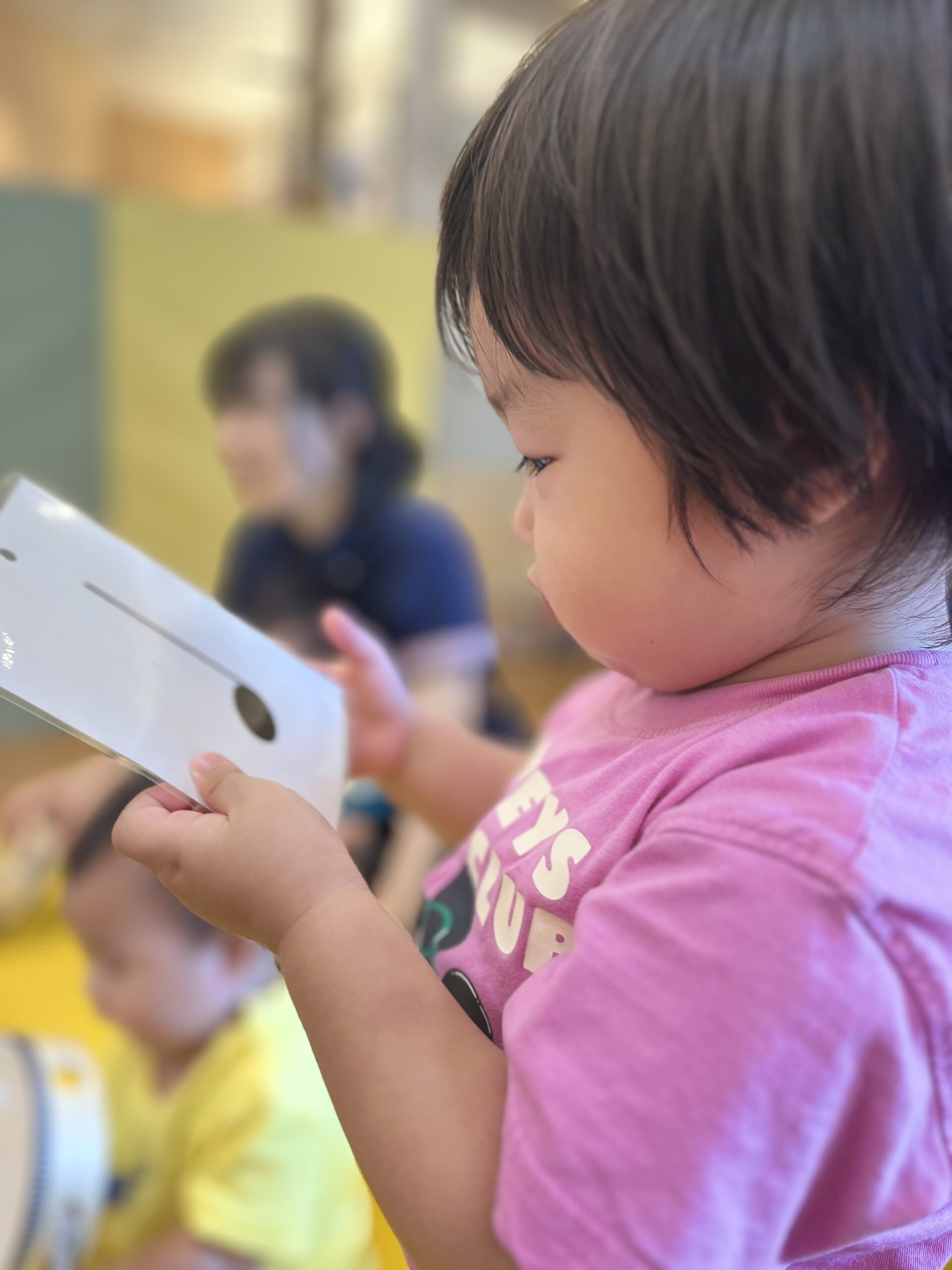 みんな、音符のカードに興味津々。なんだろなんだろー?
