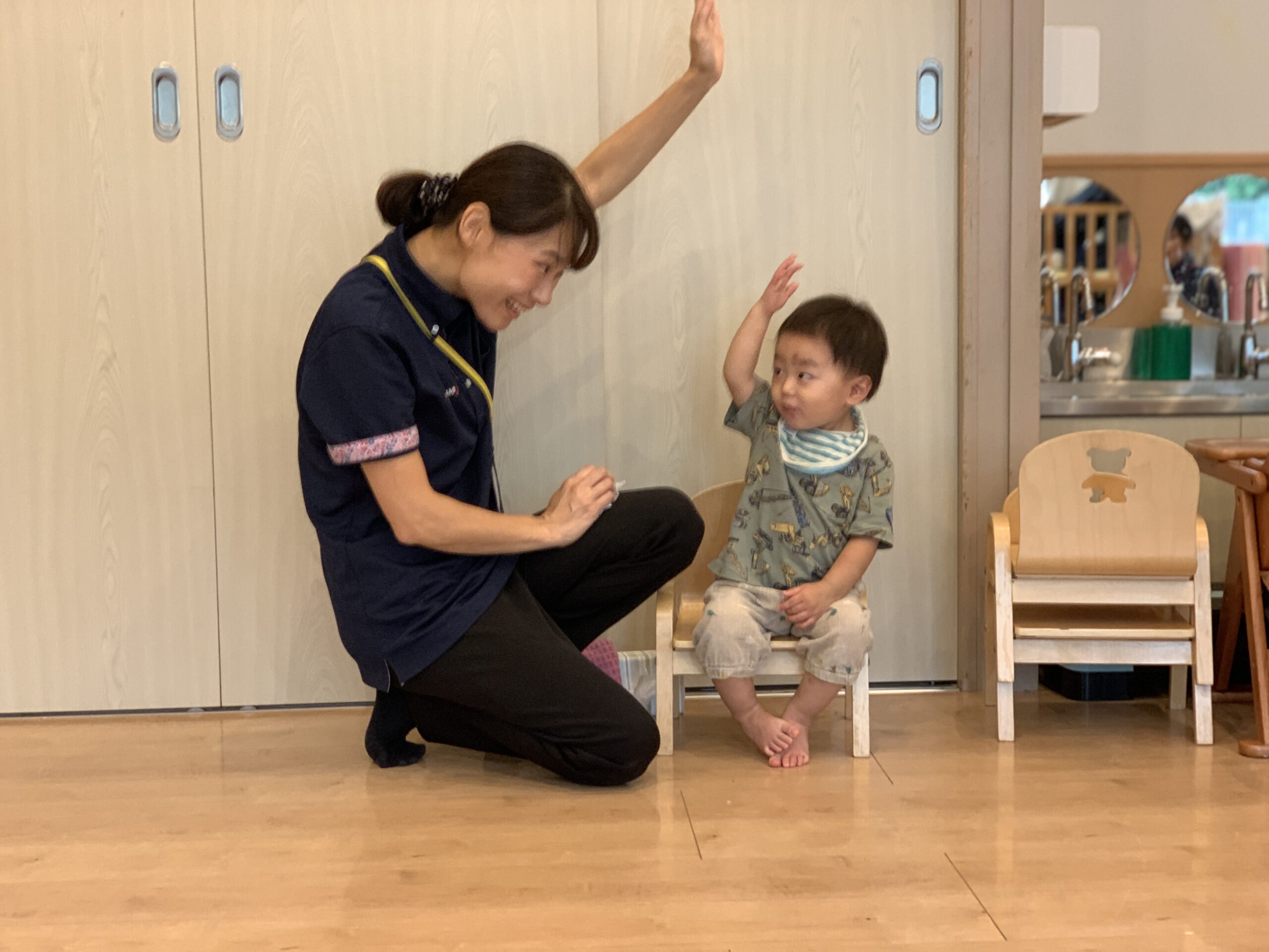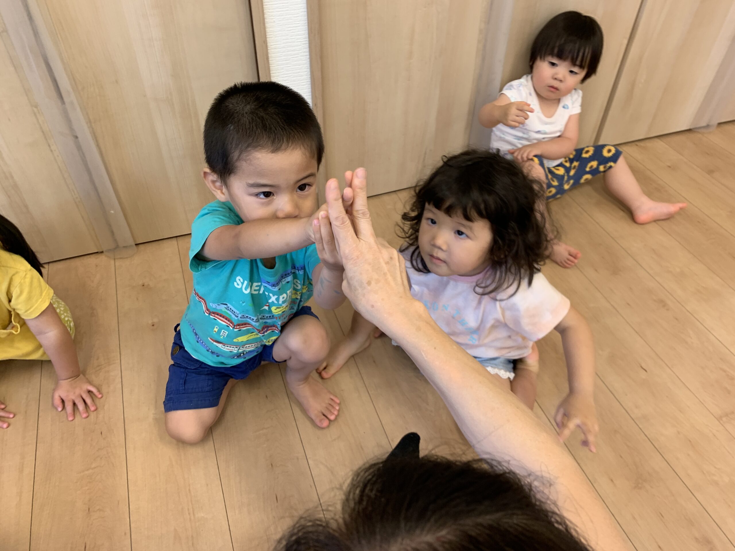 活動は運動遊びと室内遊びを中心に行いました。公園に出かけ、自然の光と風を感じながら砂遊びや先生とのふれあい遊びを楽しみました。
