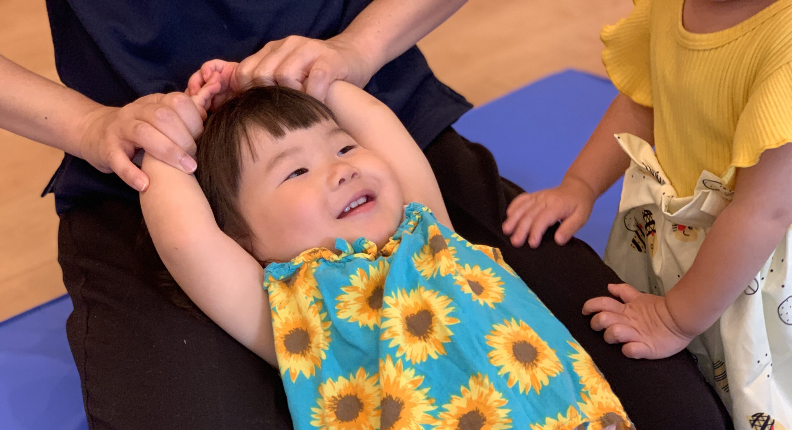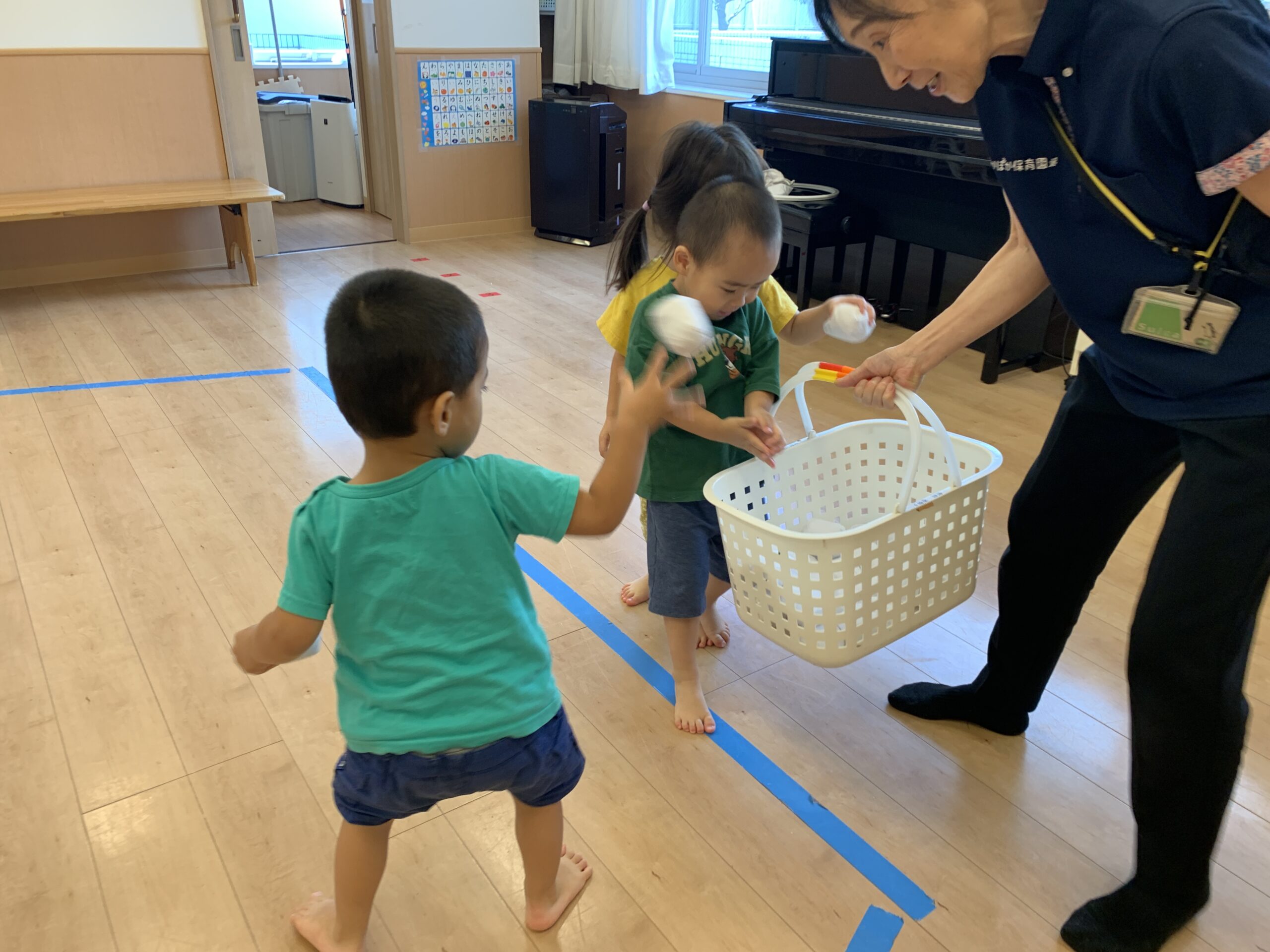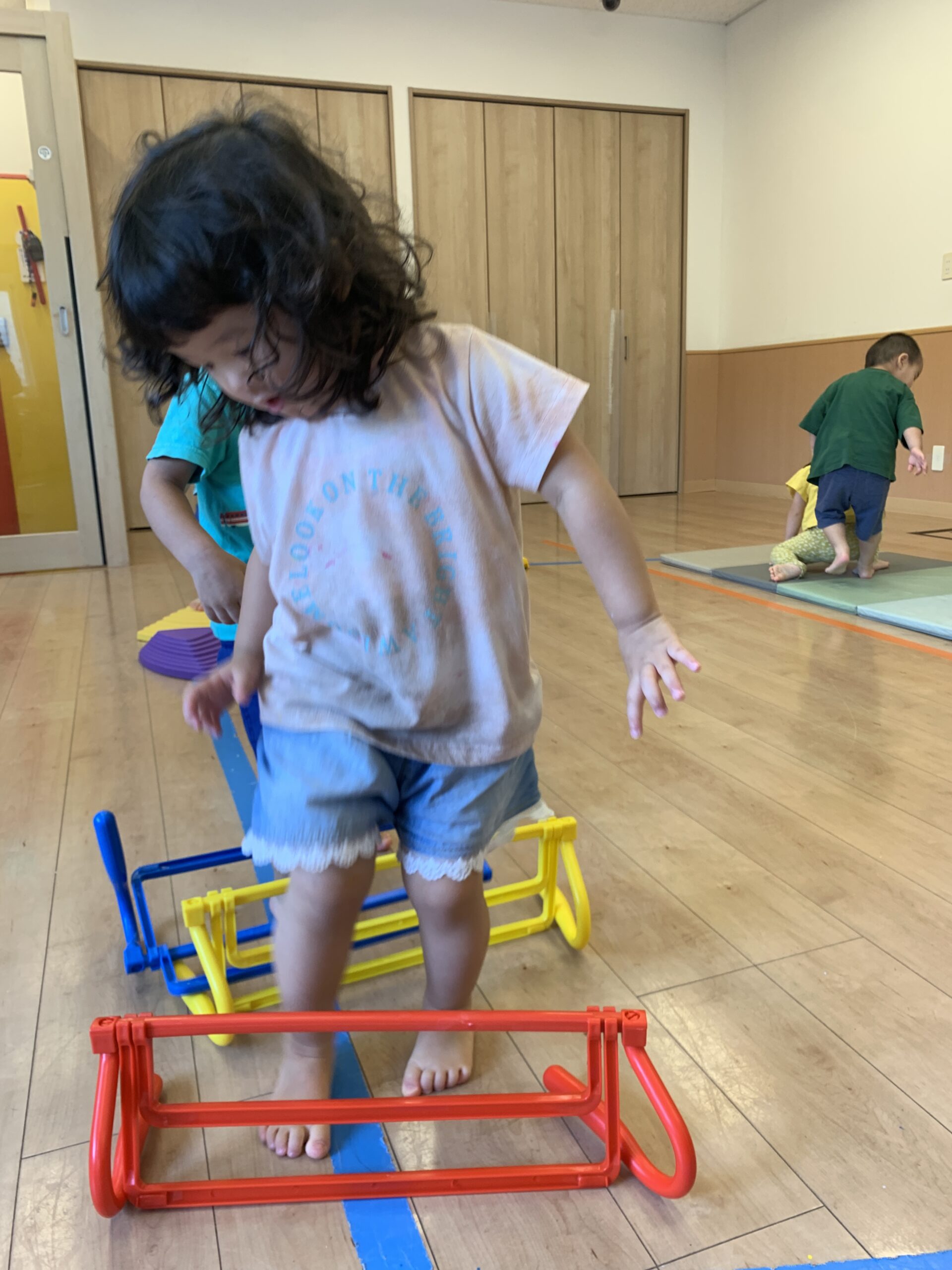 虹組はお部屋で体操遊びに挑戦し、球拾いや平均台を使ったバランス遊びにも取り組みました。それぞれが年齢や発達に合った運動を経験できるよう配慮しています。