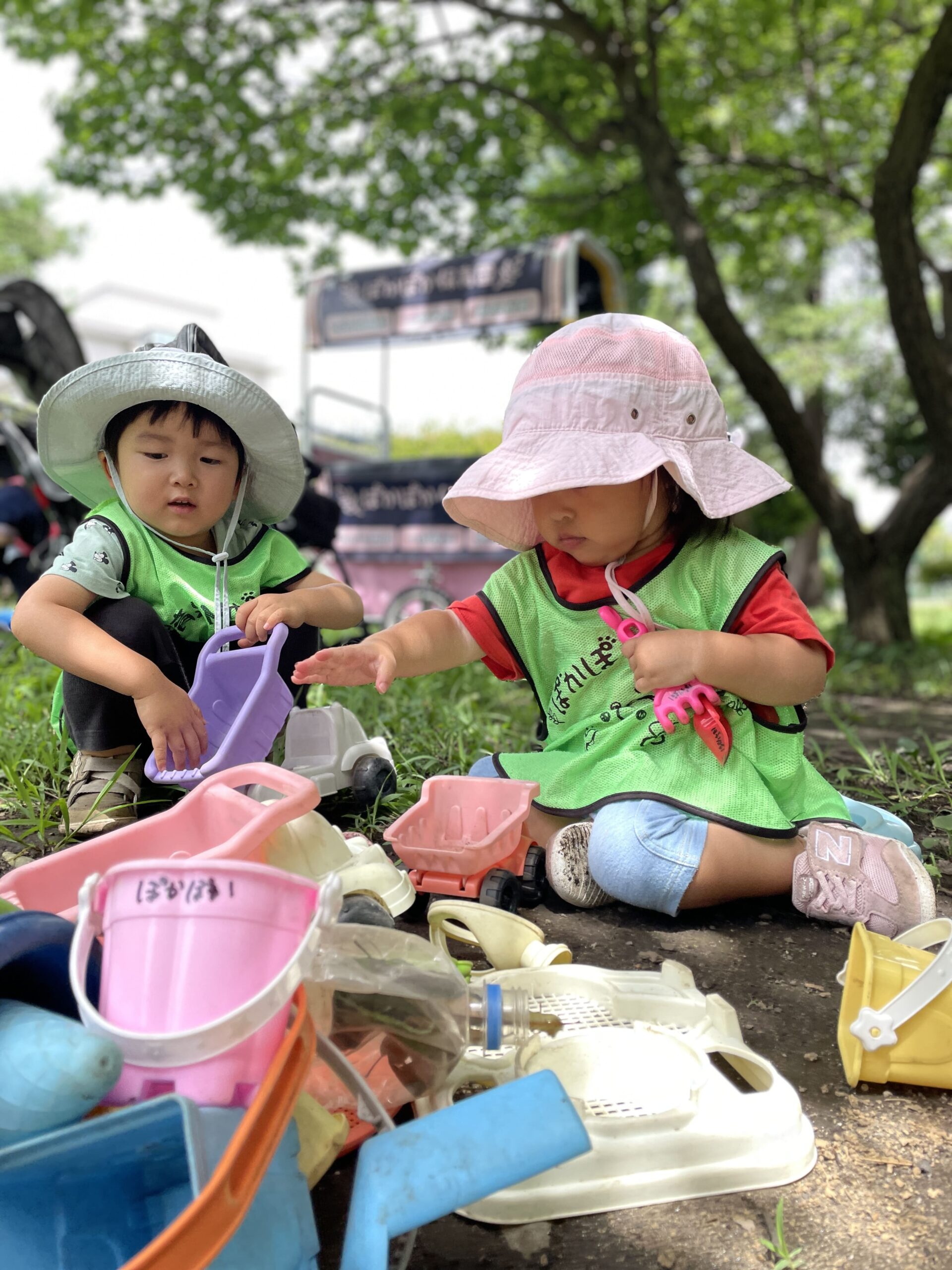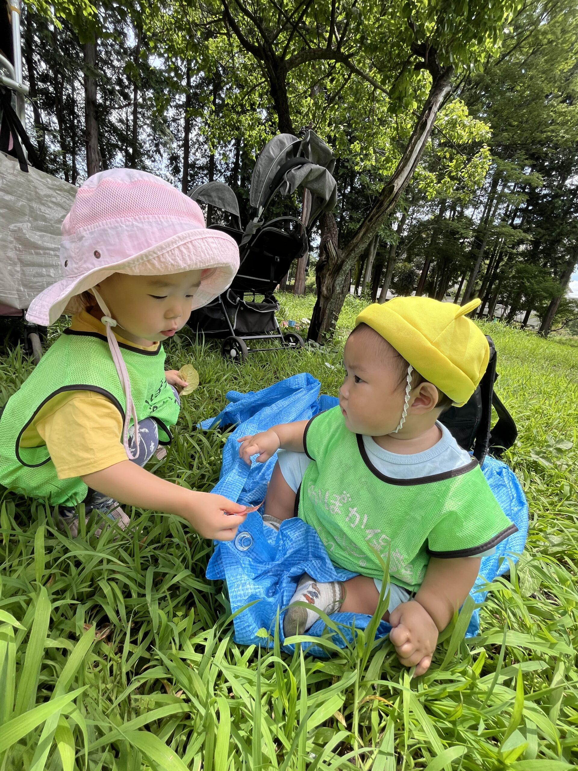 砂遊びのおもちゃを草むらでも創造的に使いこなす姿からは、子どもたちの豊かな発想力が感じられました。「これなあに?」「みてみて!」と新しい発見に目を輝かせる表情は、大人も思わず笑顔になる瞬間です。活動後には全員で日陰に集まり、水分補給をしっかりと行いました。