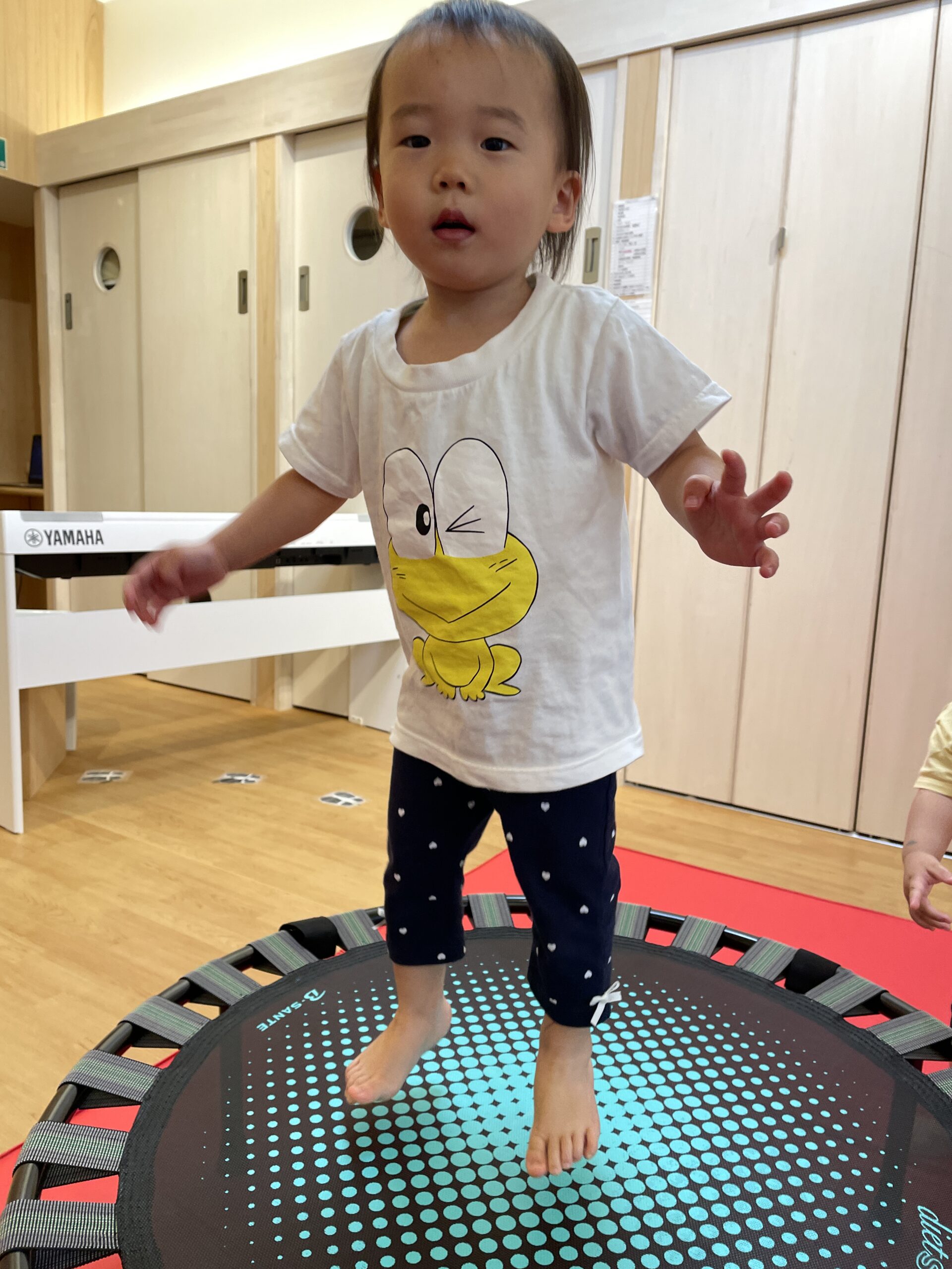 1歳児はトランポリンでピョンピョン跳ねる楽しさを全身で表現していました。