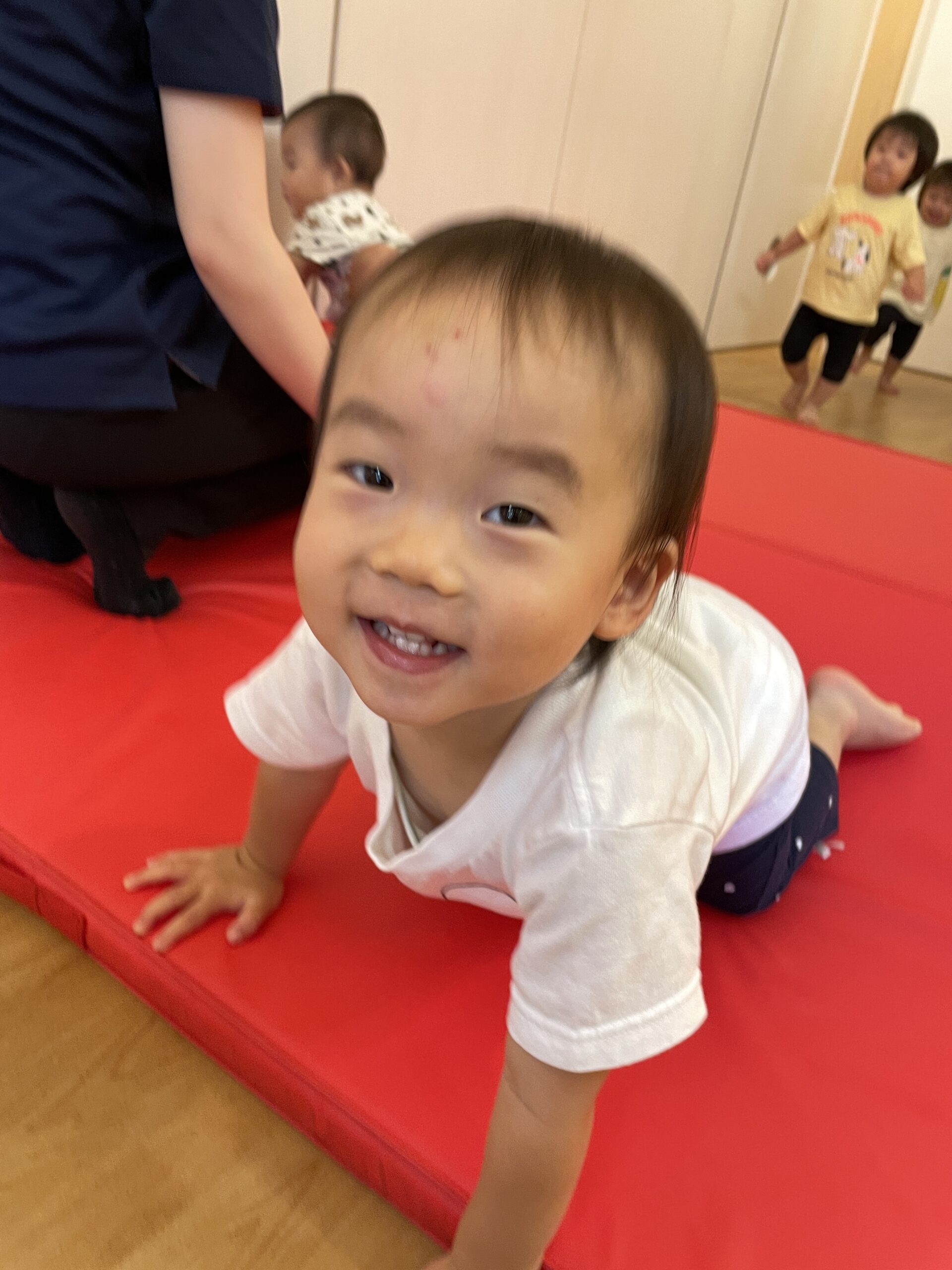 ハイハイでトンネルに挑戦する0歳児も、「できた!」の達成感に満ちた表情。