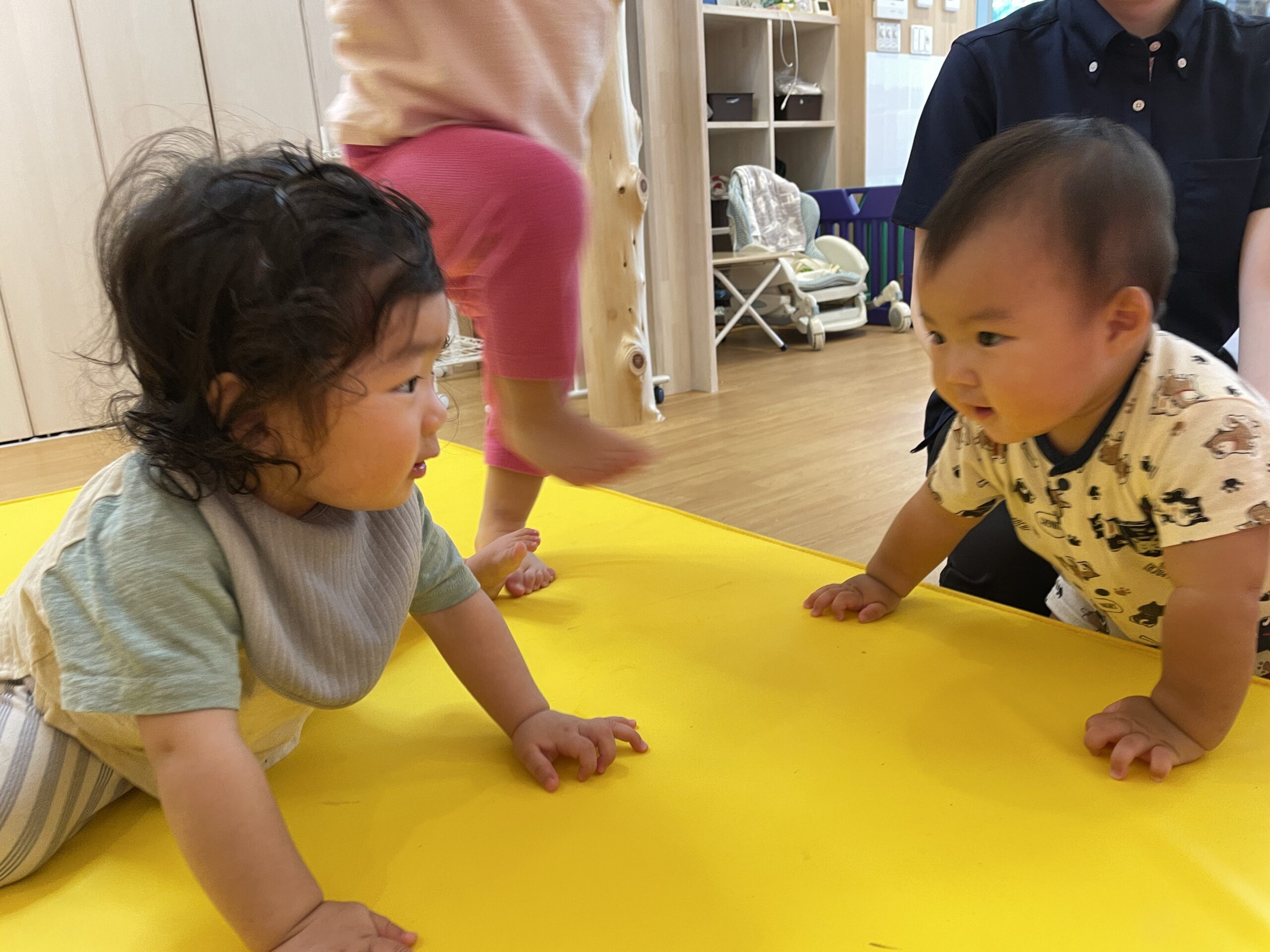 今日のメインは、2歳児の交流ダンスと、0〜1歳児の安田式体育遊び!