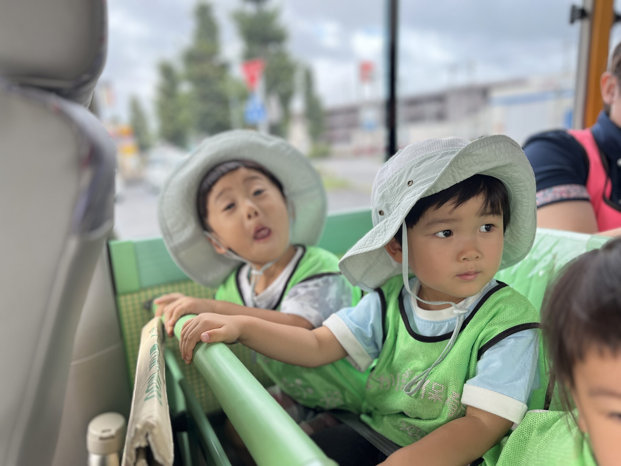 2歳児: 黄色のバスに乗って「いってきまーす!」と元気に出発した子どもたち。