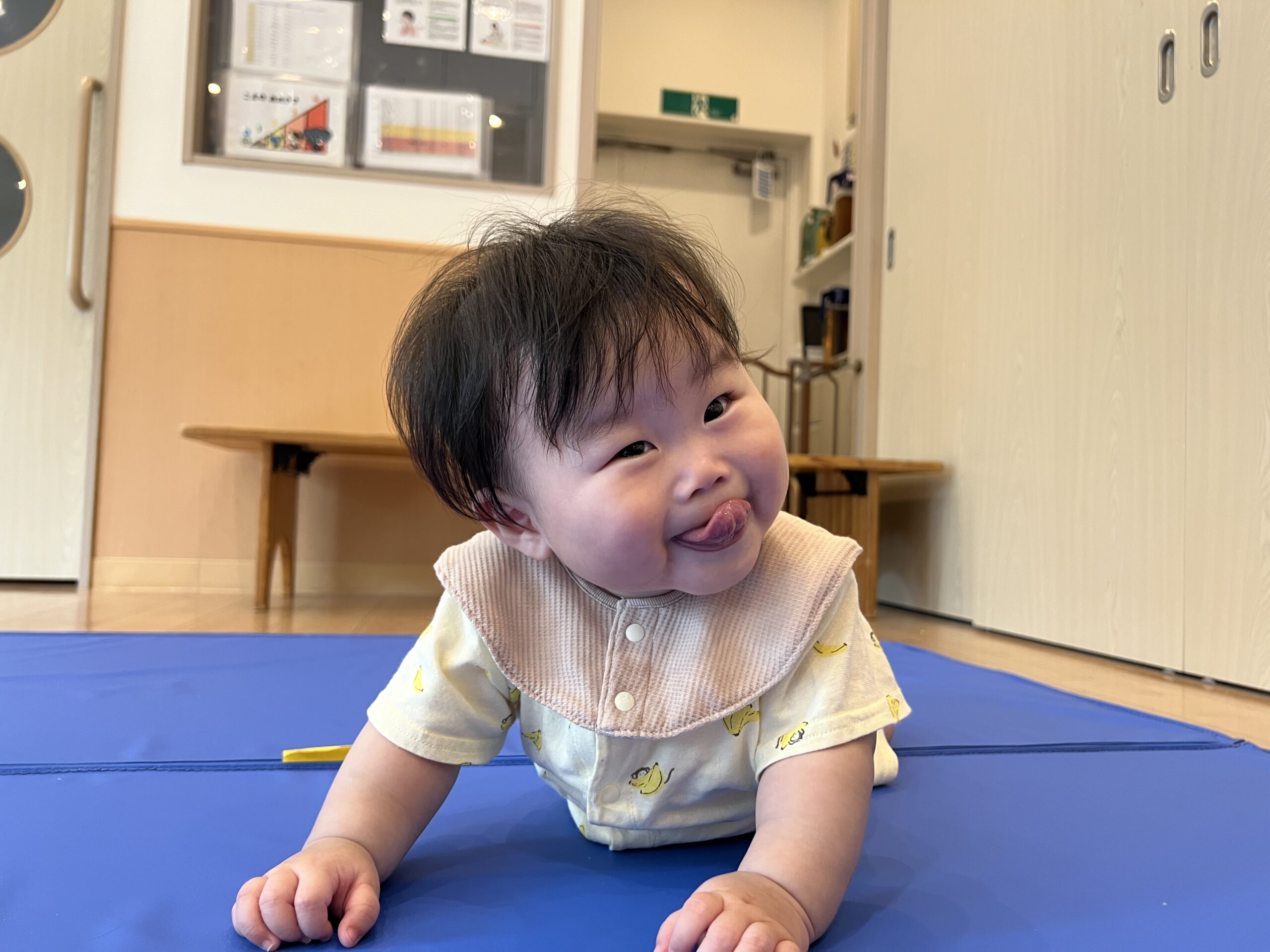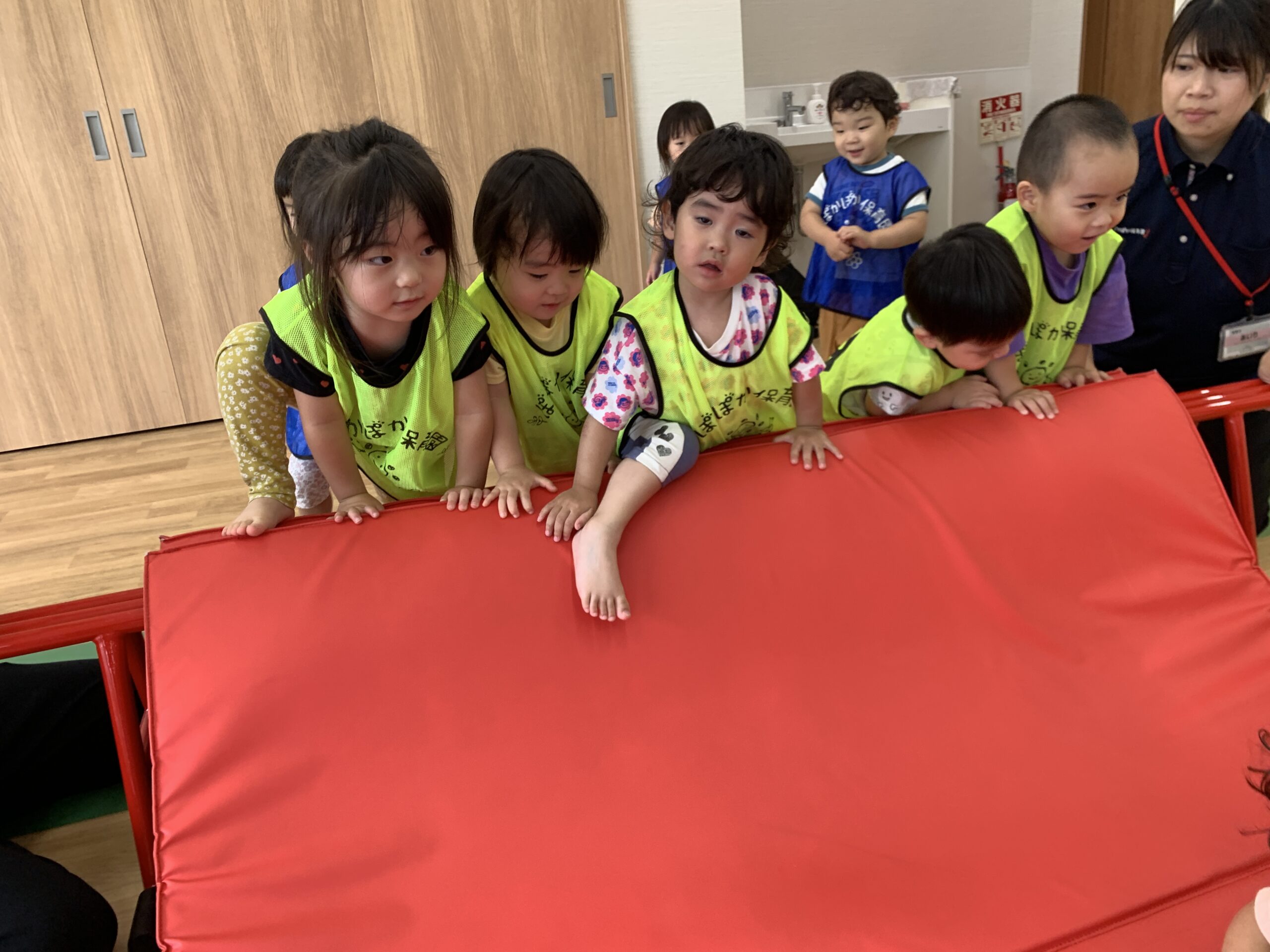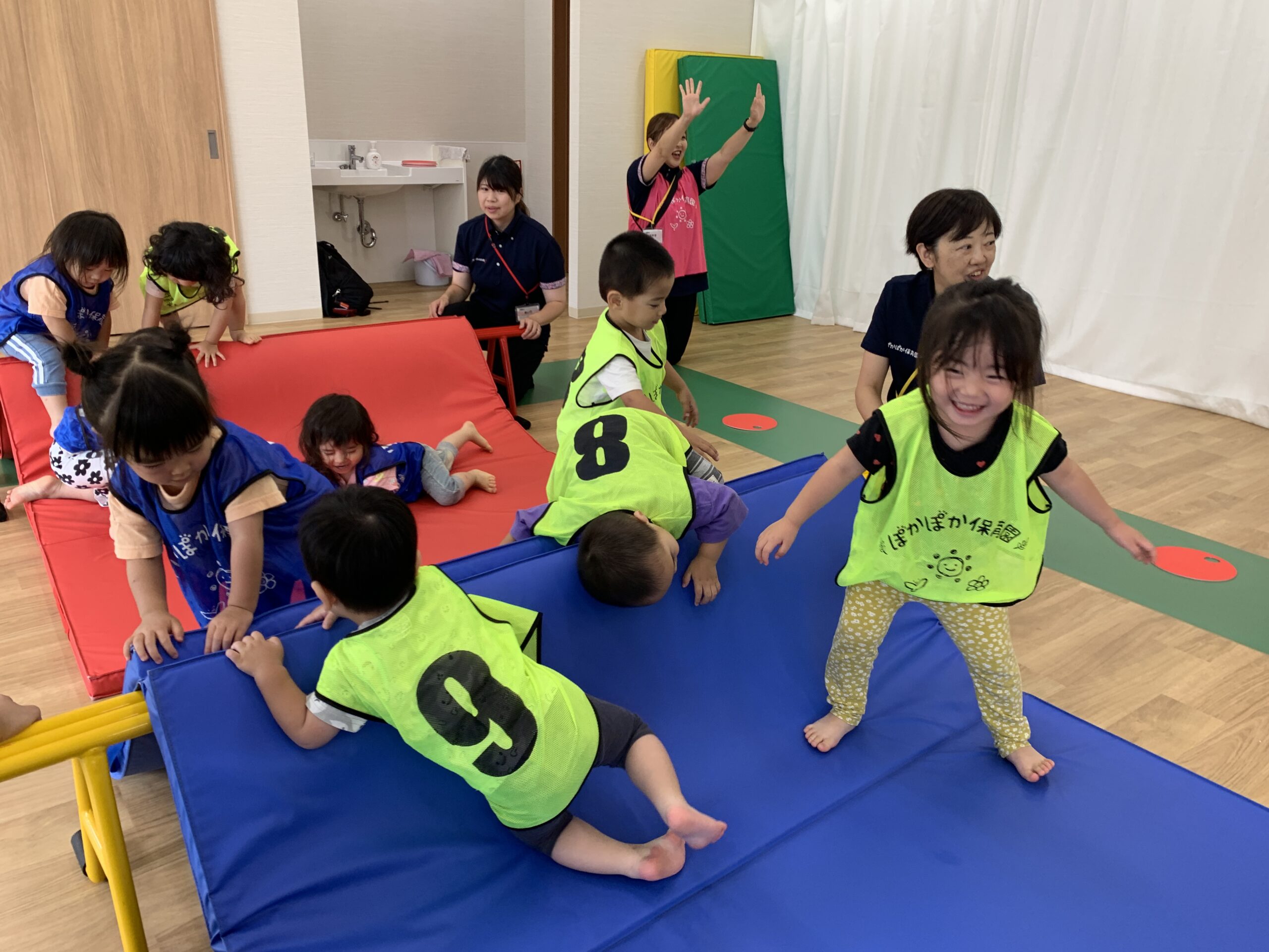 運動遊びでは、マットやトンネルを使って、雨の日でも室内で元気よく身体を動かしました。