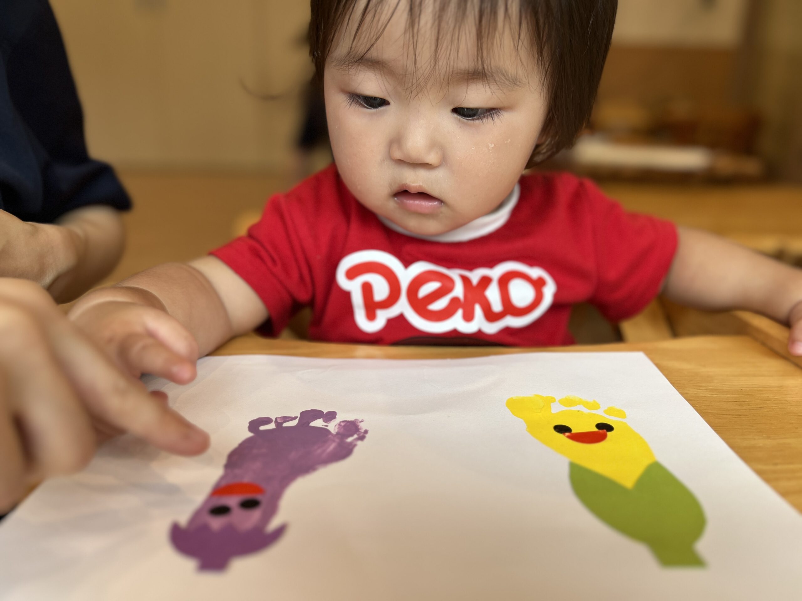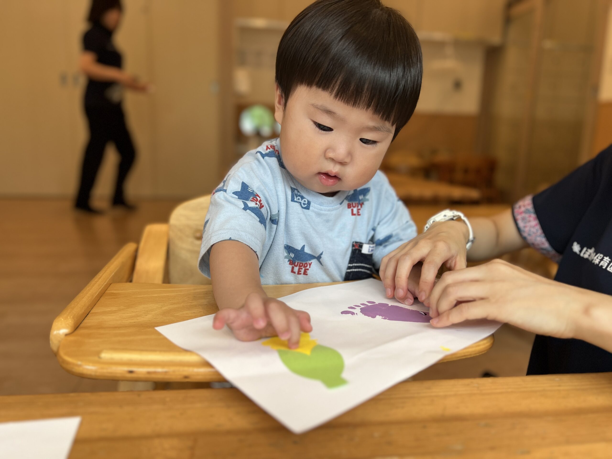 製作では、昨日とった足形に目や口のシールを貼ってお顔づくり。それぞれのお顔ができあがると「わぁ!かわいい!」と大喜び。嬉しそうに先生や友だちに見せる姿もありました。