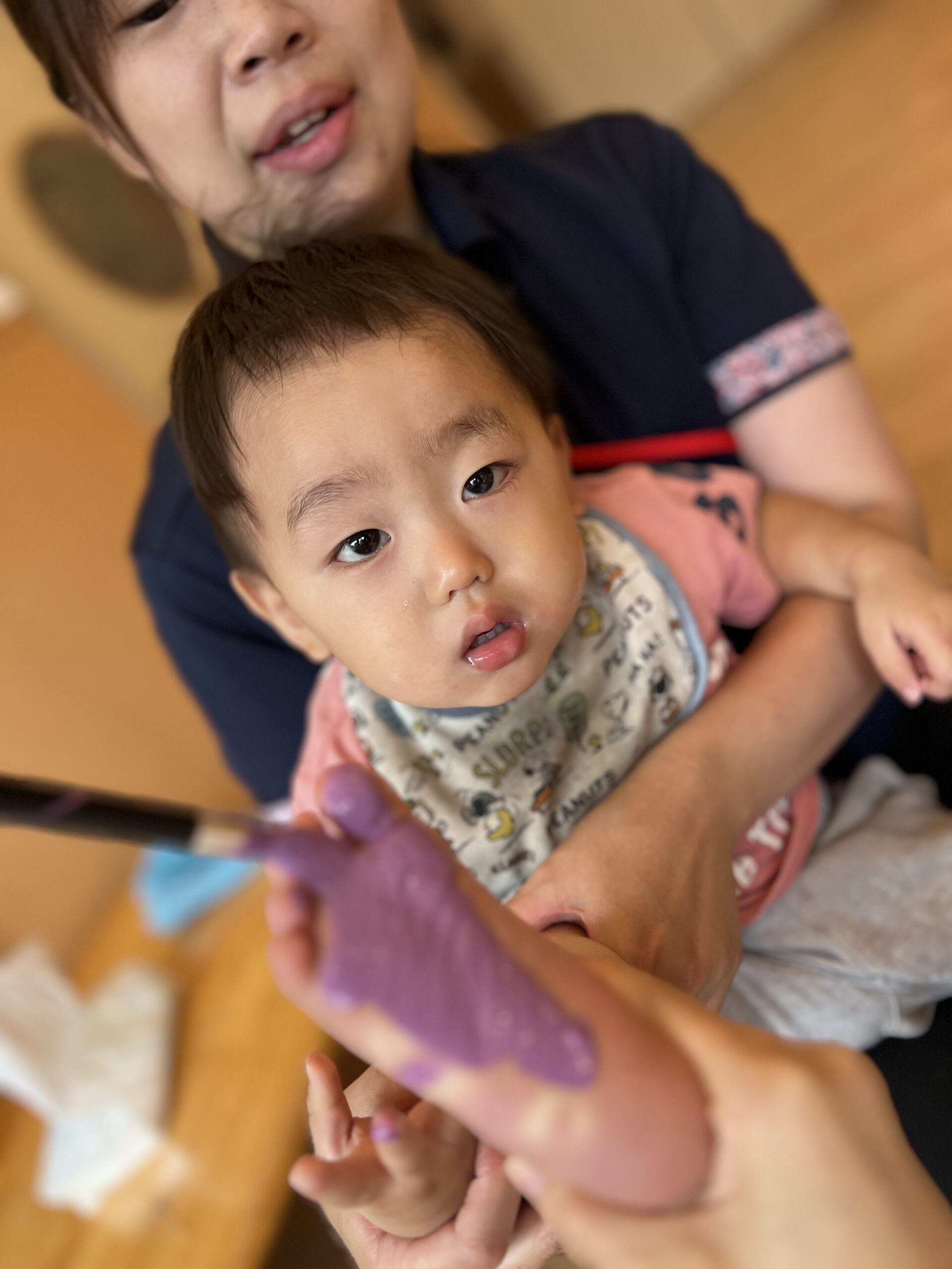 絵の具を足に塗ると「くすぐったいね」「なにこれ?」と不思議そうにじっと見つめる様子もありました。