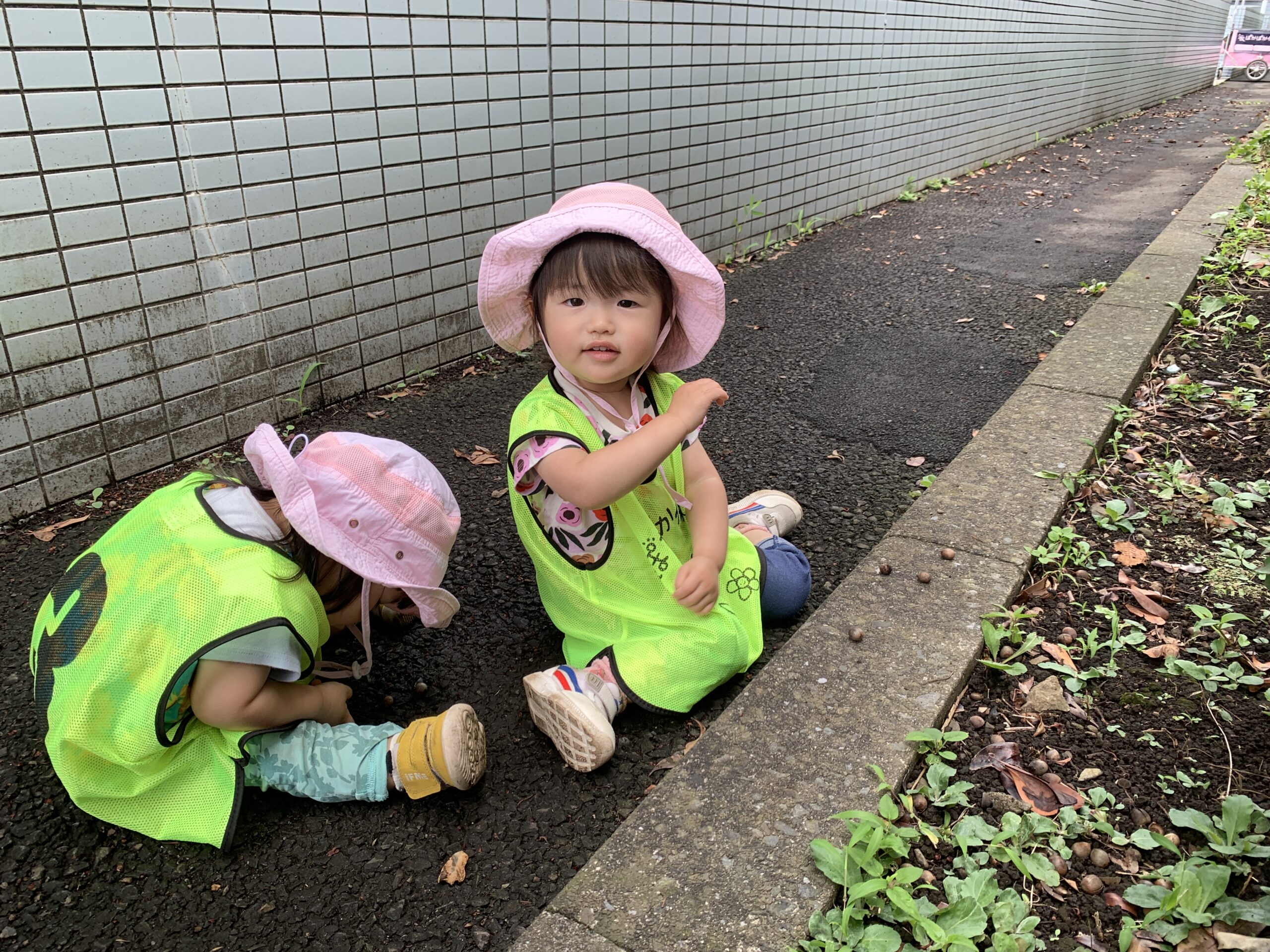 テラス遊びでは、どんぐりを見つけては「こっちにもあった!」とお友だちと一緒に並べてみたり、フェンスの向こうを走る車やトラックに「大きいね!」と目を輝かせていました!