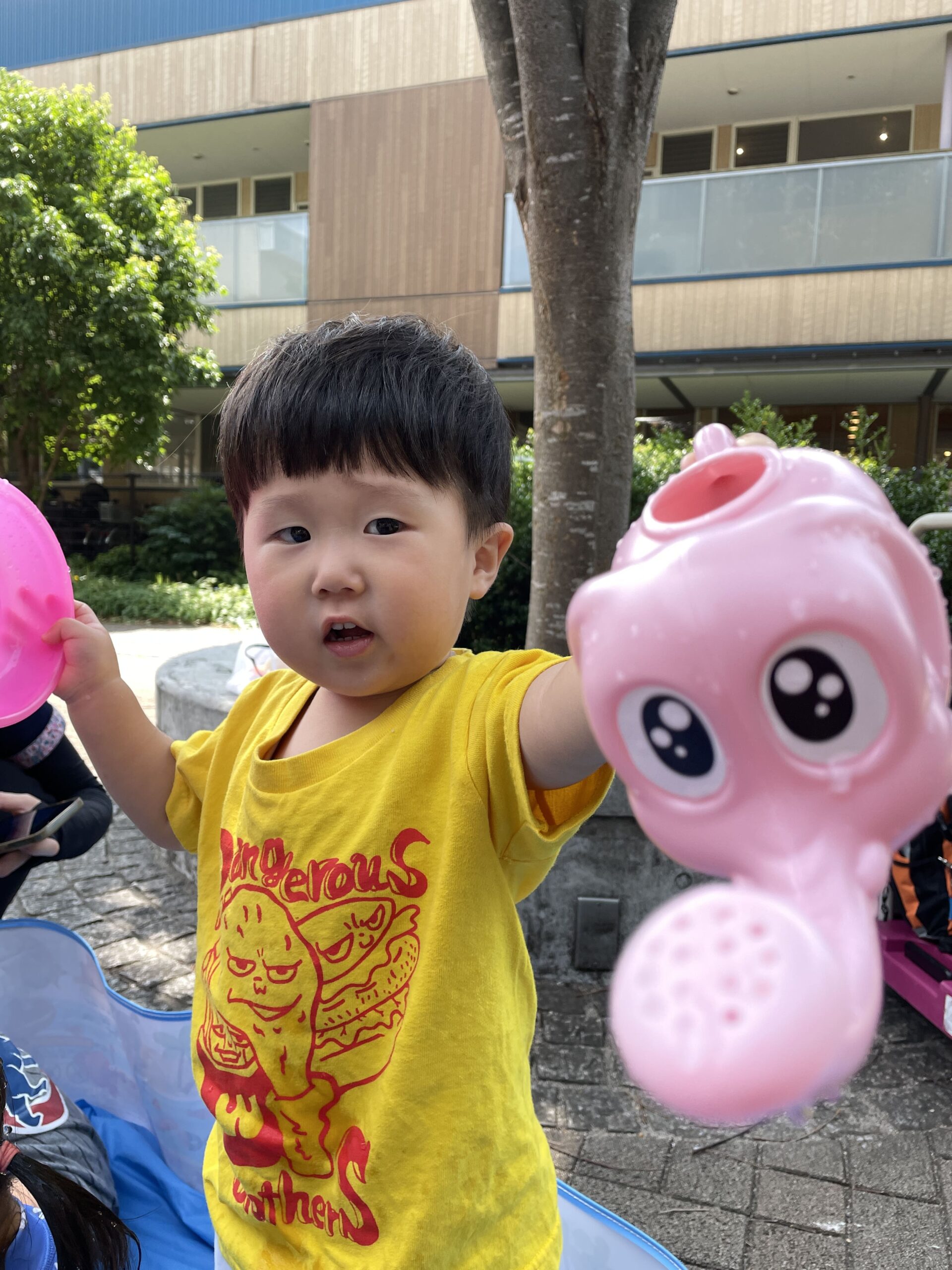 ばしゃばしゃっとお水をかけられたお友だちは「きゃー!たのしい!」と声をあげて大喜び。それを見た男の子もにこにこに――なんと「楽しい気持ち」がまるごとうつったようで、そのあとは自分からどんどん水遊びを楽しめるようになったんです!