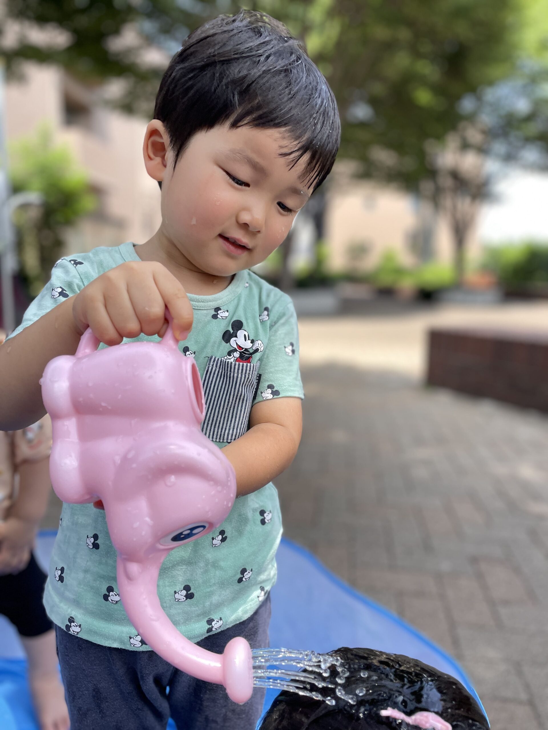 水が大好きなお友だちに「ぞうさんジョウロをかけてあげて~」と誘われ、少し緊張しながらもチャレンジ。
