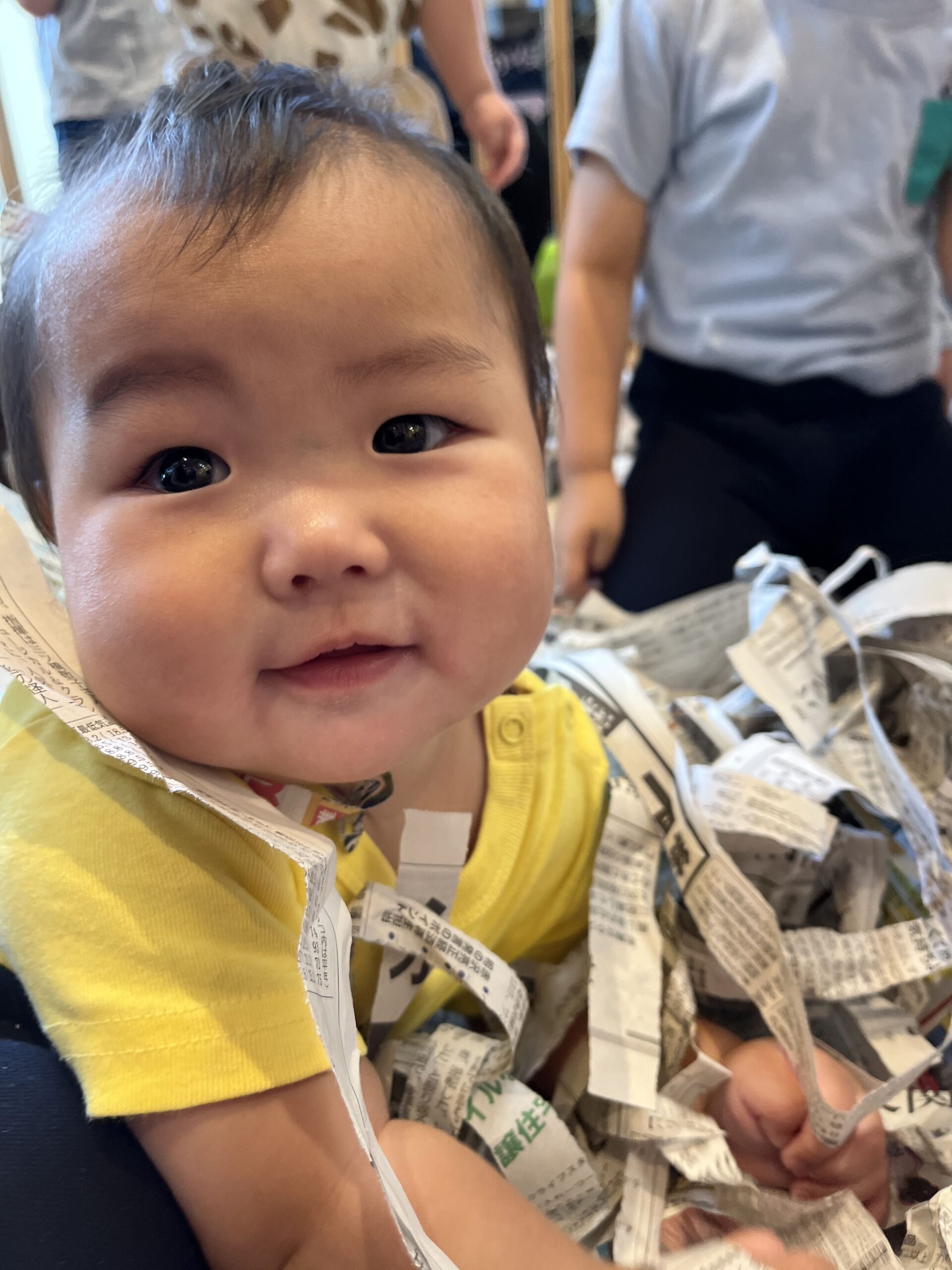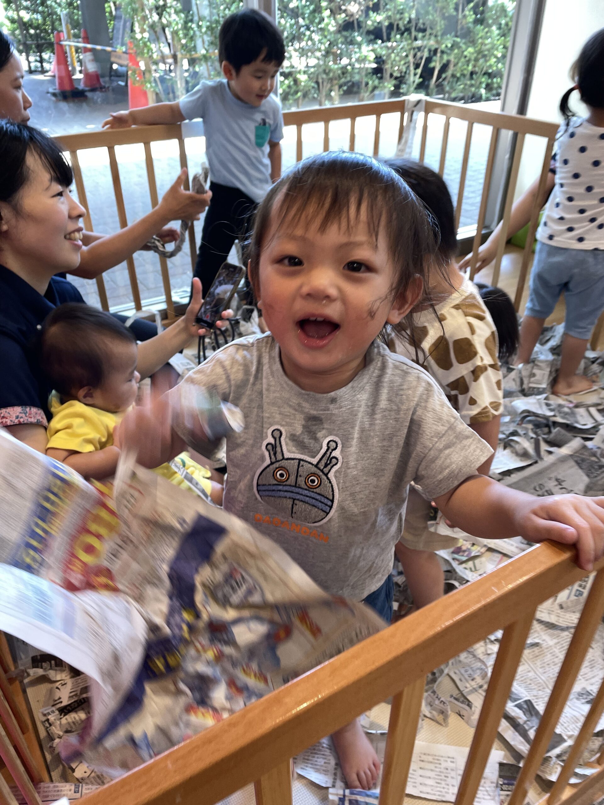 お日さまいっぱいのテラスから戻ったあとは、保育室で新聞紙遊び。みんなで「ビリビリ」「くしゃくしゃ」と豪快にちぎった新聞紙は、たちまち楽しい“しんぶんしのお風呂”に。