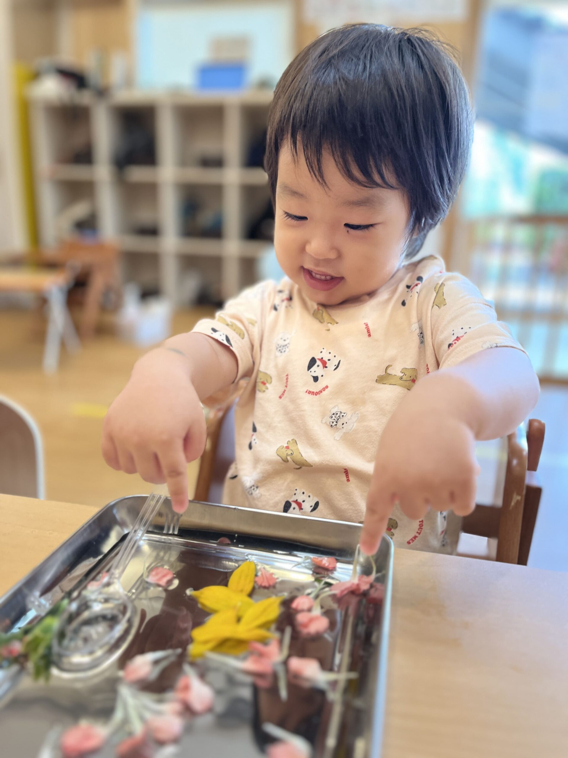 そのあとは先生と一緒に花びらをちぎって、水に浮かべる実験。「うかんだ!」「わぁきれい!」と、じっと水面を眺める子どもたち。ひとつひとつ浮かぶ花びらが、それぞれの子どもの心にも新しい発見を運んだようです。