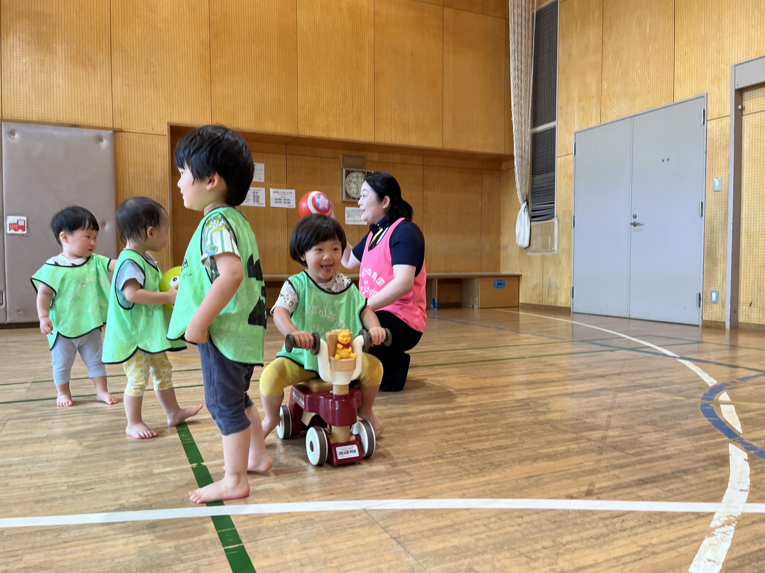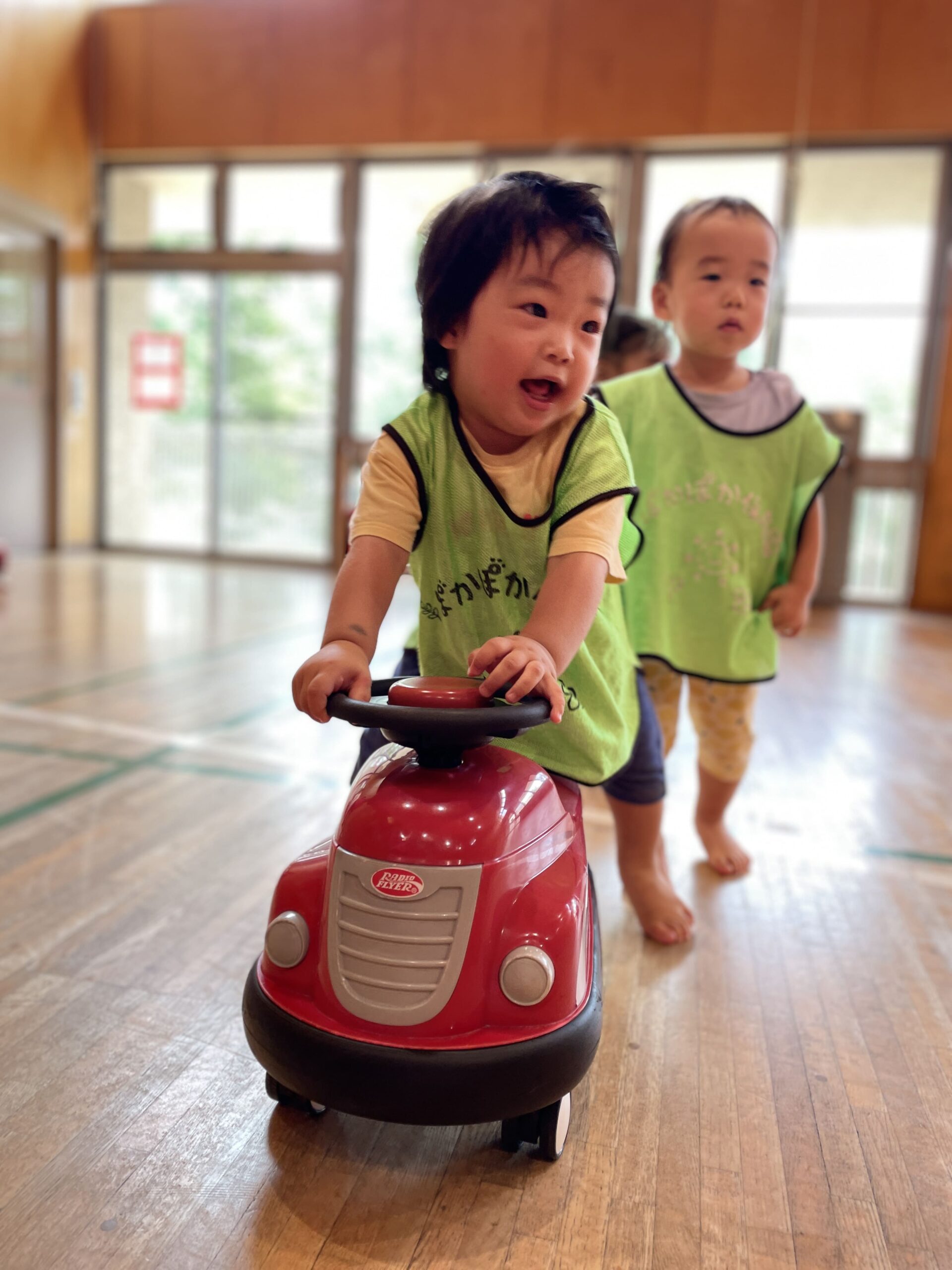0歳児のBちゃんが「のりたい」と指をさしたので、「順番だからね」とやさしく見守っていると、2歳児のCくんが「はい、どうぞ」と車を譲る場面も。“思いやり”や“社会性”の芽が育つ瞬間に感動しました。このような手厚い保育、一人ひとりの心の成長も私たちの大切にしている価値です。
