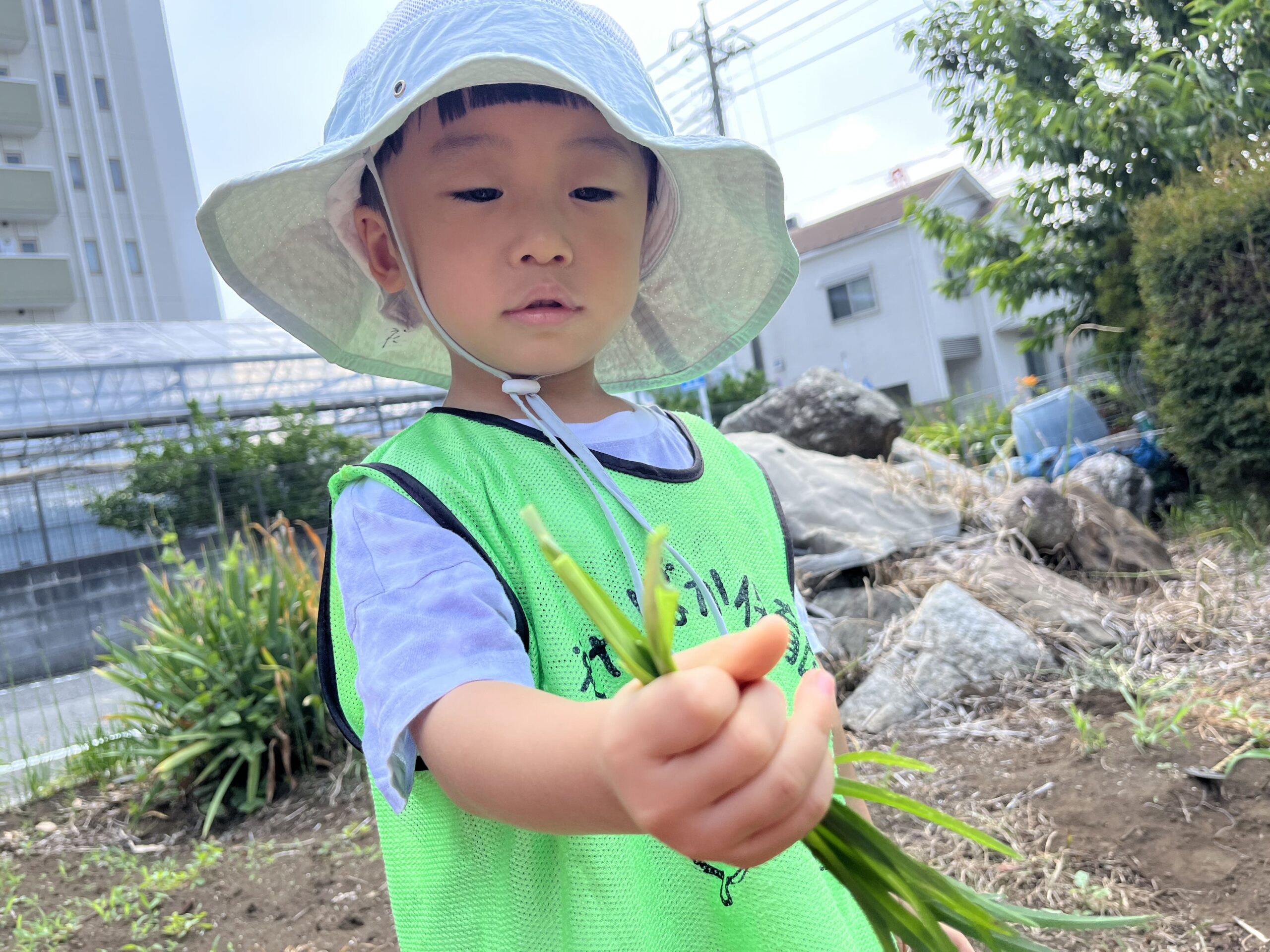 「みて!ぬけた!」と、大喜びで両手いっぱいに雑草を見せてくれる姿は、この年齢ならではの驚愕のエピソードでした。「すごいね!」と褒めると、まわりの子どもたちも「ぼくもやる!」とさらにやる気を見せてくれ、自然の恵みや収穫する喜びをみんなで体験できました。