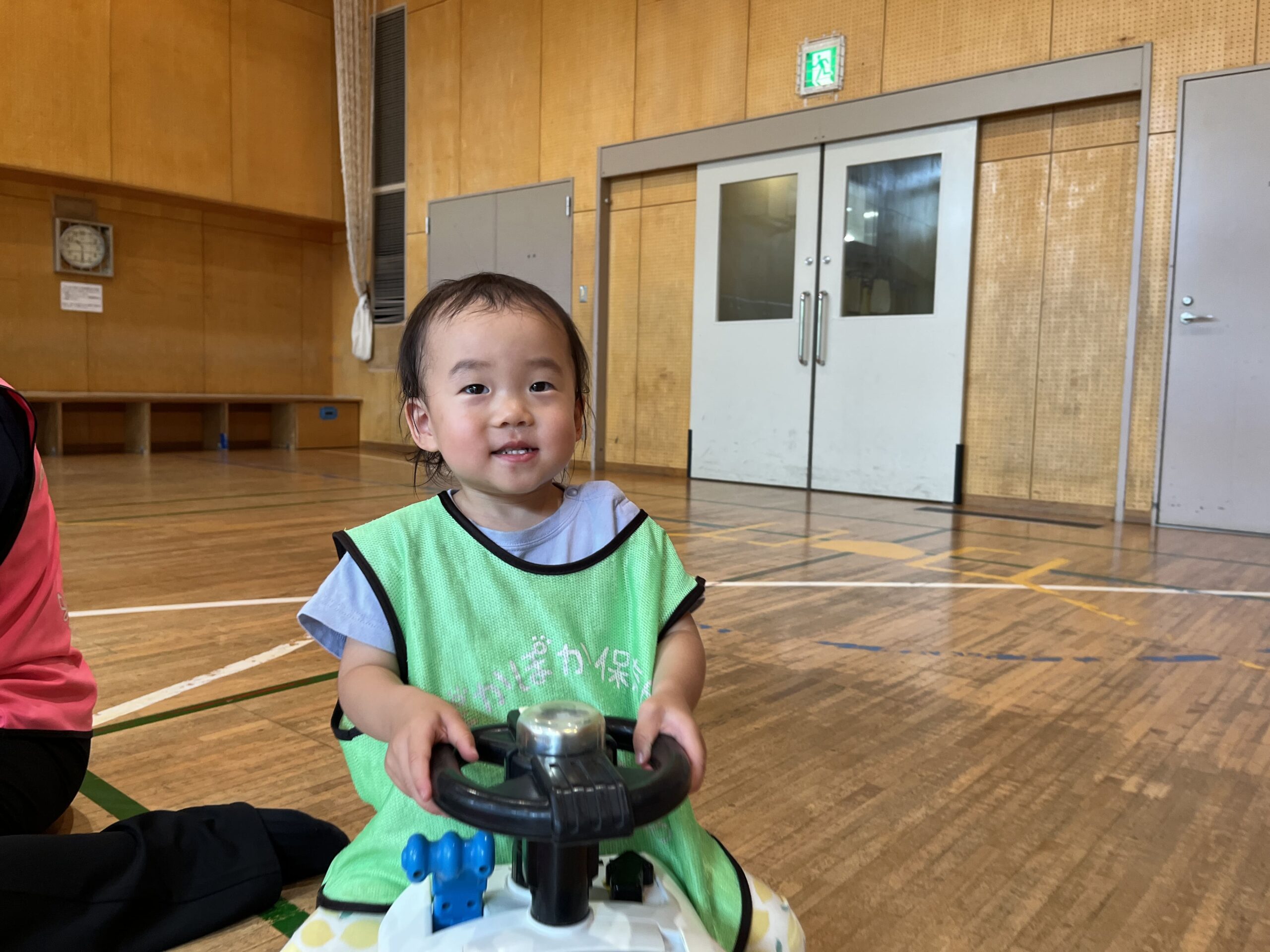 中でも今日は車のおもちゃが子どもたちの人気ナンバーワン。「ブーブー!」と小さな手でハンドルを回したり、お友達と順番を守りながら楽しむ様子が、児童館いっぱいに広がりました。