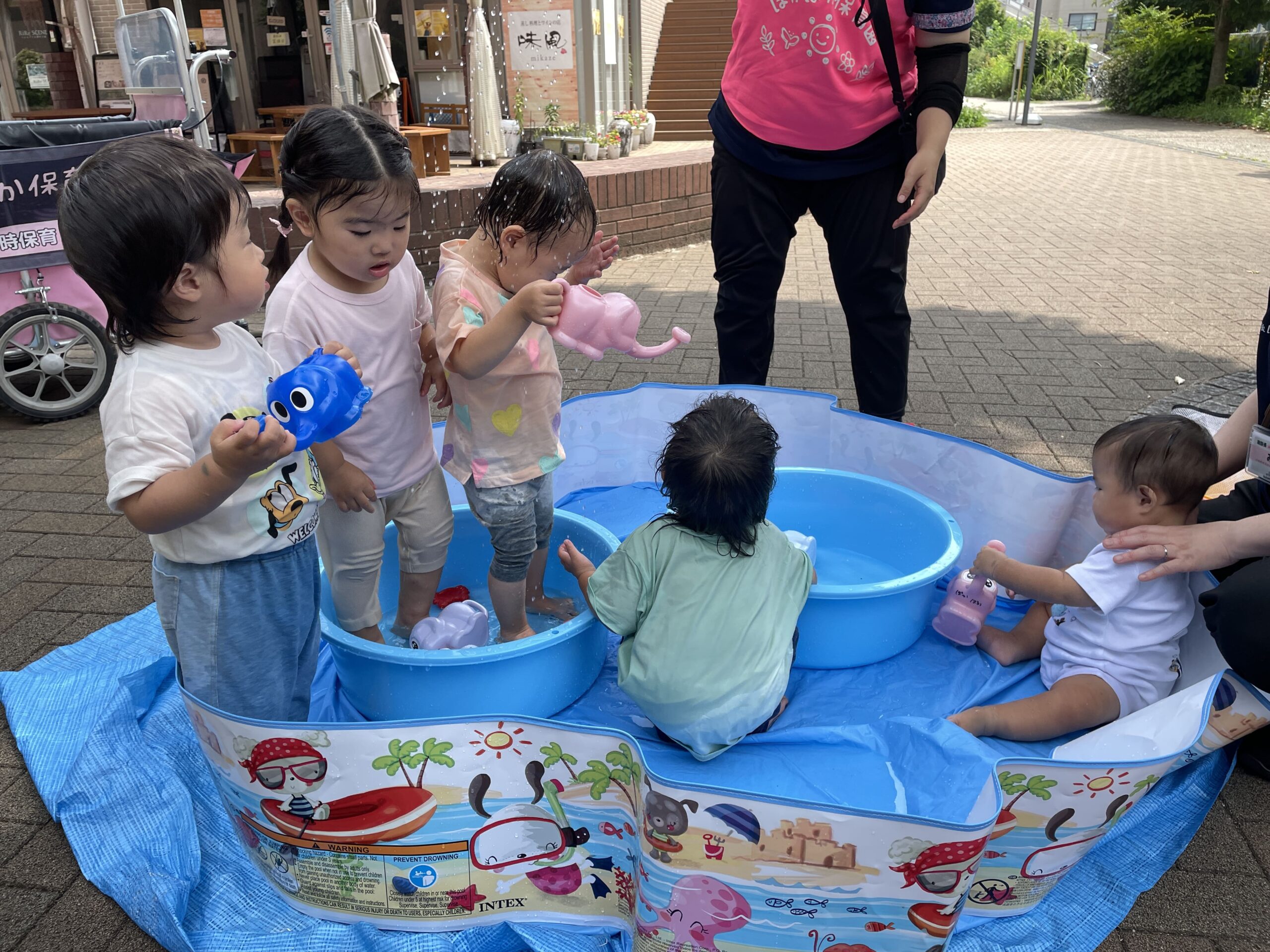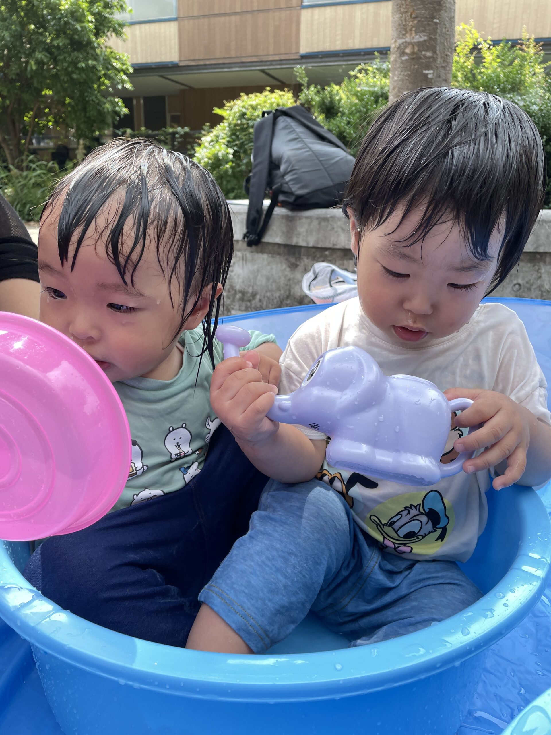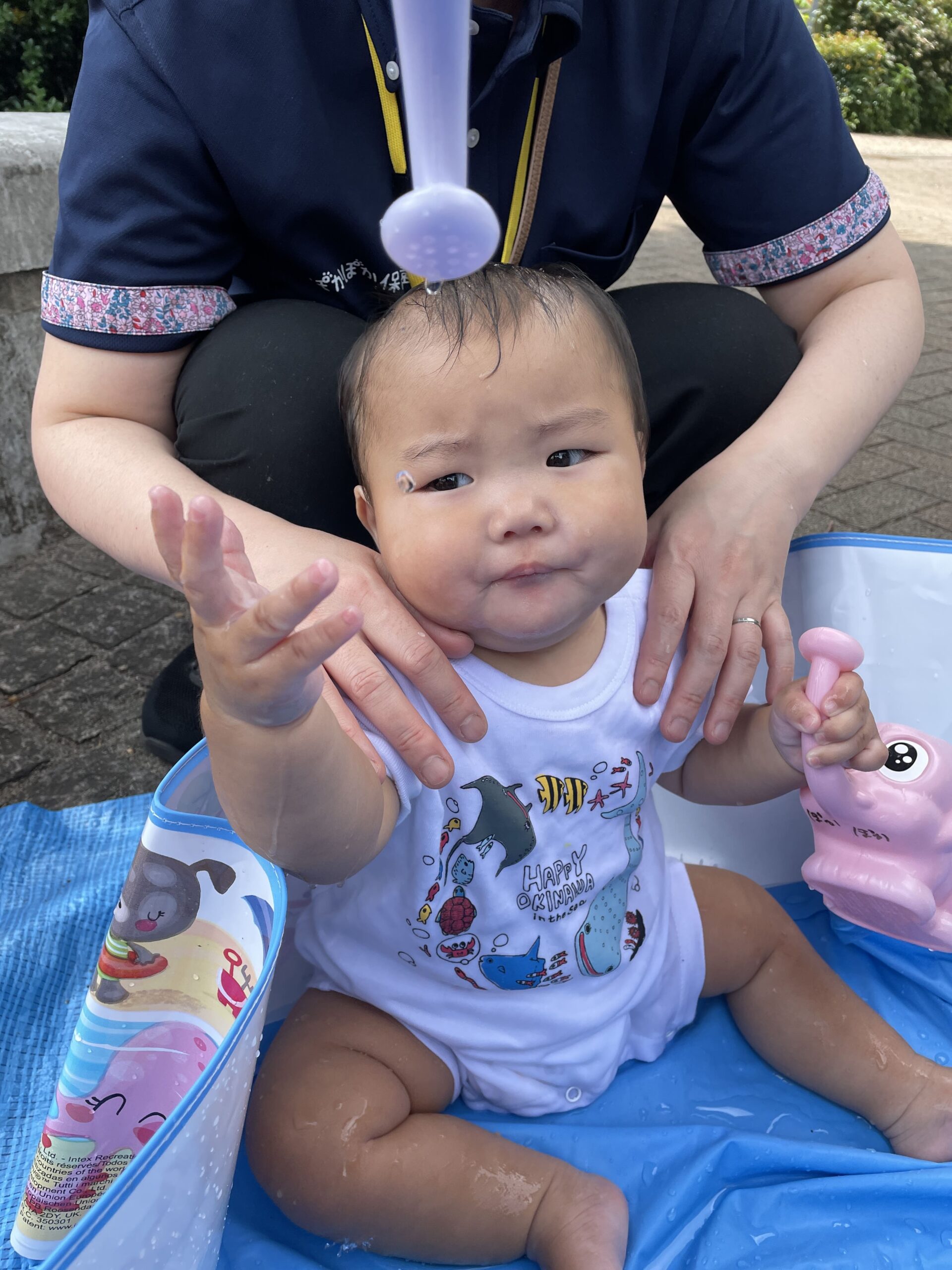 一方テラスでは、0〜1歳児クラスの水遊びが大盛り上がり!
