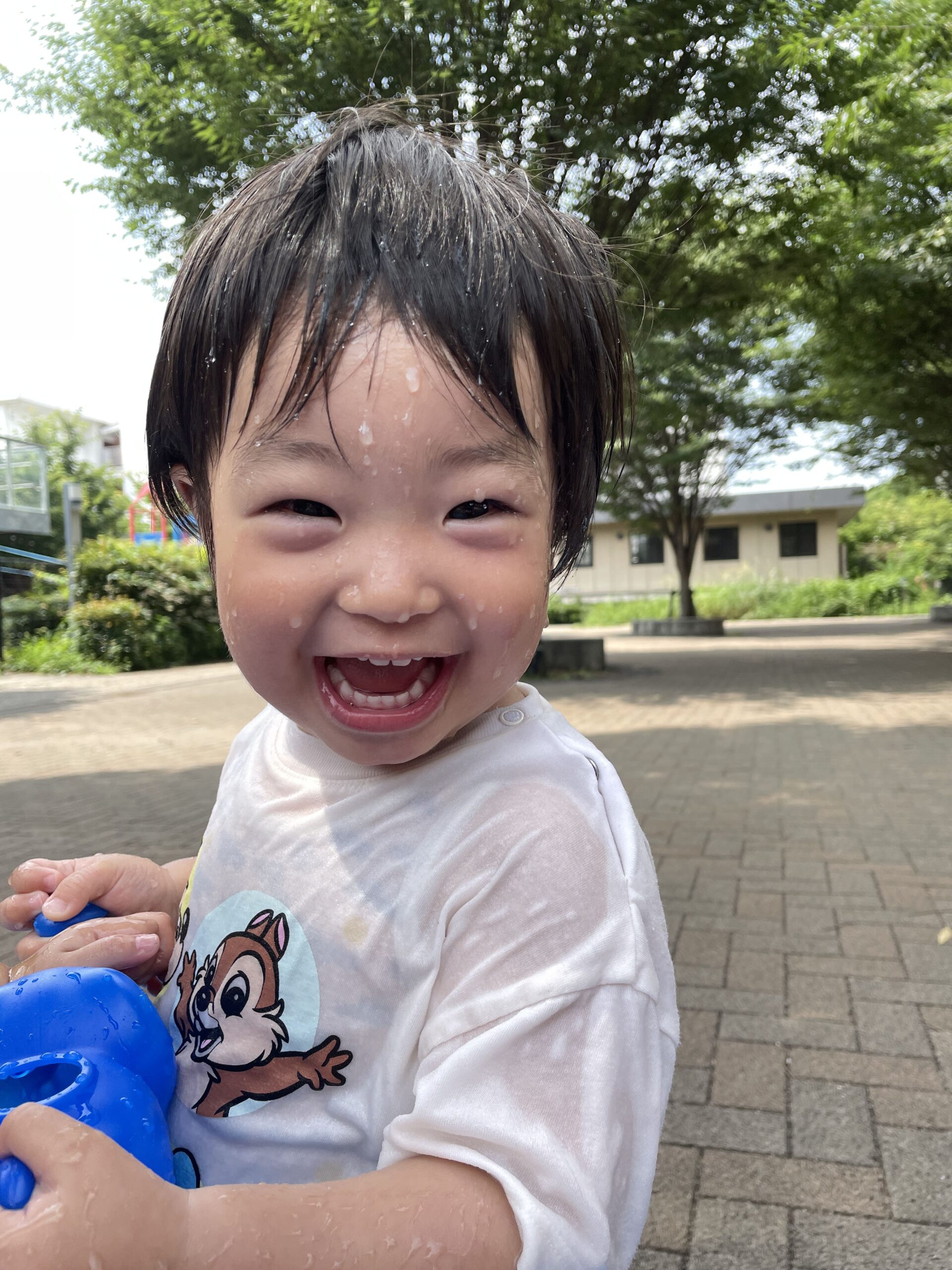 友だちと水しぶきをかけ合いながら、「冷たくて気持ちいいね」「もっとやりたい!」と新しい遊びにどんどん挑戦。