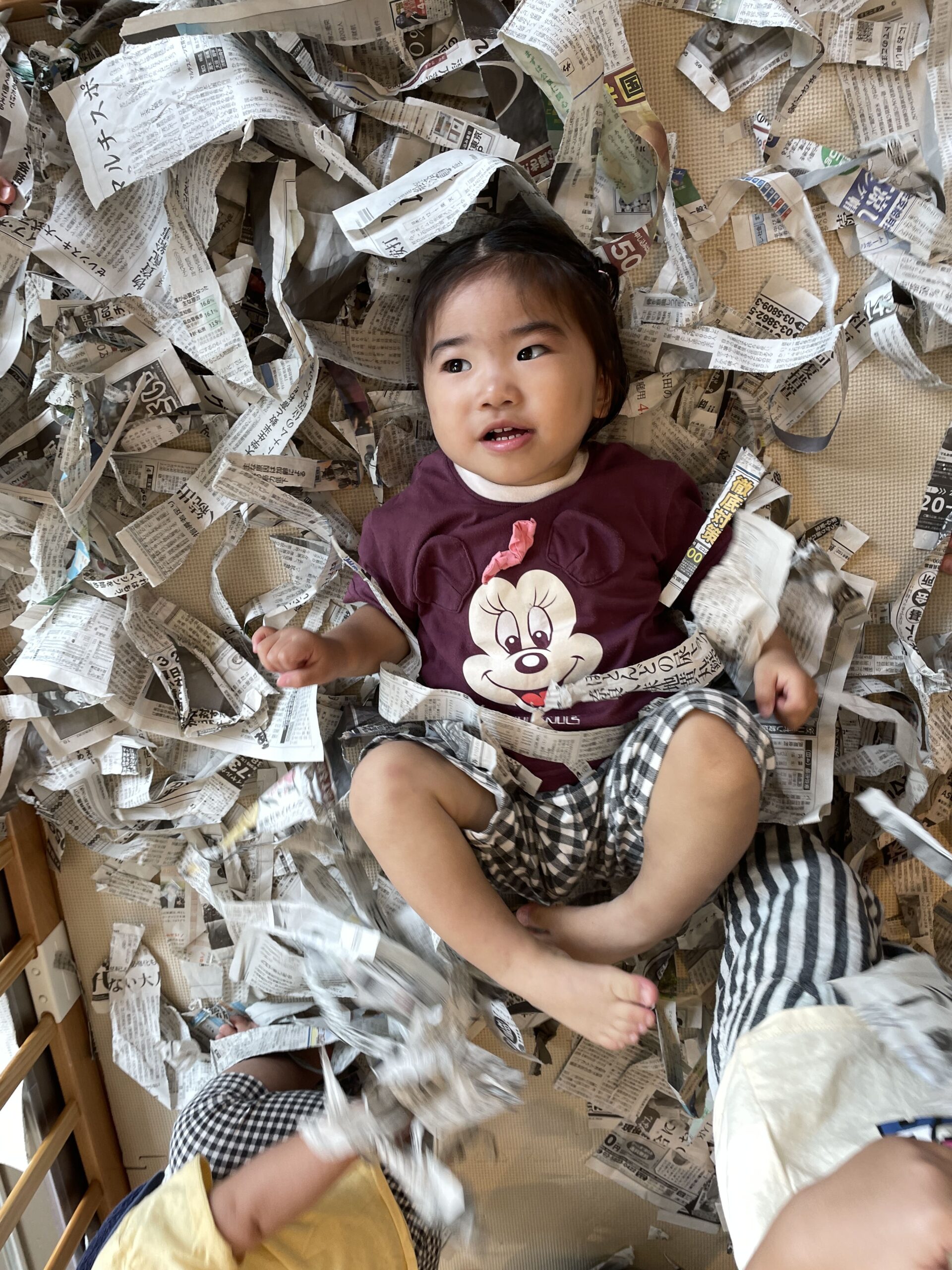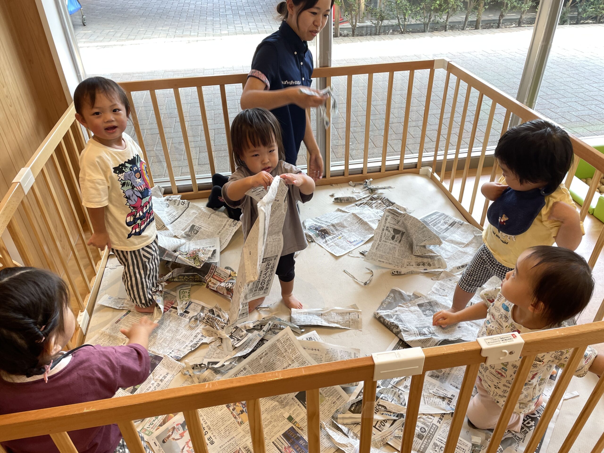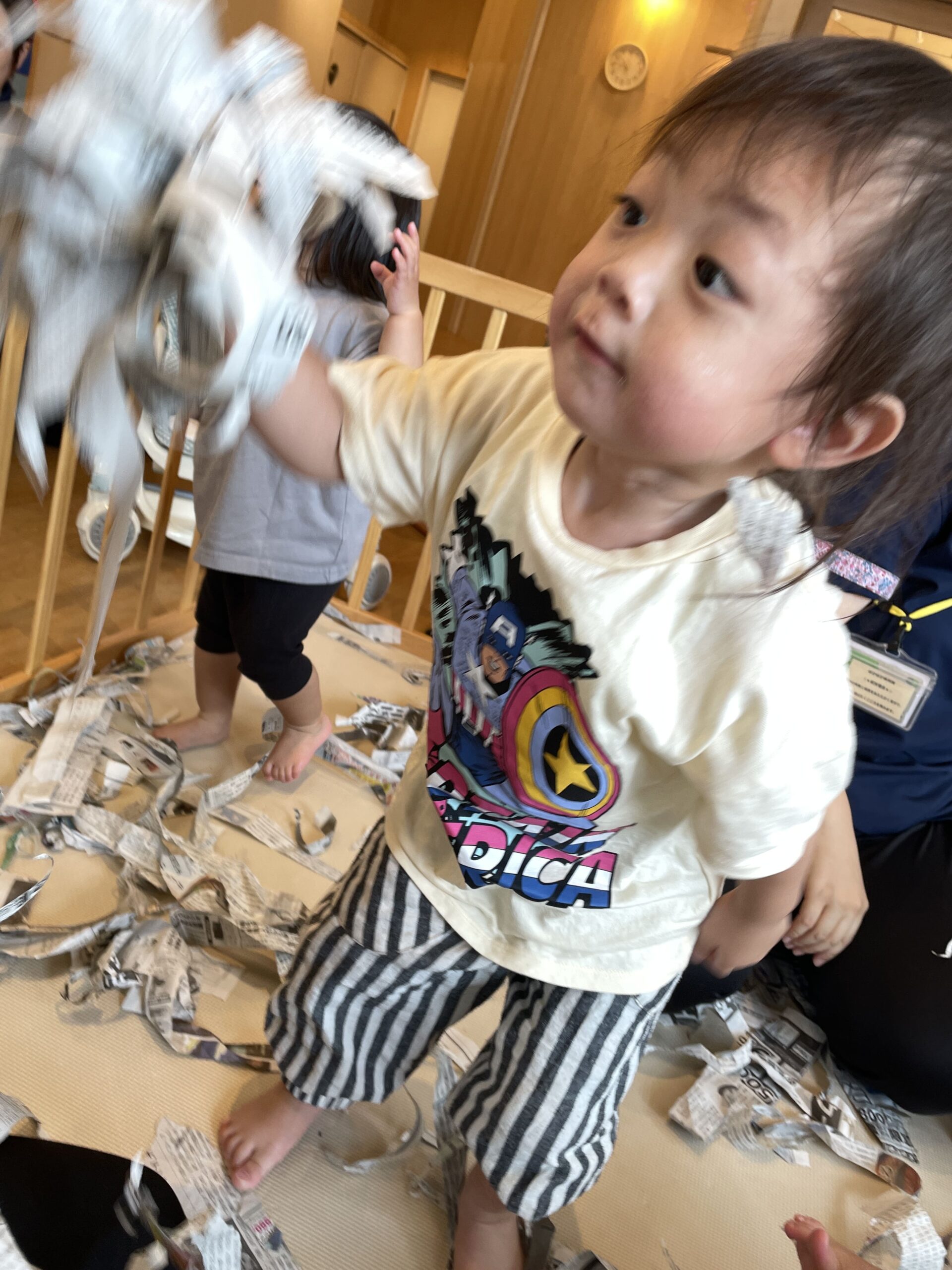 びりびりと新聞紙を割く感触が心地よくて、「先生、見て!!」と披露してくれる子どもたち。