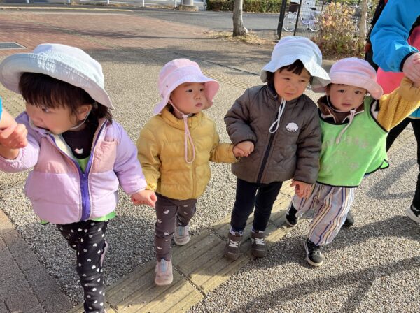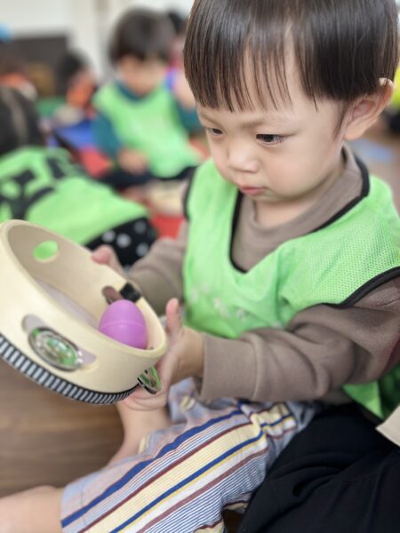 もう一方の1・2歳グループは、こども園へ出向いて豊田園・高倉園と合同の音楽あそび。先生が「今日はお友だちと一緒に、輪っかの上を歩いてみよう」と伝えると、「やってみたい!」と笑顔が弾けます。