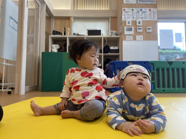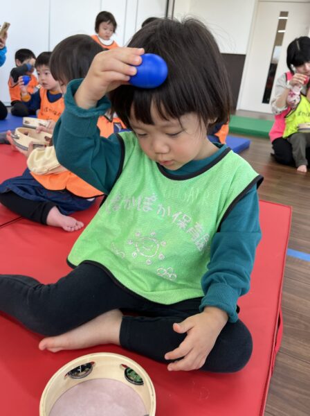 今日は2つのグループに分かれて音楽あそび。0歳のいる1・2歳グループは保育室で、スカーフや楽器を使ってゆったりスタート。先生が「1歳さん、お手本お願いできる?」と声をかけると、「うん!」と元気に前へ。「スカーフをお顔にふわ〜ってしてみるよ」と先生が見せると、1歳さんが「こう?」と優しくまねっこ。0歳さんは先生と一緒にスカーフの端っこを持ち、「ふわふわ〜」と揺らして風を感じます。先生が「見えなくなったら『ばあ!』だよ」と合図すると、「ばあ!」で笑いが広がり、2歳さんが「もっと大きく!」とリクエスト。スカーフの動きを速い・遅いに切り替え、「ゆっくり〜」「はやい!」とテンポの言葉を楽しみました。