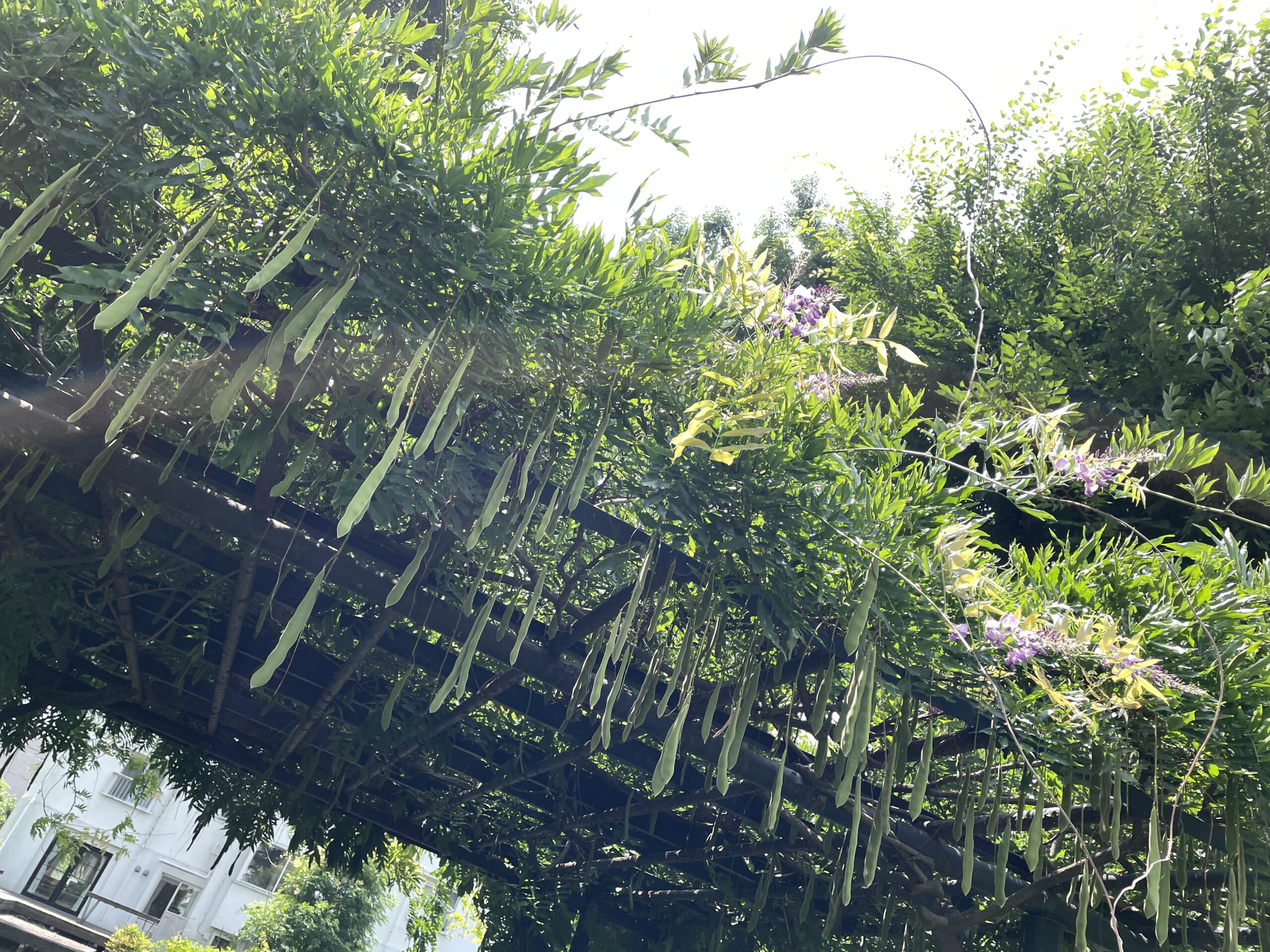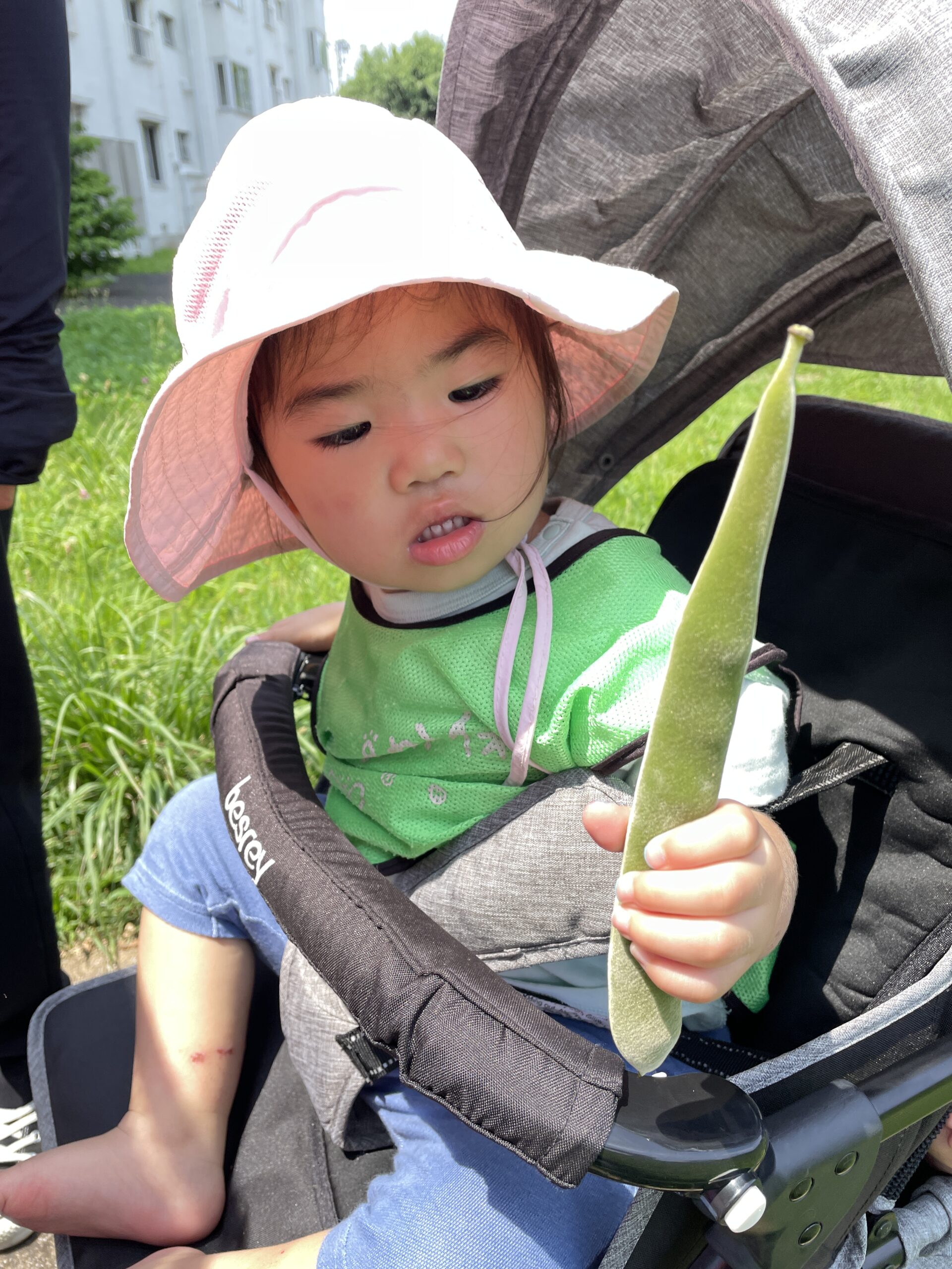 お散歩組ものんびりとテラスの日陰で、ゆるやかな時間を過ごしつつ、ふと先生が「これなあに?」と声をかけると、子どもが藤の花の“豆”を発見!